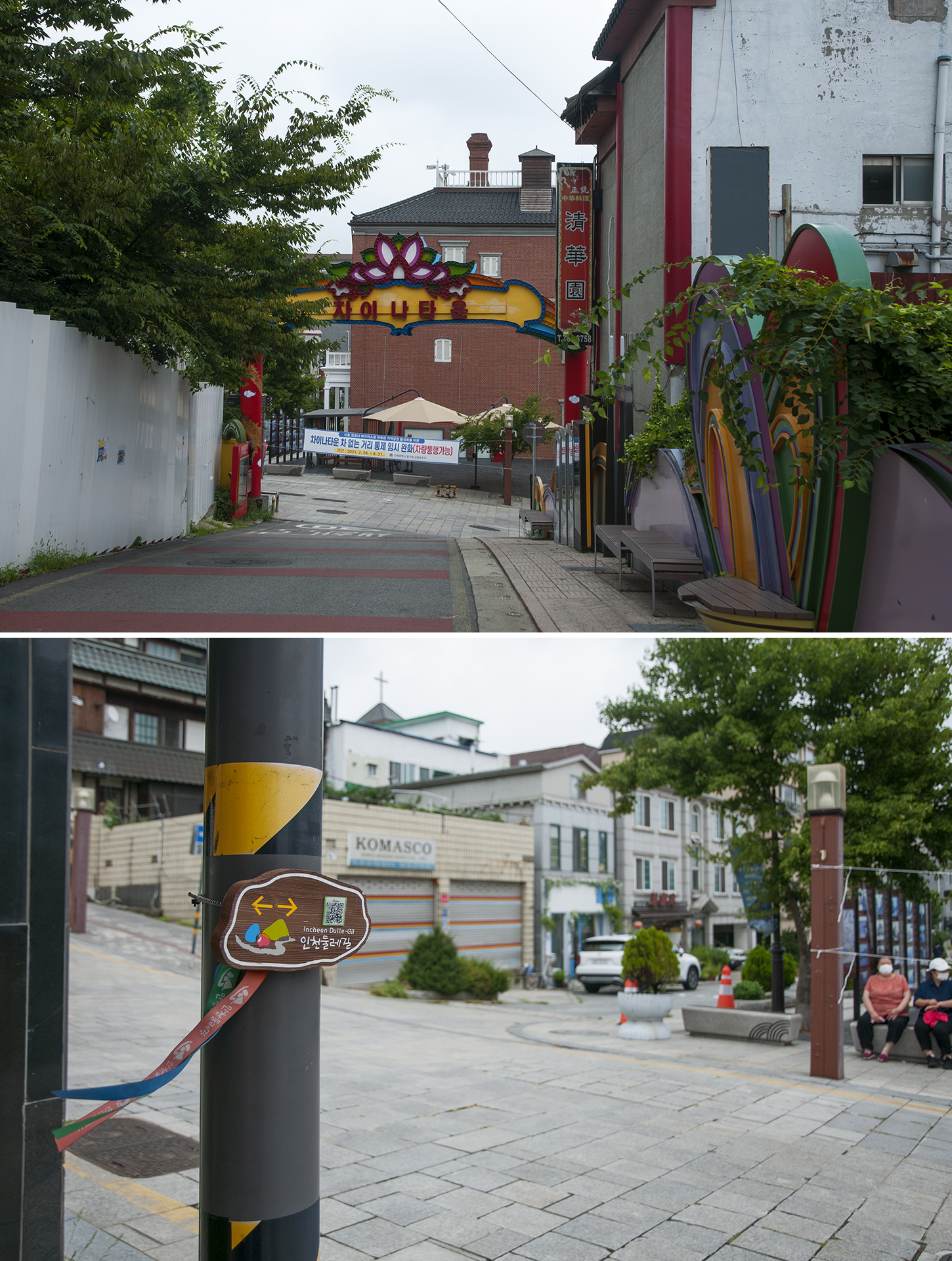 애관극장이 보이는 지점에서 좌측 귀빈 골목으로 둘레길 로고가 안내를 하고 있다.