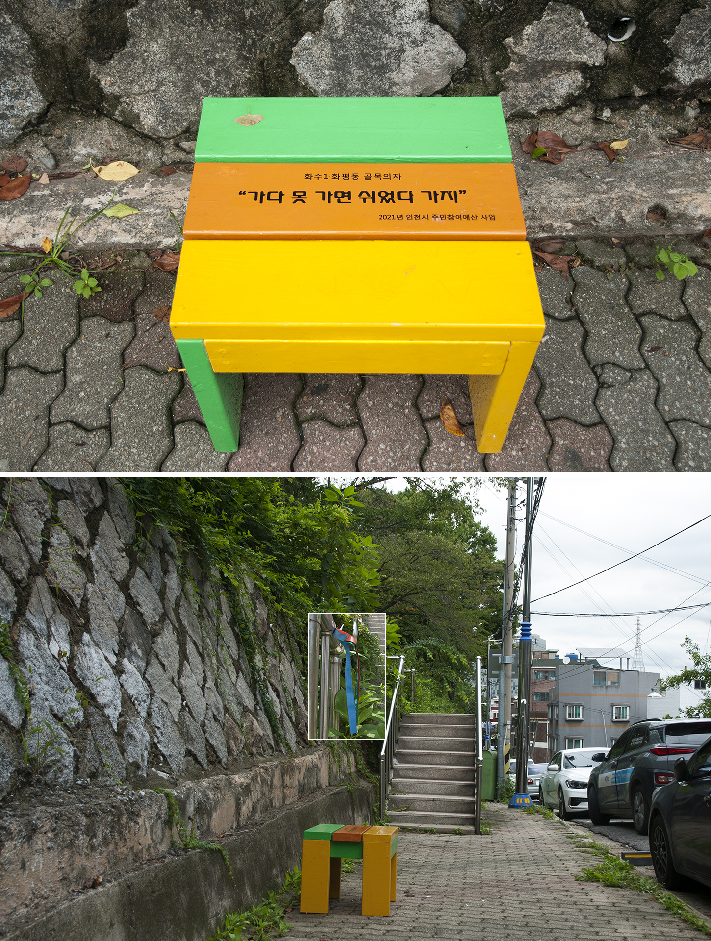 정겨운 글귀가 적혀있는 골목의자 몇개를 지나 계단이 보이면 이곳으로 올라 공원으로 진입하면 된다.