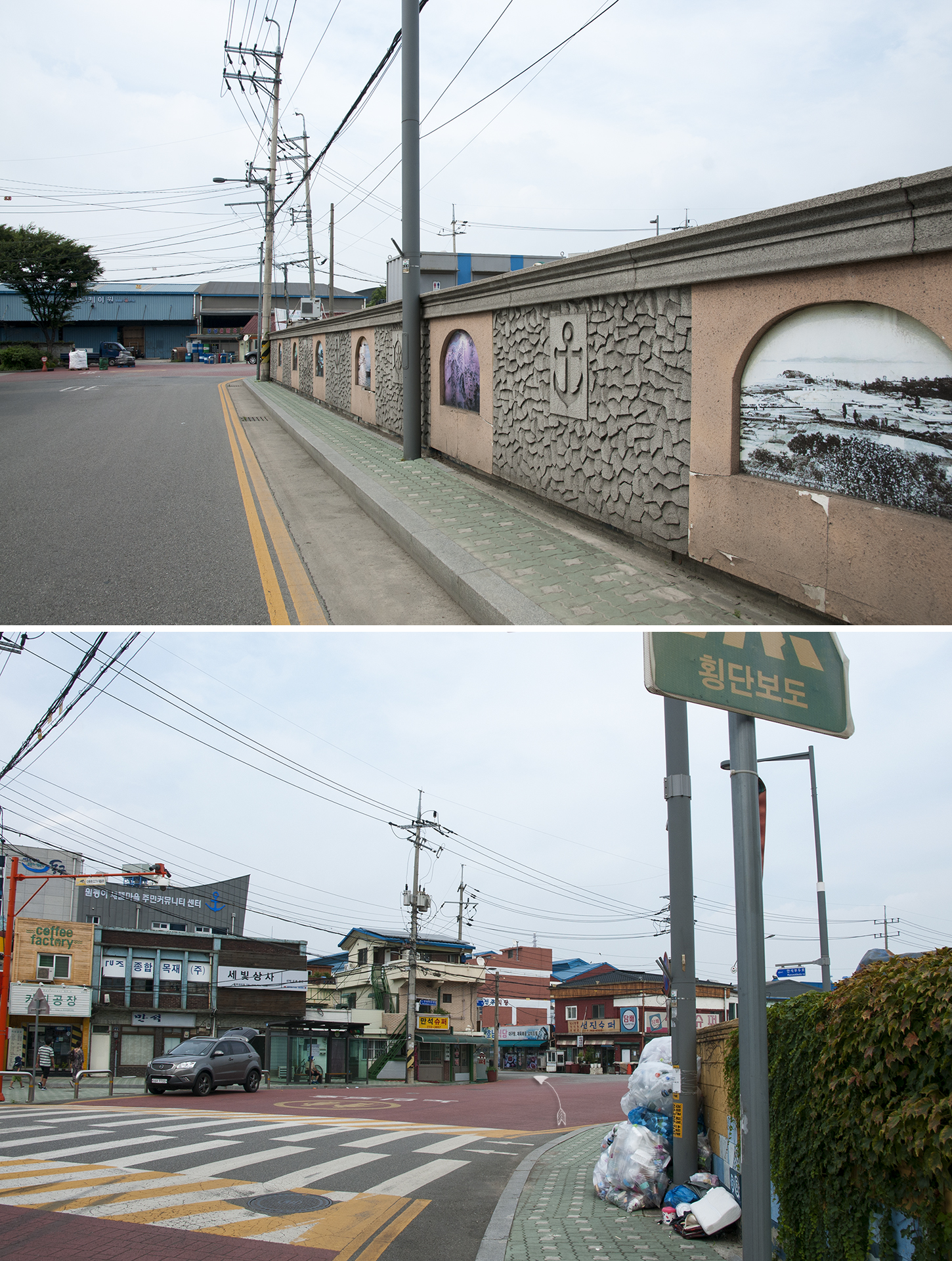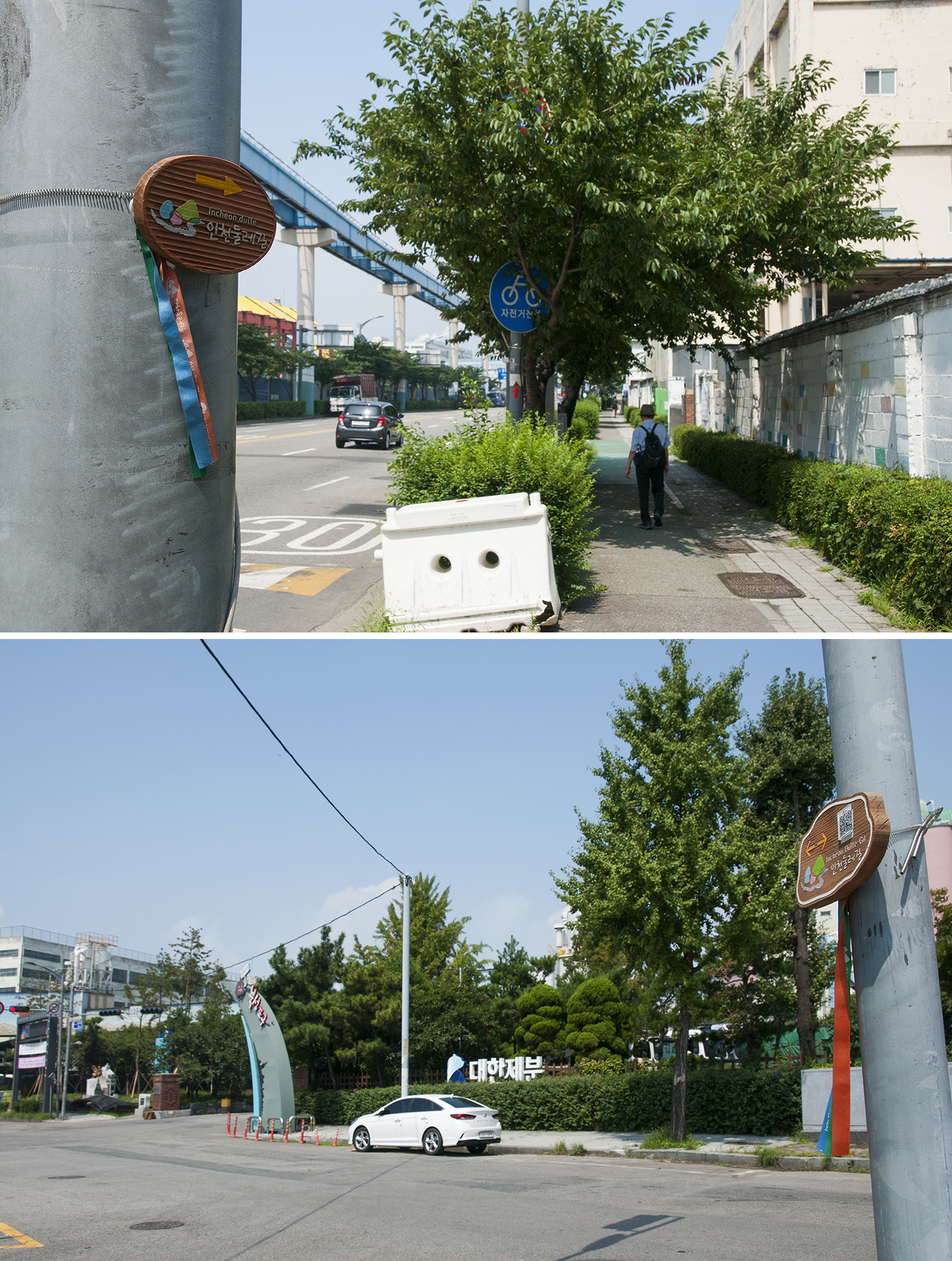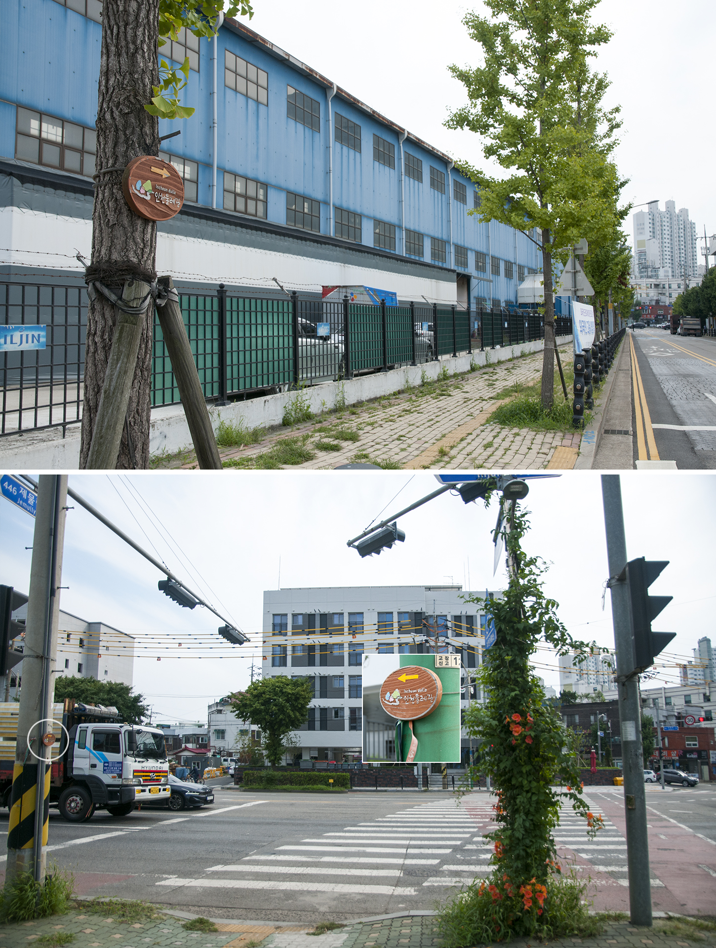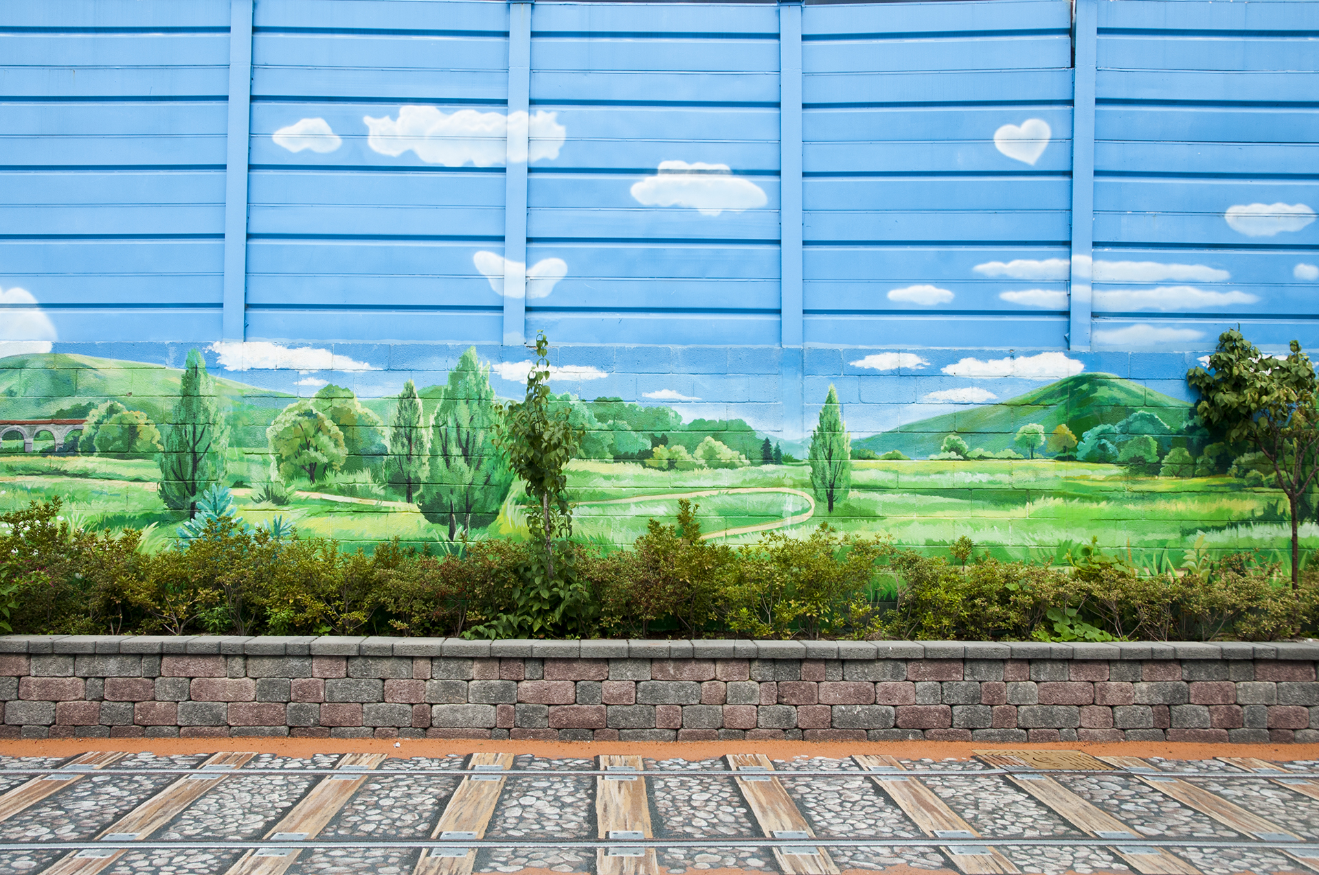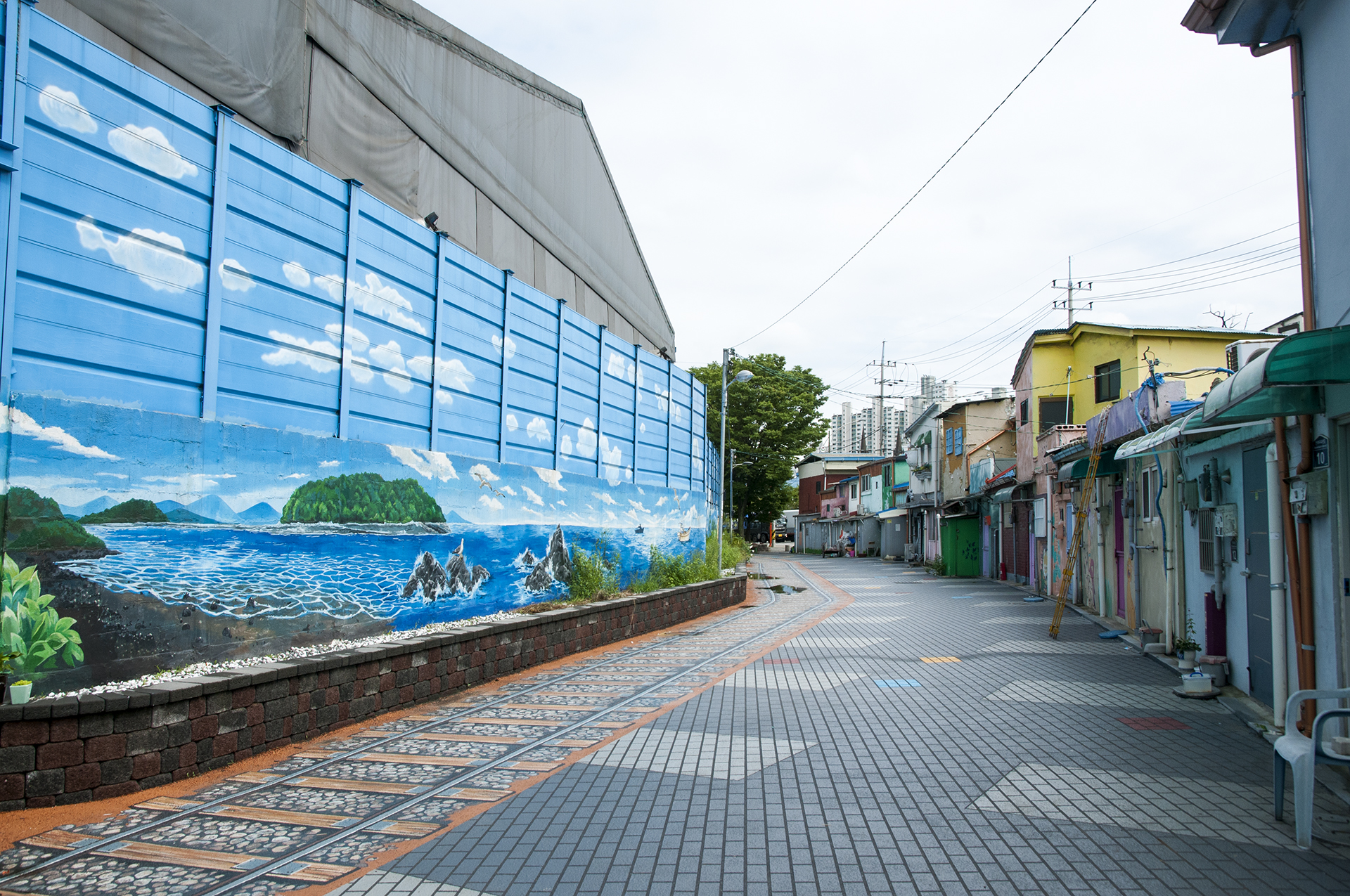 길게 뻗은 기찻길 옆으로 높게 설치되어 있던 공장의 회색빛 방음벽을 푸르게 변화시켜 놓았다.