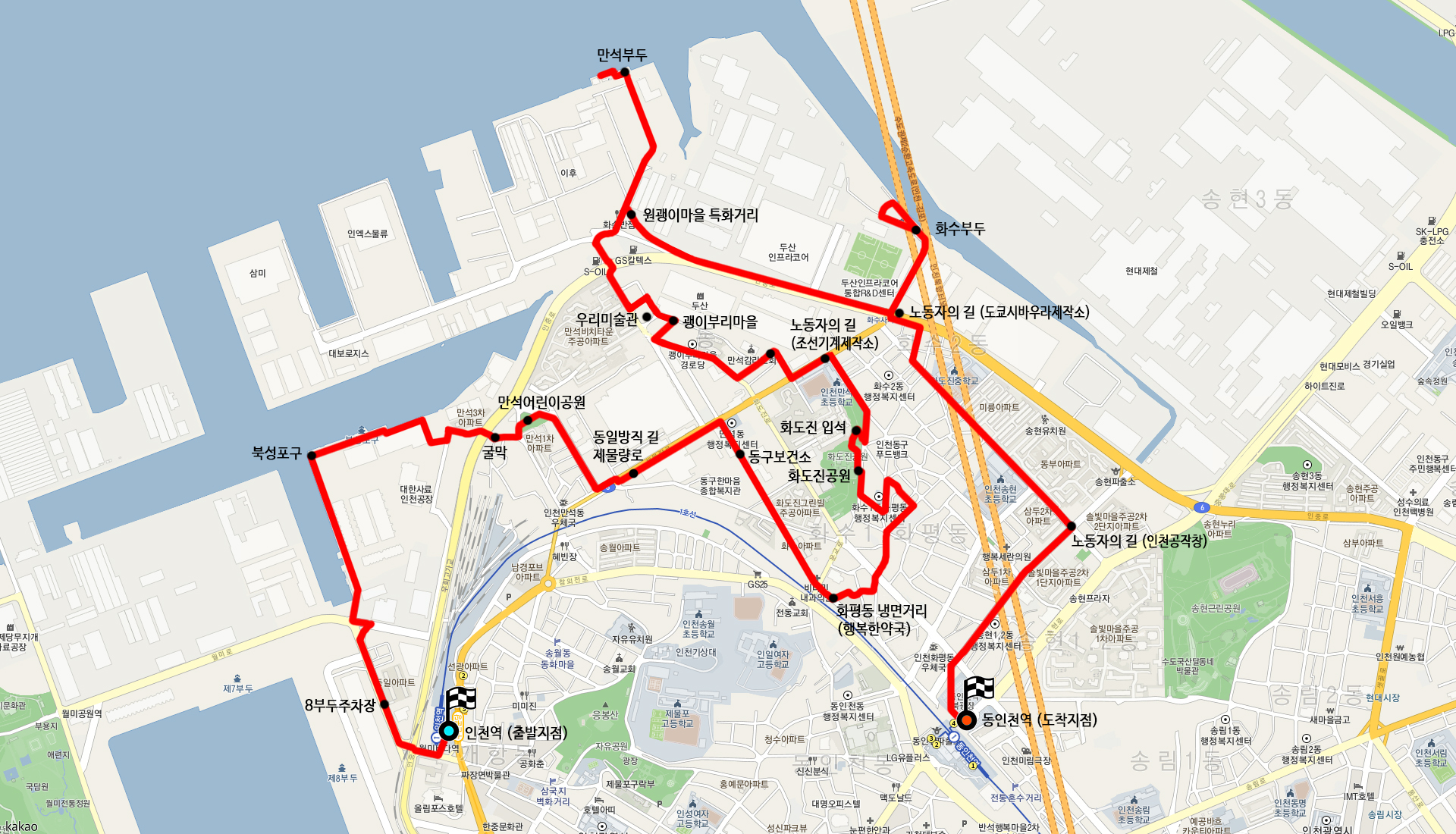 인천역 - 북성포구 - 굴막 - 동일방직(제물량로) - 화평동냉면거리 - 화도진공원 - 만석감리교회 - 괭이부리마을 - 우리미술관 - 만석부두 - 원괭이마을 특화거리 - 화수부두 - 동인천역 북광장