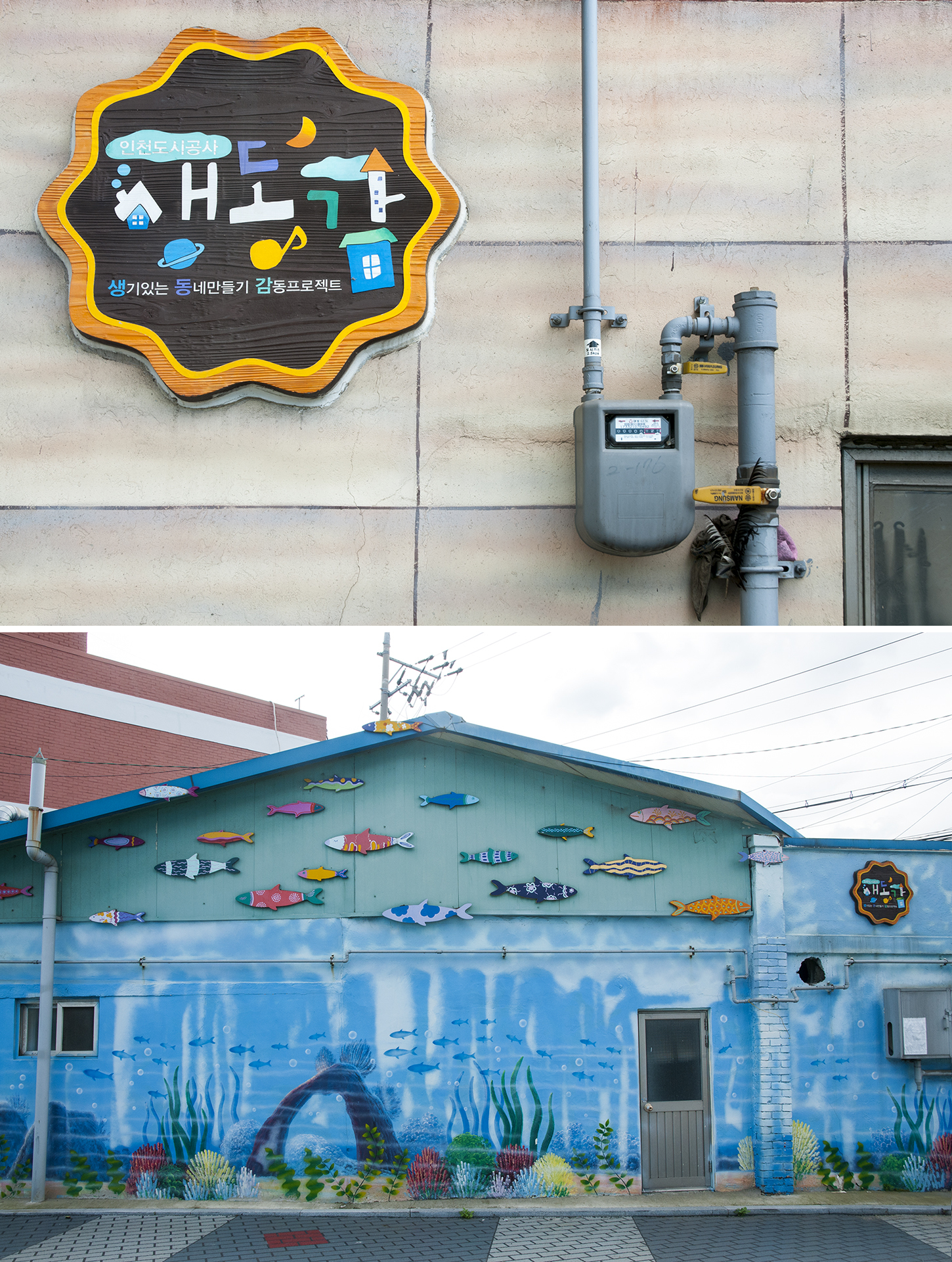 보기만해도 시원해지는 바다를 표현한 벽화가 길게 이어진다.