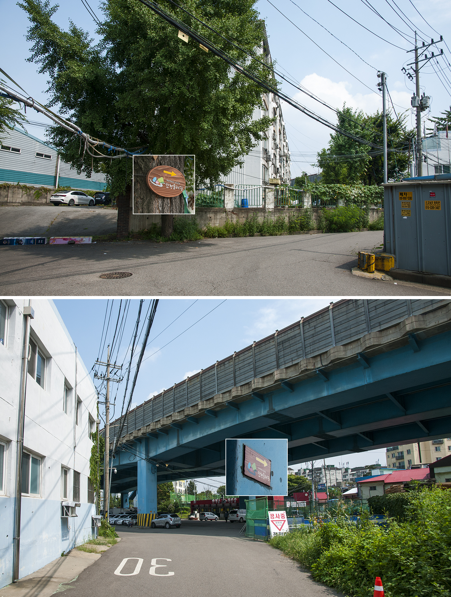 만석3차 아파트 앞에서 나무에 걸린 로고를 따라 우측으로 간뒤 우회고가교 아래를 통과해야 한다.