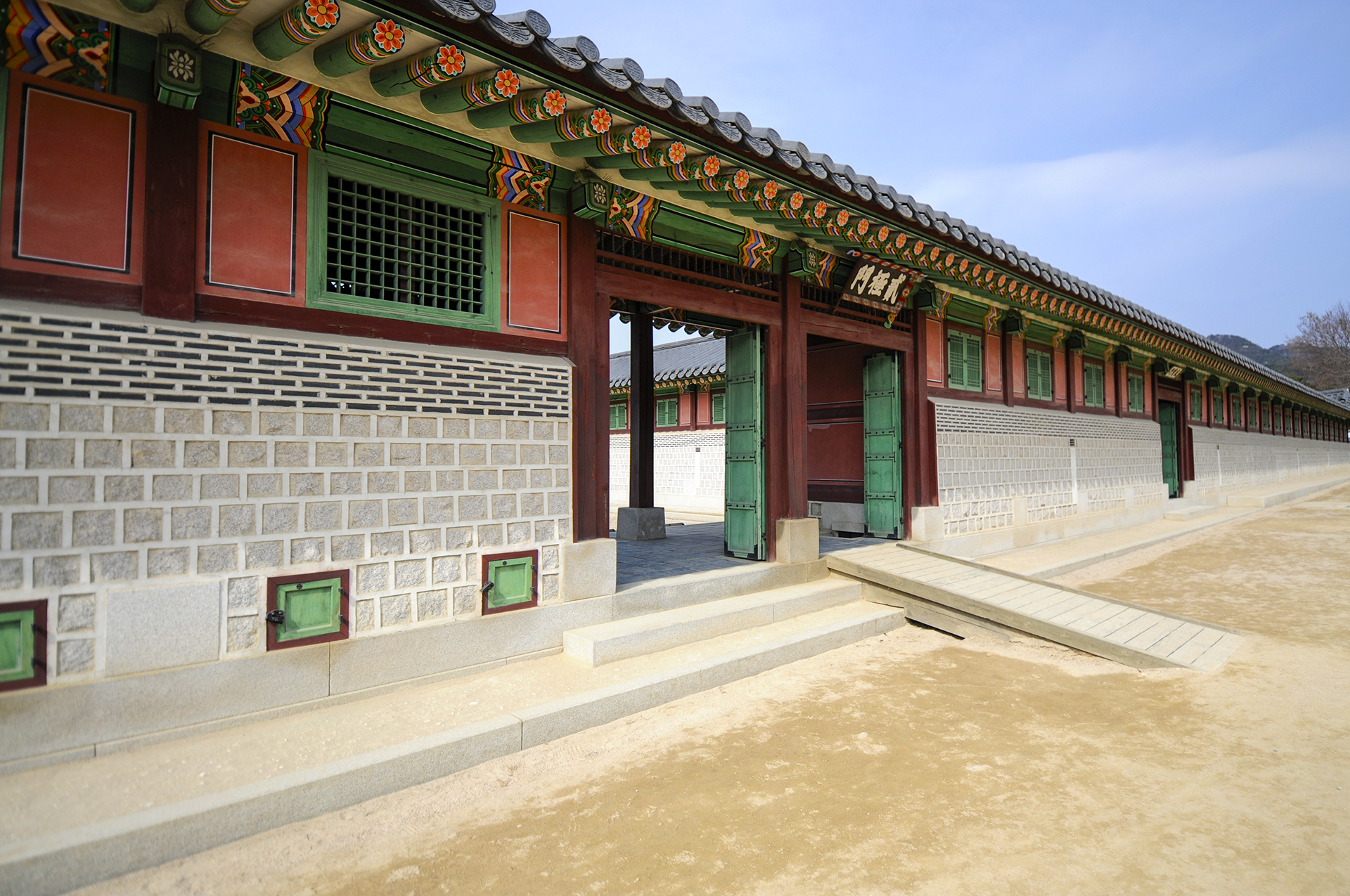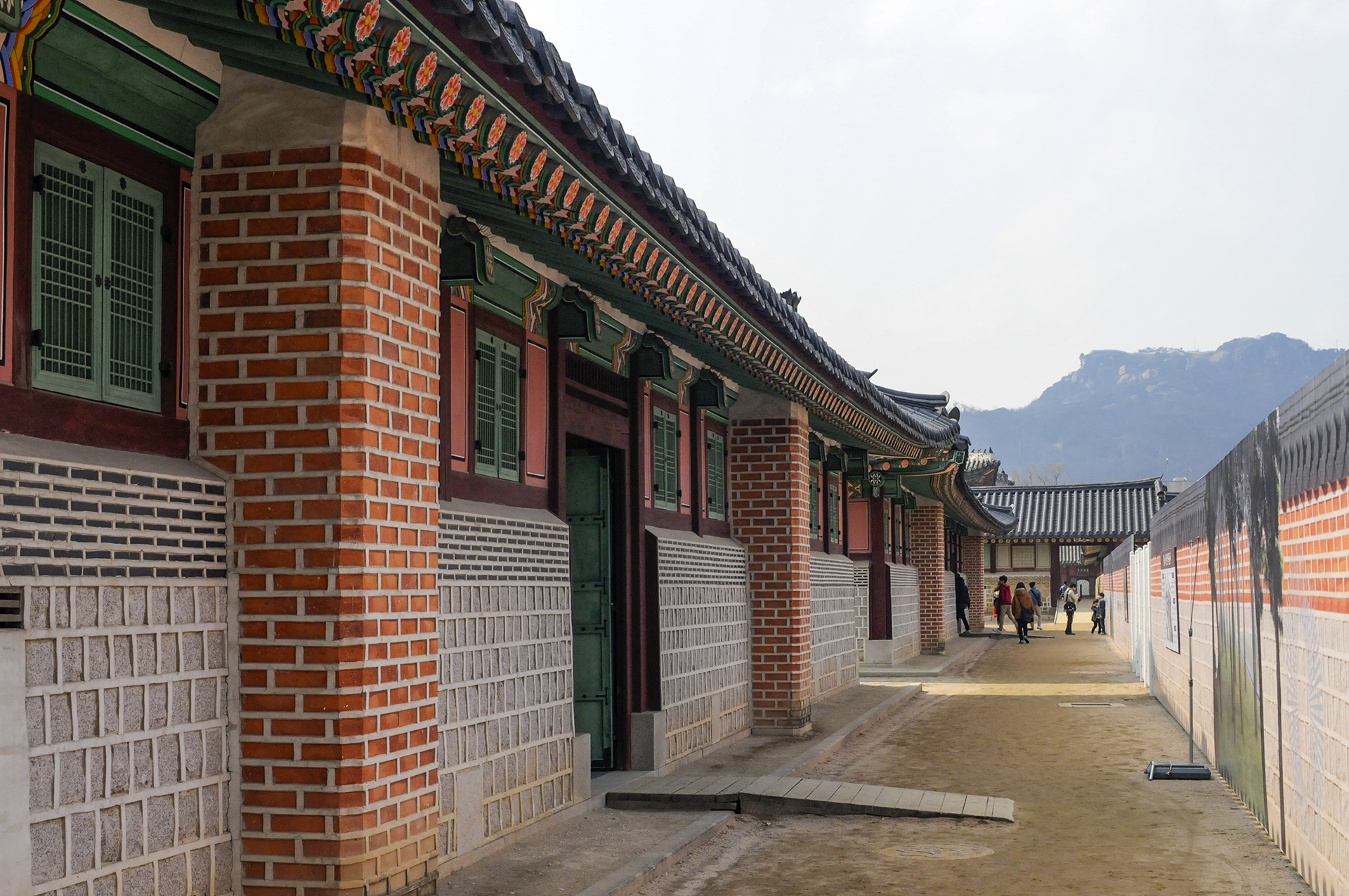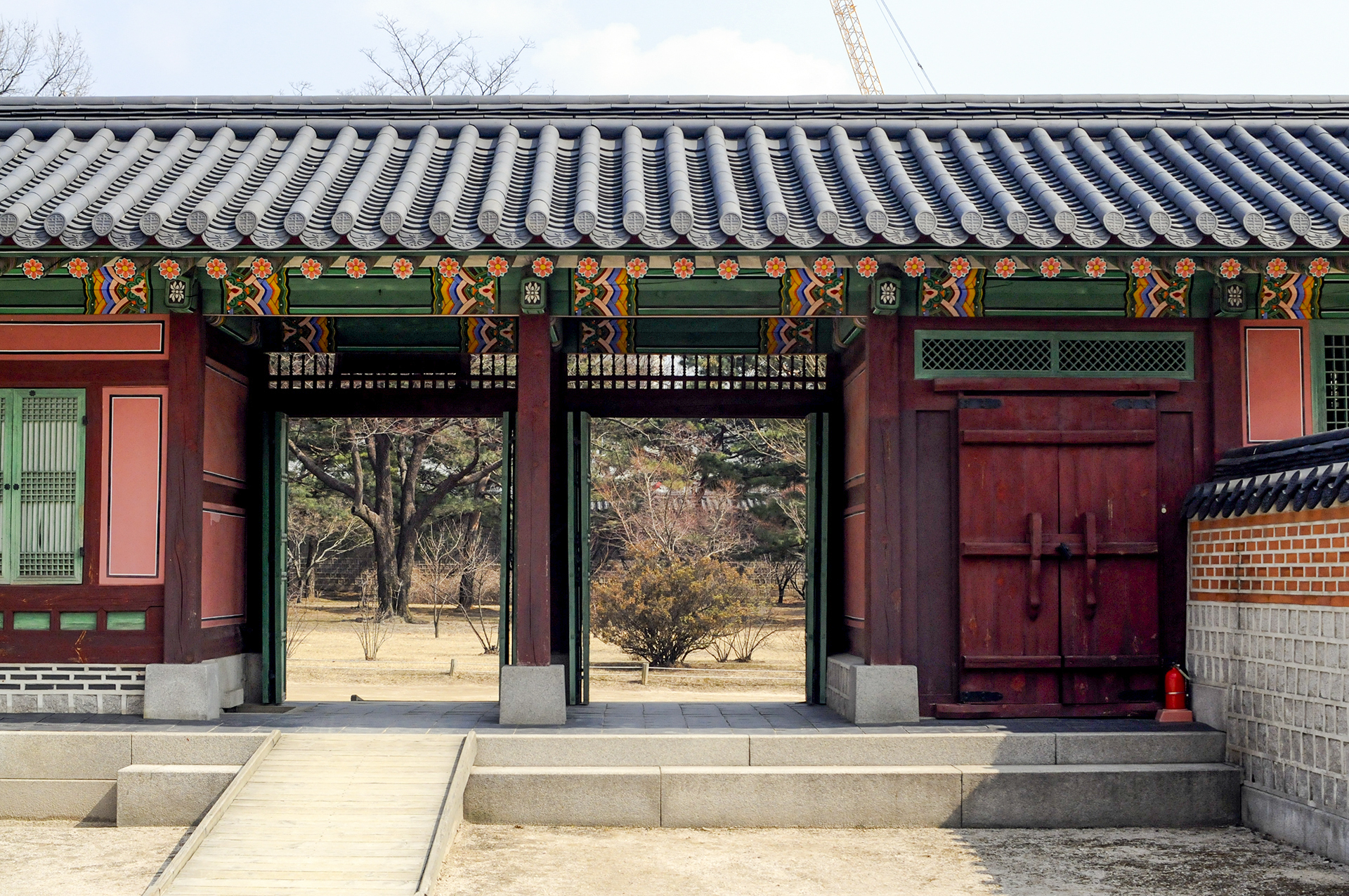 오른쪽에 공사중인 담장은 옛 소주방 권역 복원공사를 위해 막아놓은 것이다. 정면에 보이는 행각의 문은 사정전으로 통하는 연태문이다.