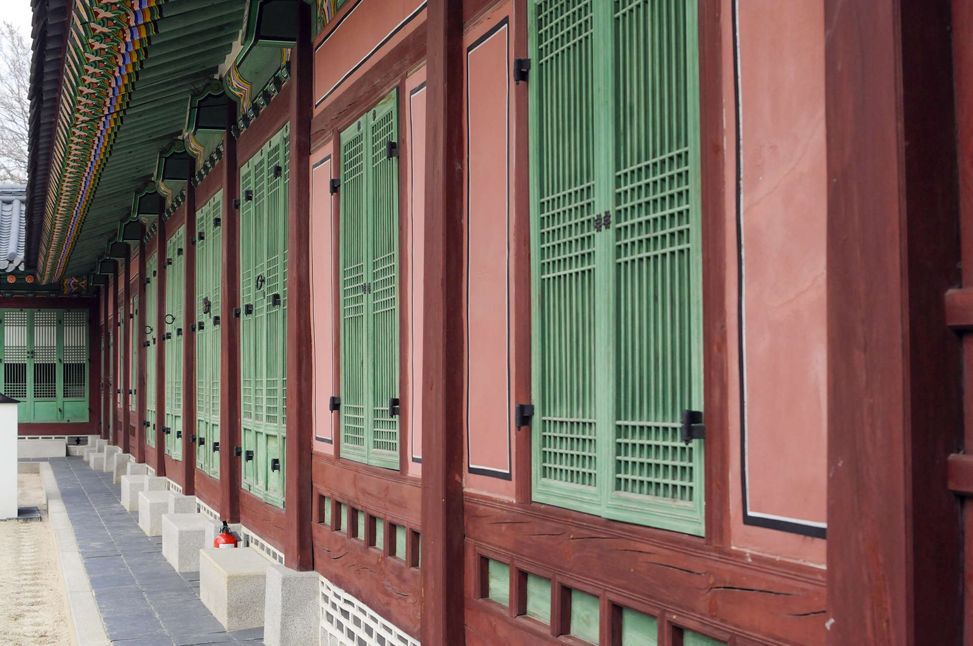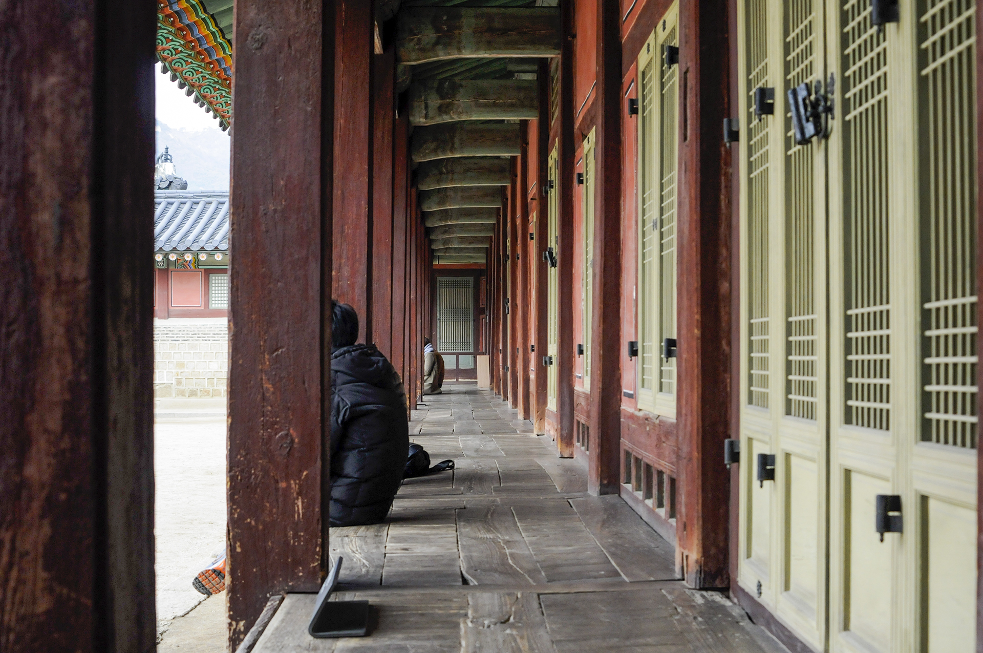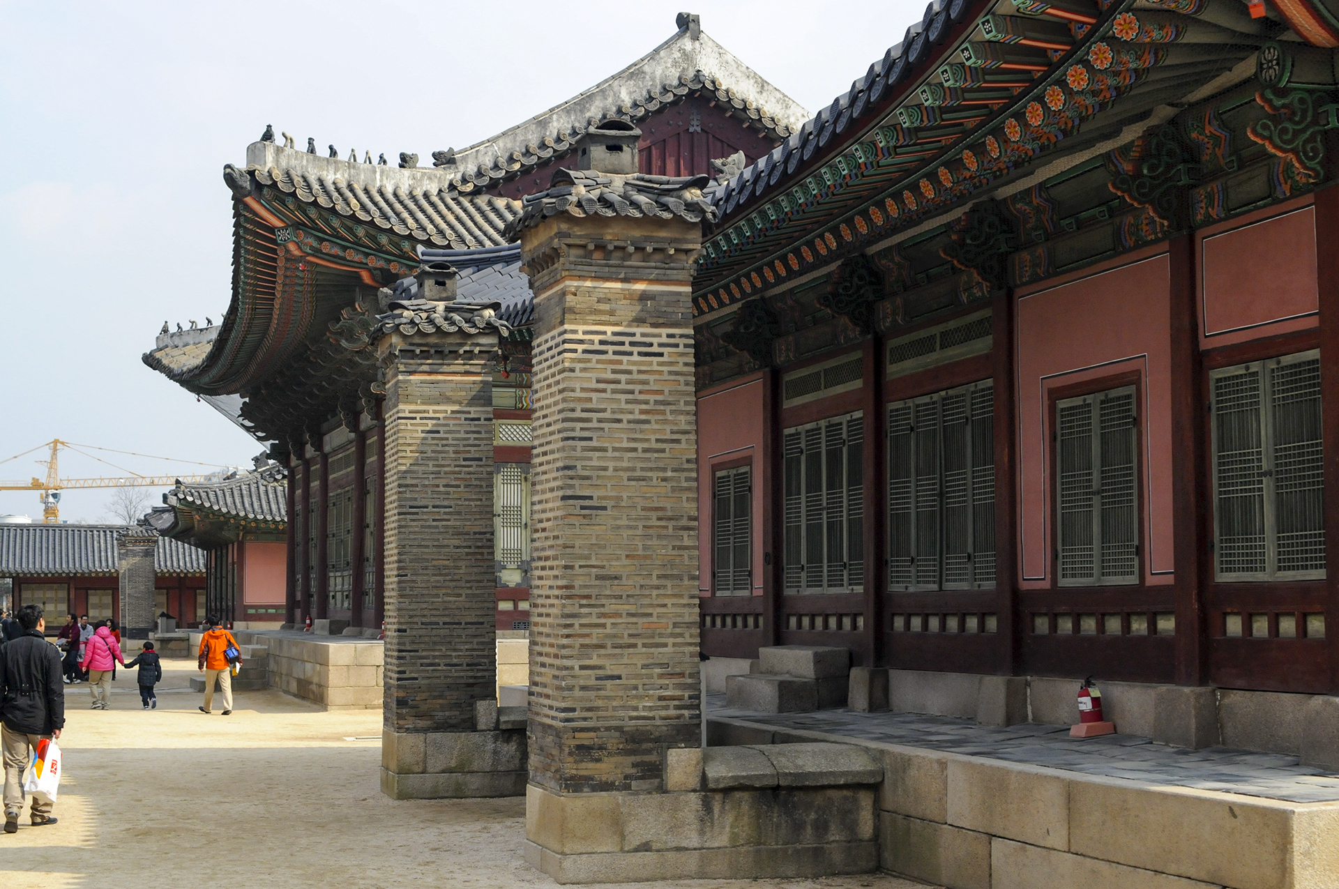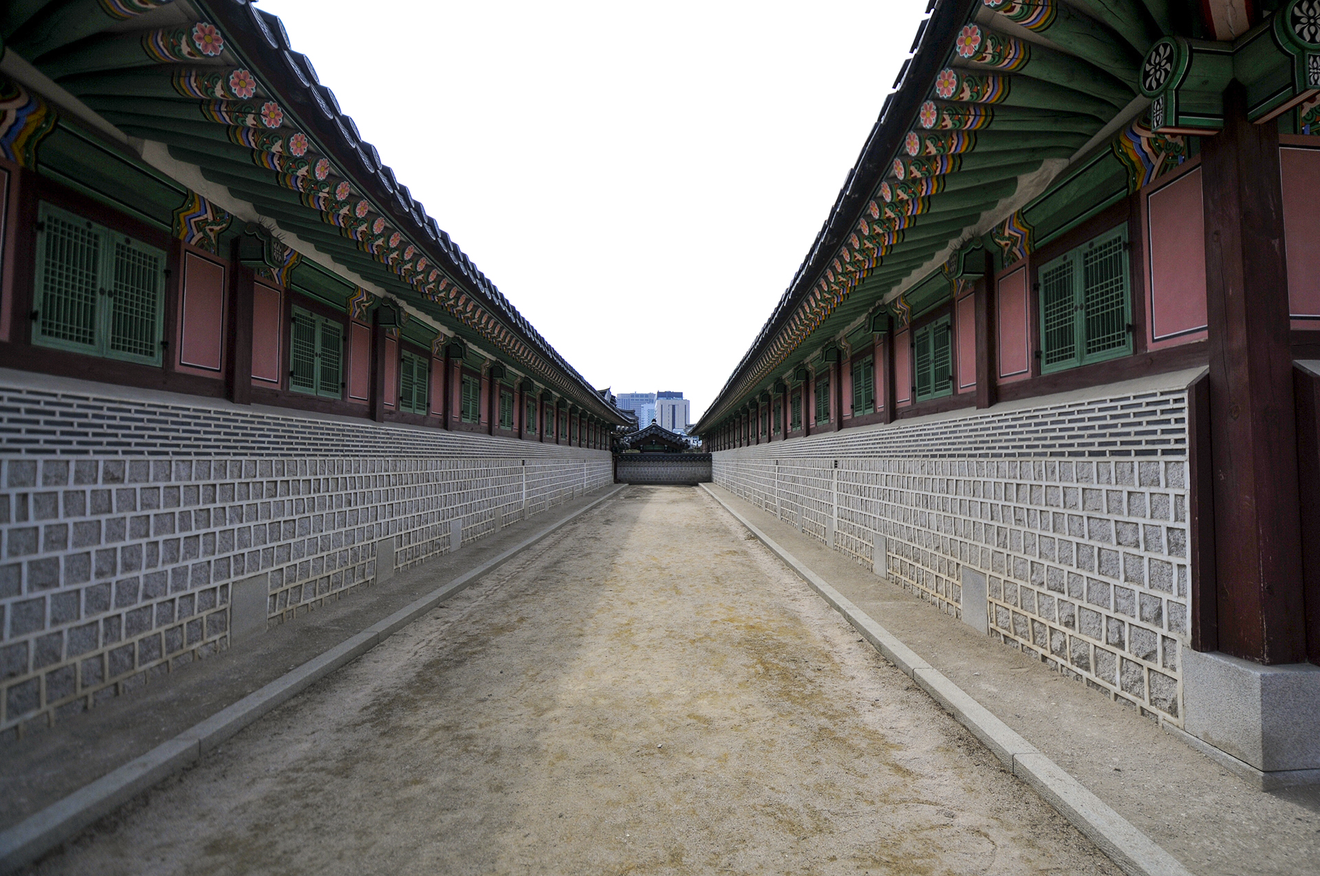 오른쪽에 공사중인 담장은 옛 소주방 권역 복원공사를 위해 막아놓은 것이다. 정면에 보이는 행각의 문은 사정전으로 통하는 연태문이다.