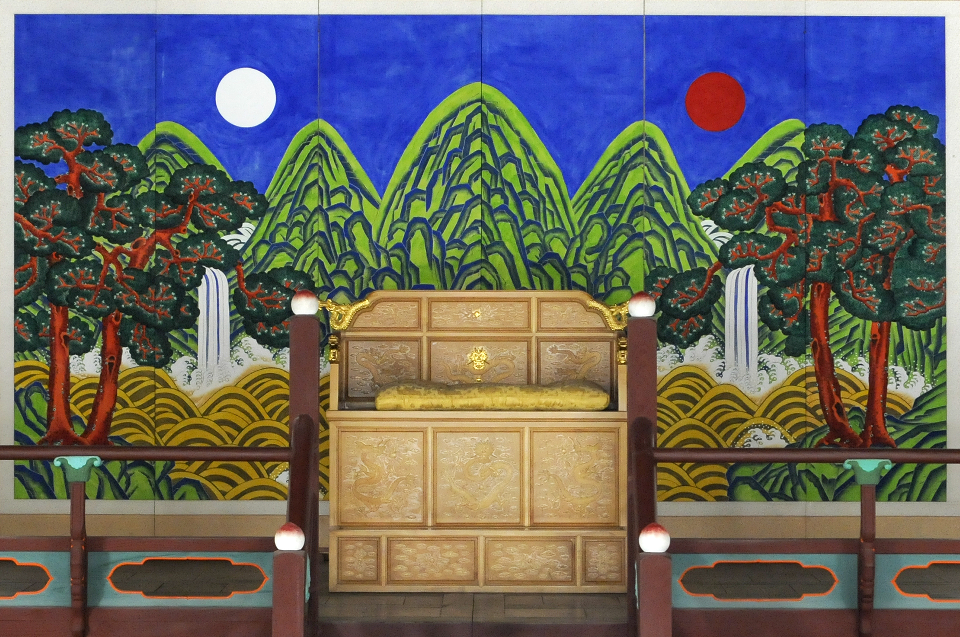 어좌 뒤의 일월곤륜도는 다섯 개의 큰 산봉우리 아래 소나무와 폭포, 파도를 그려넣었고, 상단 좌우에는 해와 달을 넣어 좌우 균형을 갖추었다. 일월도, 일월오봉산도, 일월오악도라고도 한다.