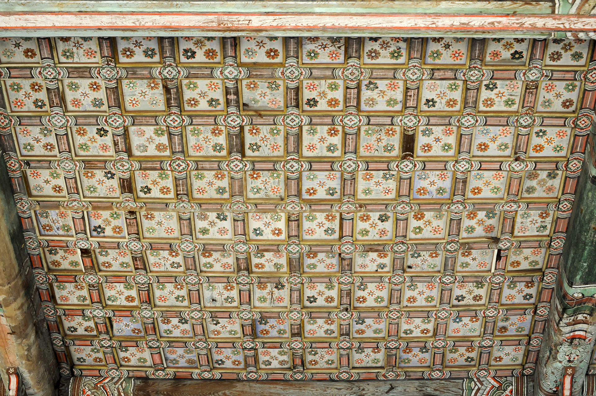 천장은 화려한 무늬의 우물천장으로 장식되어 있다.