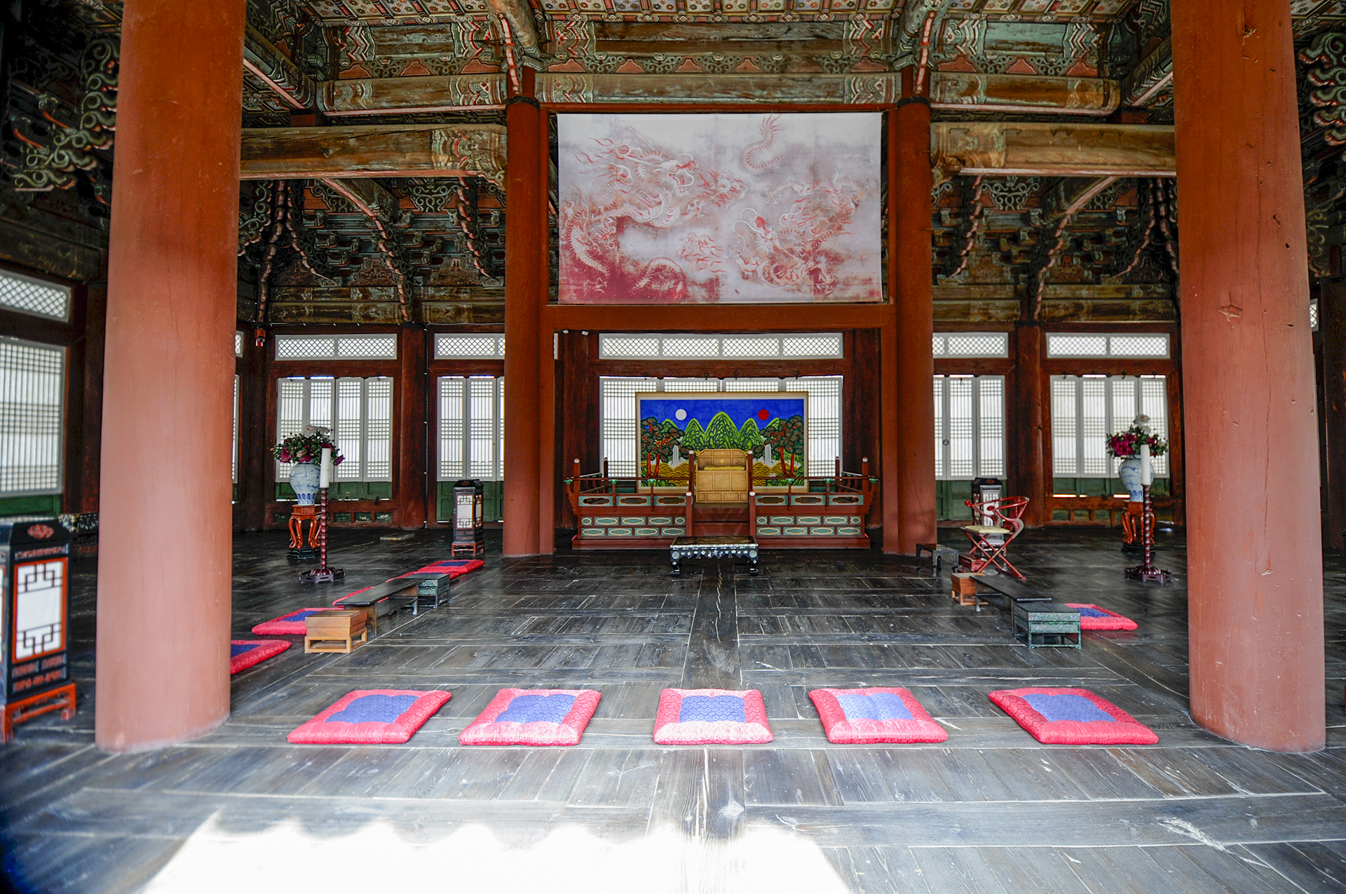 어좌 위로는 두 마리의 용이 붉은색 여의주를 중심으로 배치된 운룡도라는 그림이 그려져 있는데, 진품은 국립고궁박물관에 있다고 한다.