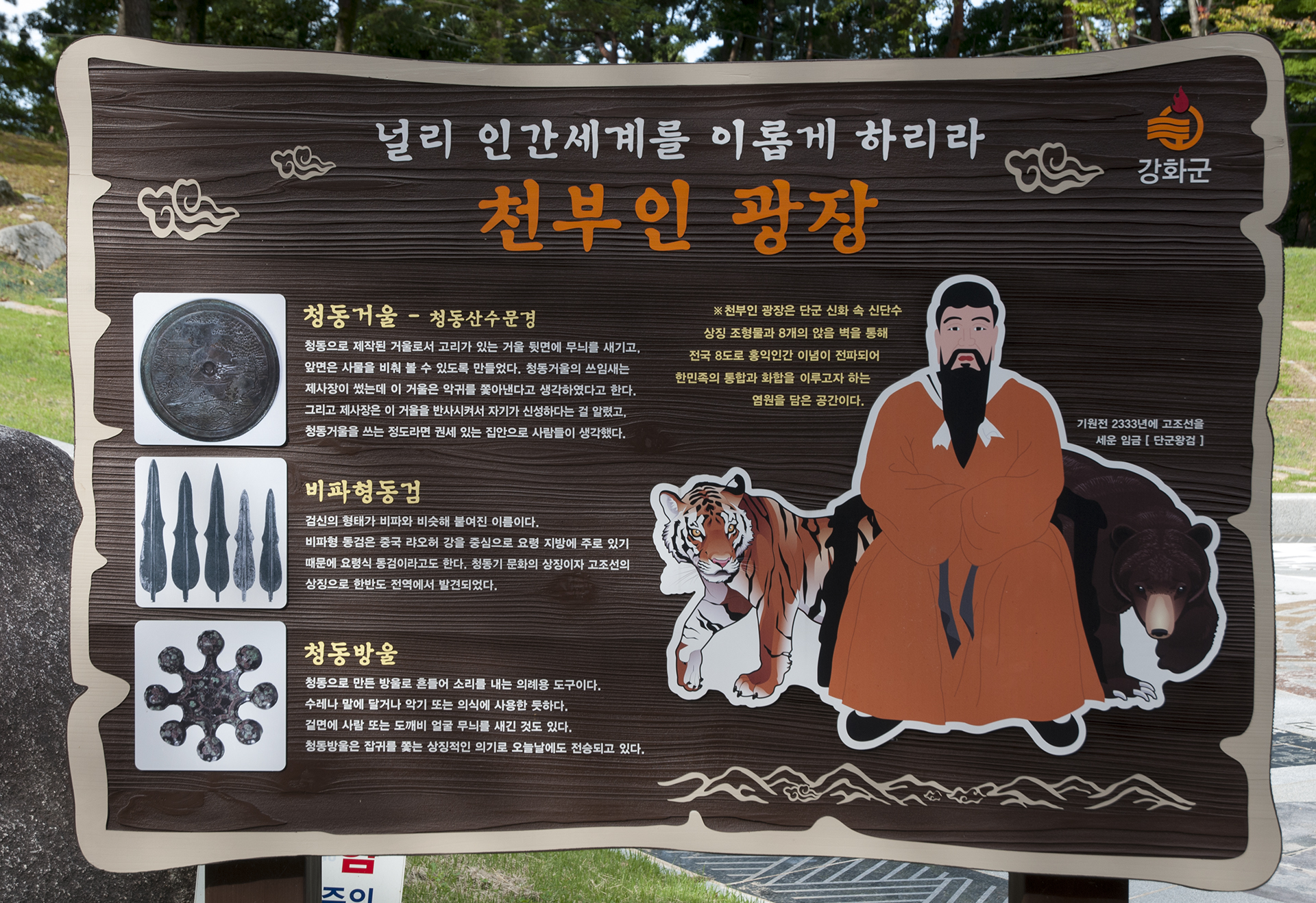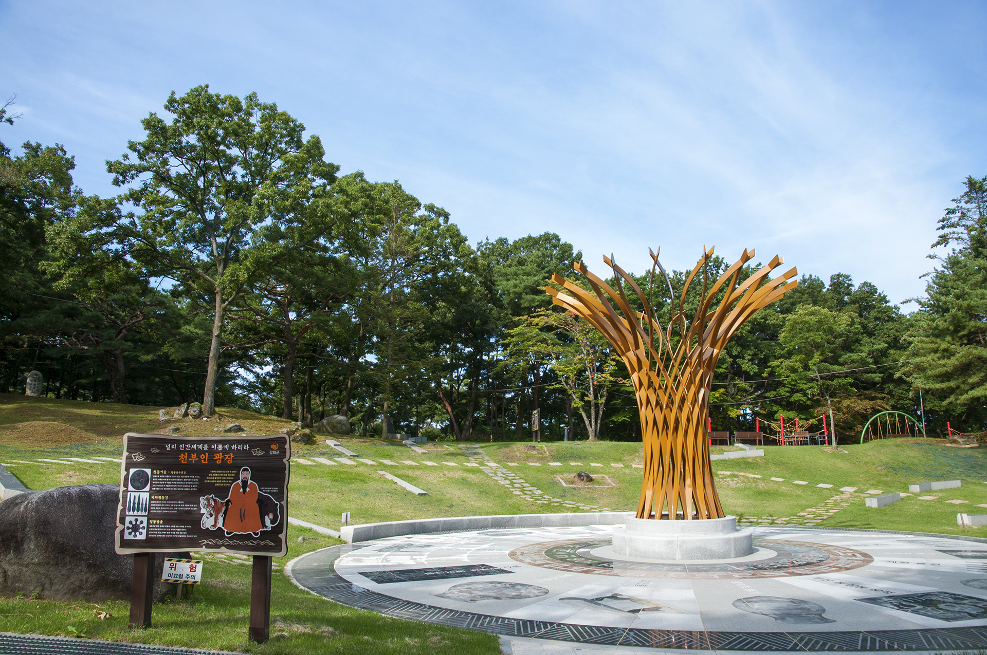 천부인 광장은 단군 신화 속 신단수 상징 조형물과 8개의 앉음 벽을 통해 전국 8도로 홍익인간 이념이 전파되어 한민족의 통합과 화합을 이루고자 하는 염원을 담은 공간이다.