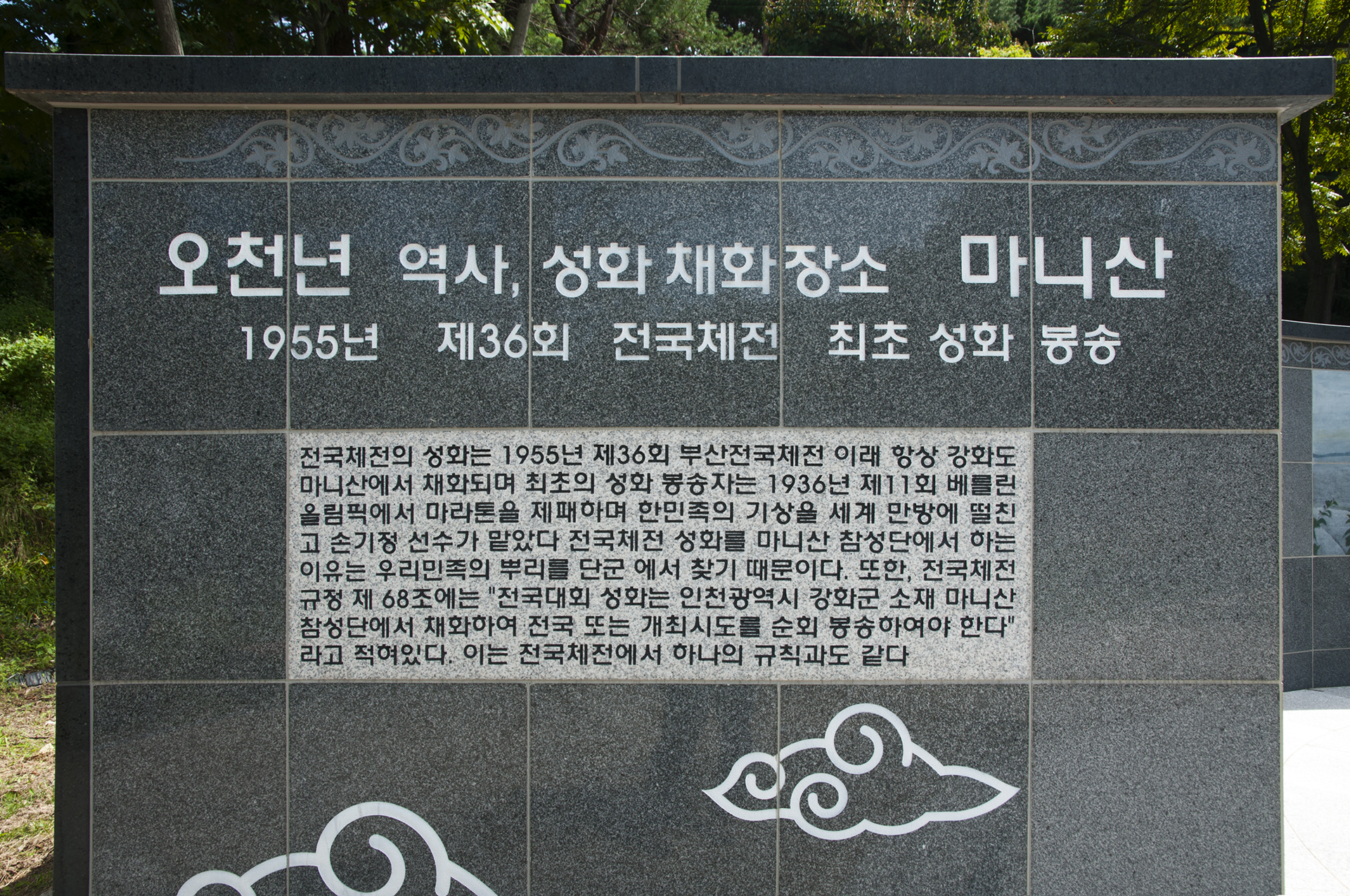 성화는 강화 마니산에서 채화되는데 최초의 성화 봉송자는 1936년 제11회 베를린 올림픽에서 마라톤을 제패한 손기정 선수였다.