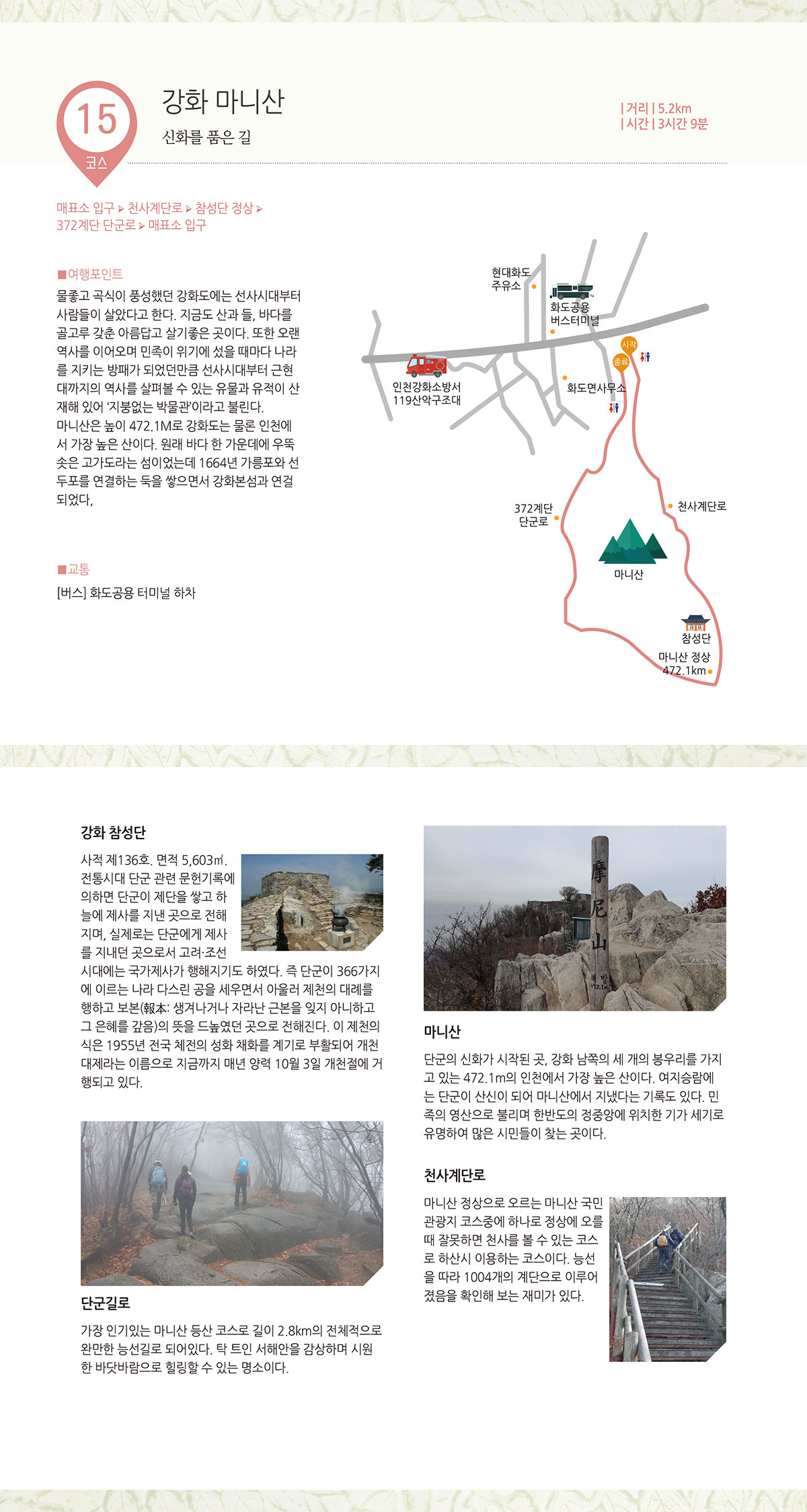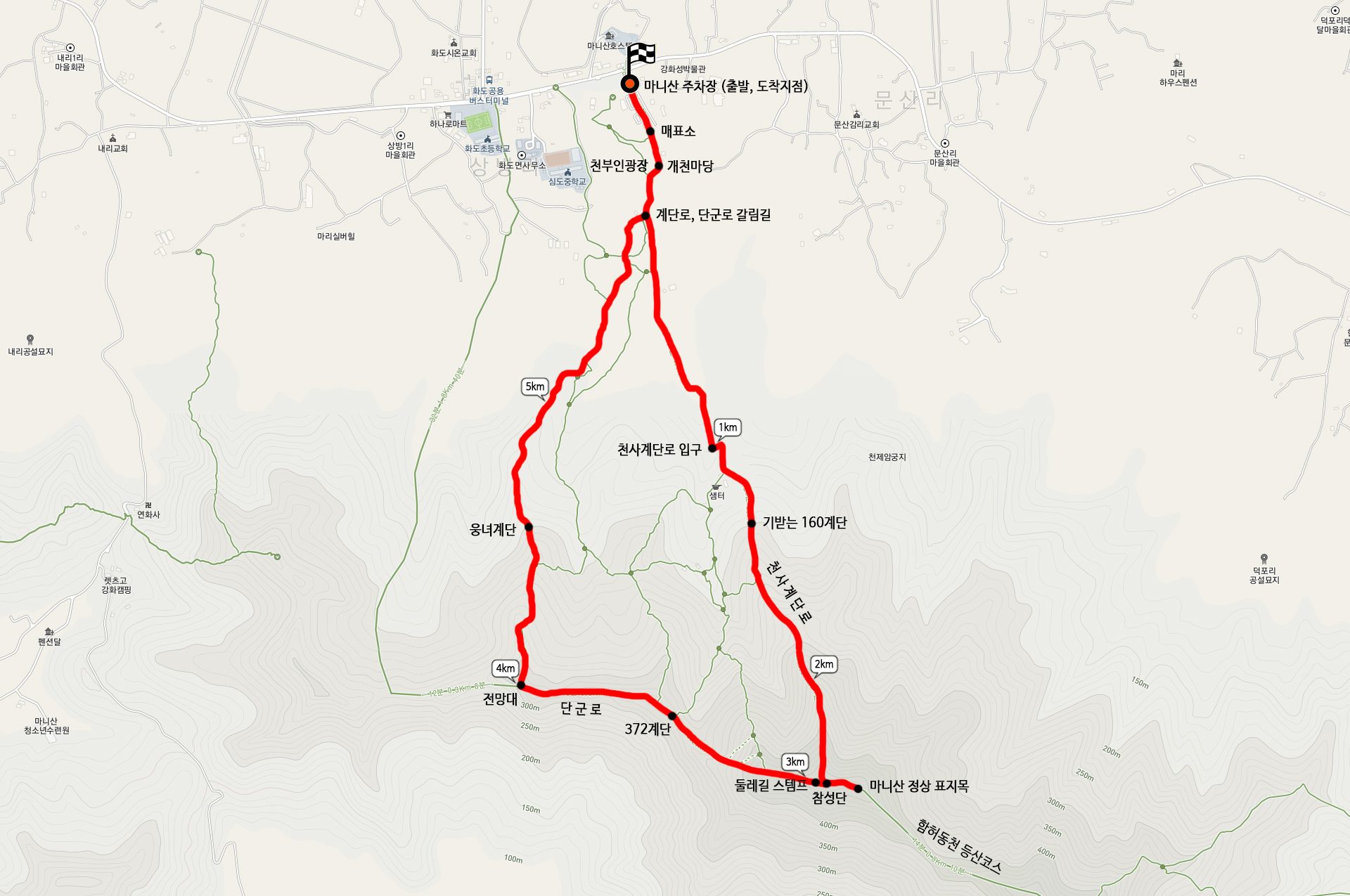 마니산 매표소 - 개천마당 - 천사계단로 - 참성단 - 마니산정상 표지목 - 단군로 - 372계단 - 전망대 - 웅녀계단 - 매표소