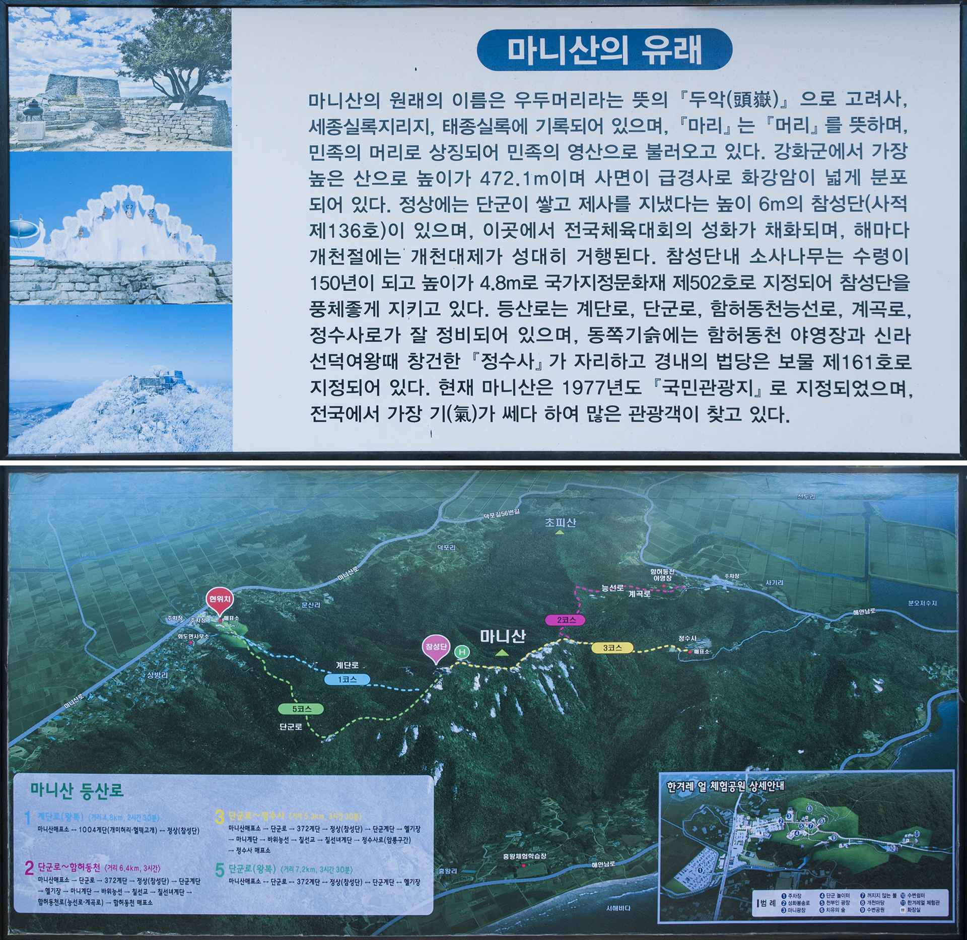마니산은 472.1m로 명산들에 비하면 그리 높은 산은 아니지만 민족의 영산으로 불리는만큼 주말이면 관광객들이 많이 찾는 산이다.