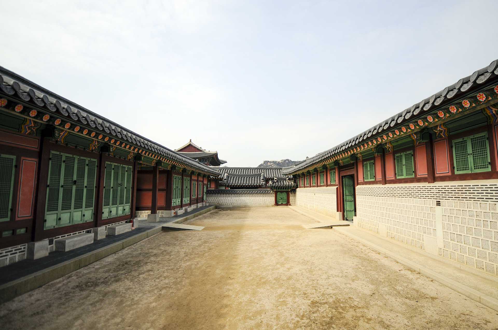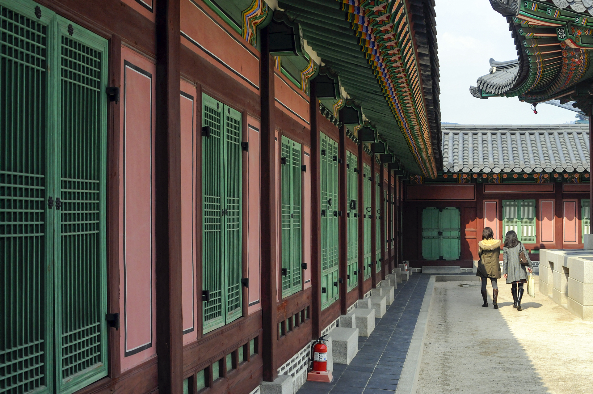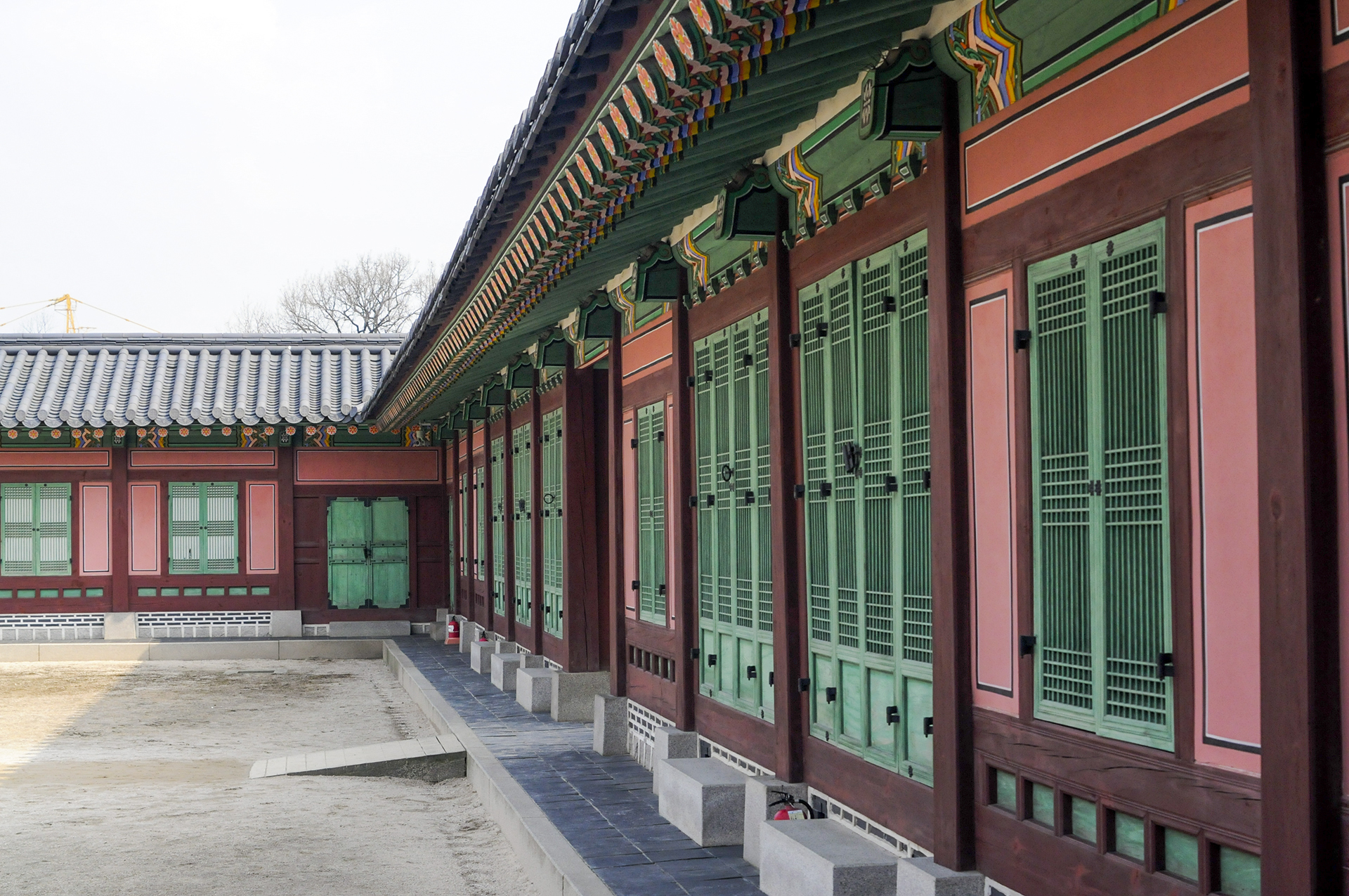 오른쪽에 공사중인 담장은 옛 소주방 권역 복원공사를 위해 막아놓은 것이다. 정면에 보이는 행각의 문은 사정전으로 통하는 연태문이다.