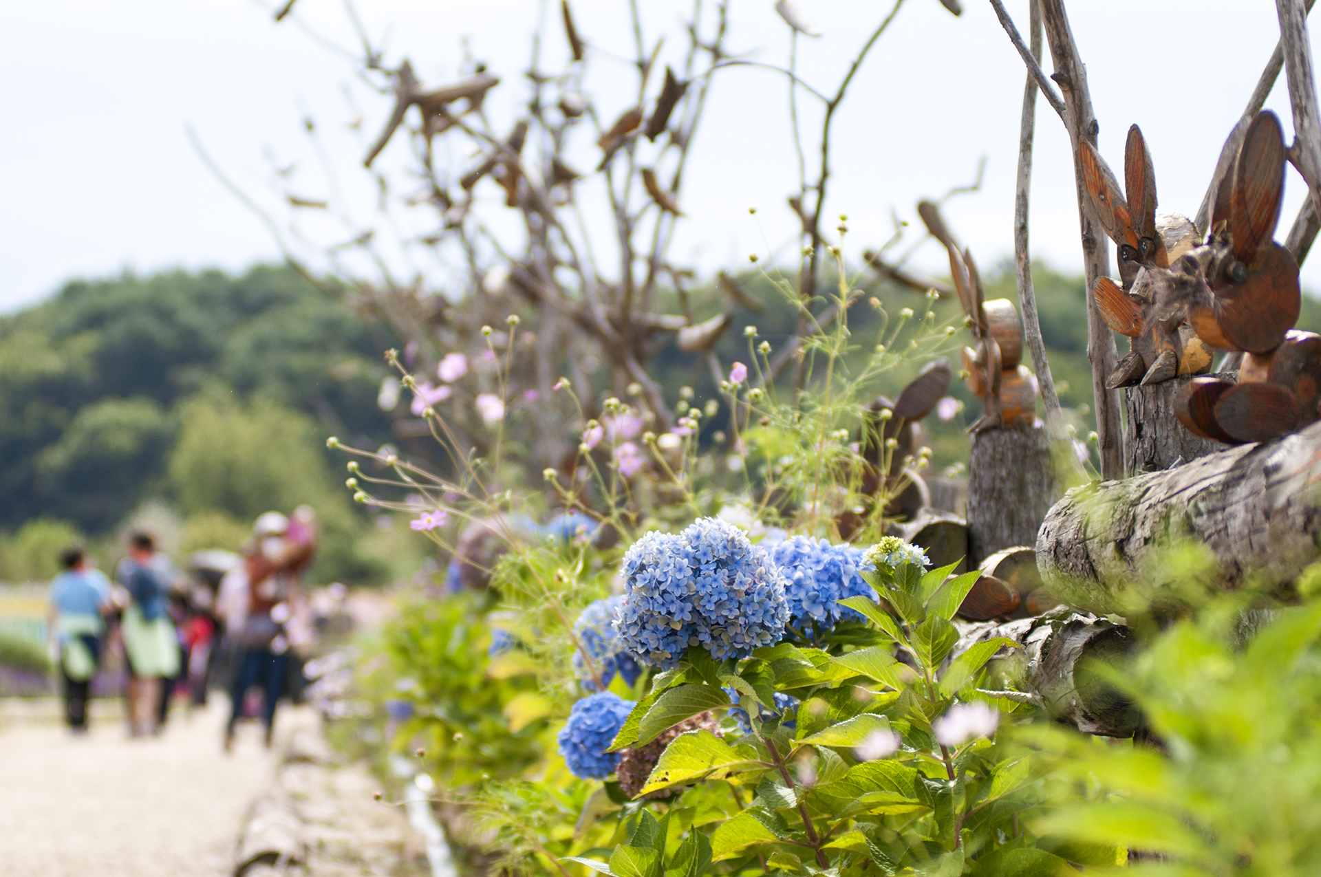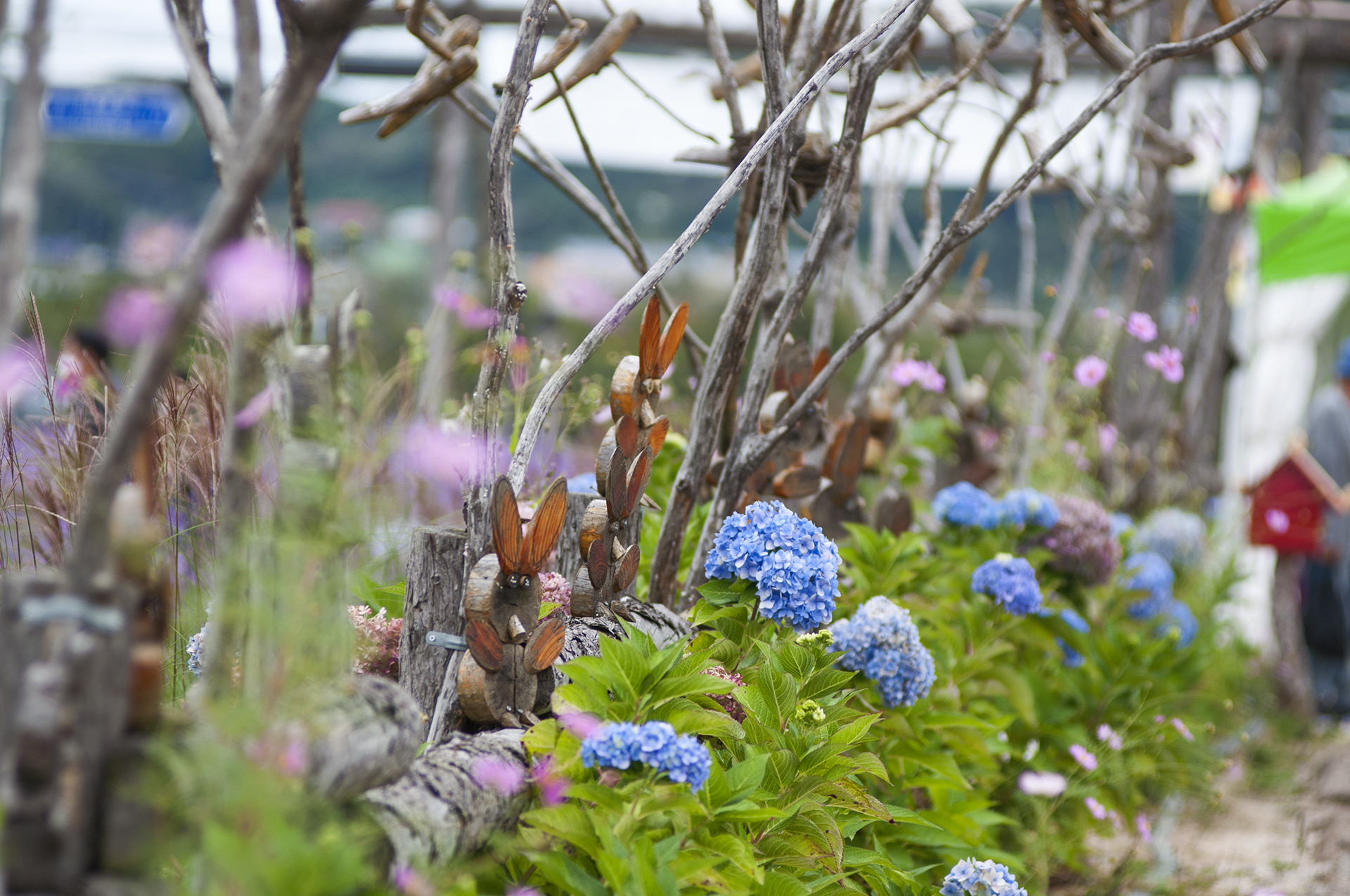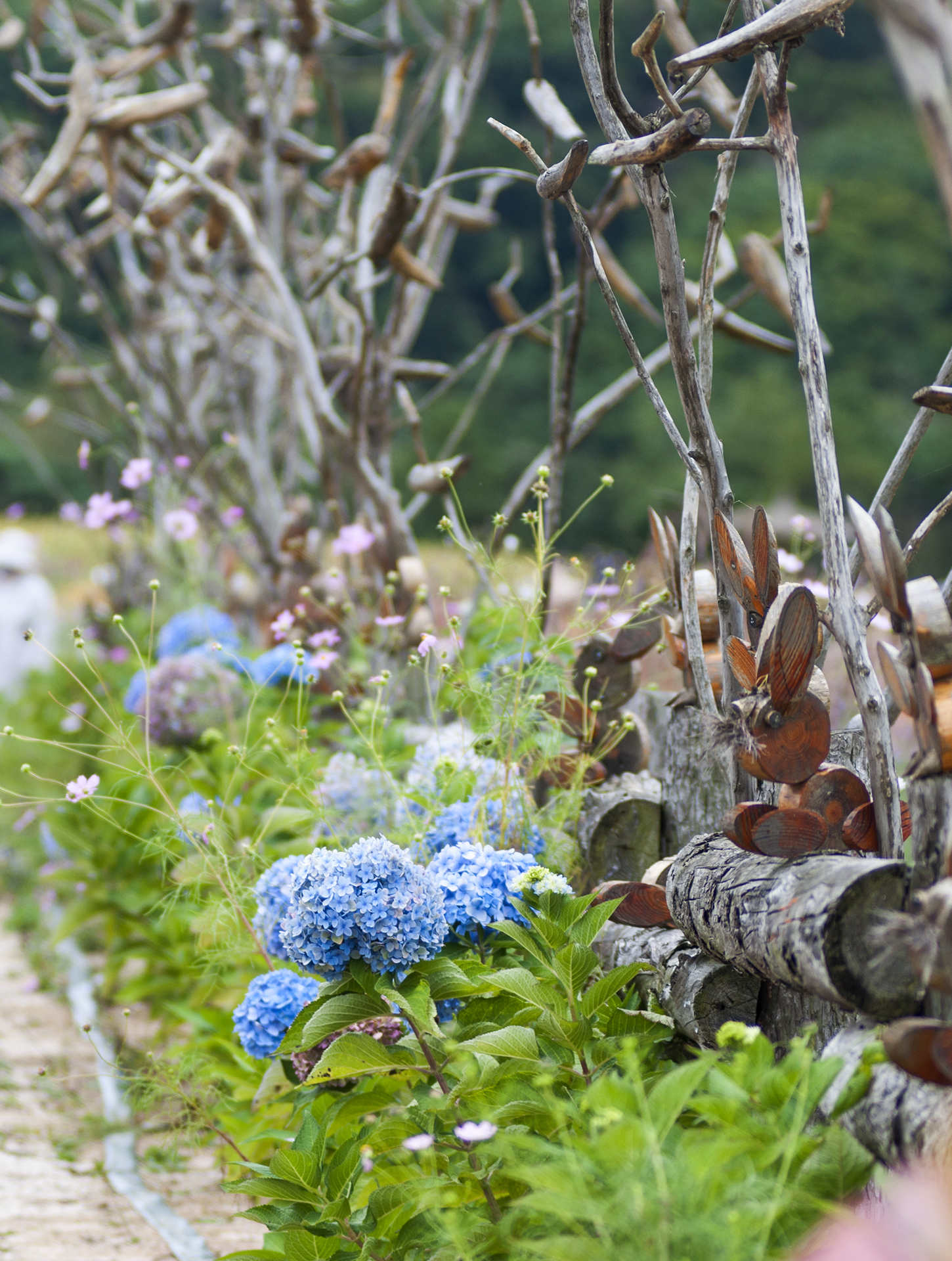 꽃밭으로 입장하는 길에는 나무토막으로 울타리를 만들고, 그 위에 토끼들이 앉아있어 정겨움을 더해준다.