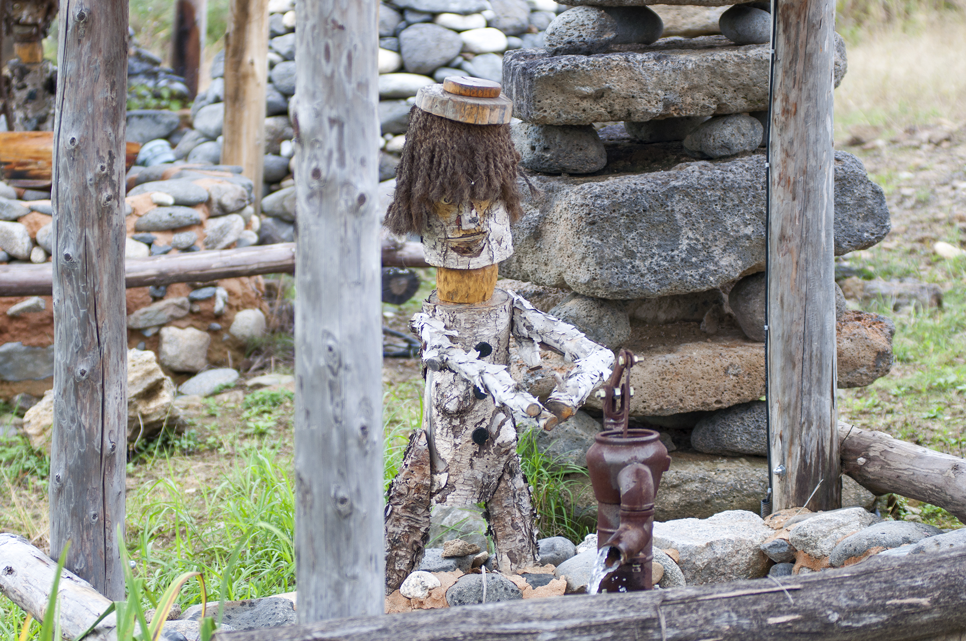 연못 주변에 설치된 자작나무 인형, 펌프질을 하는 중~