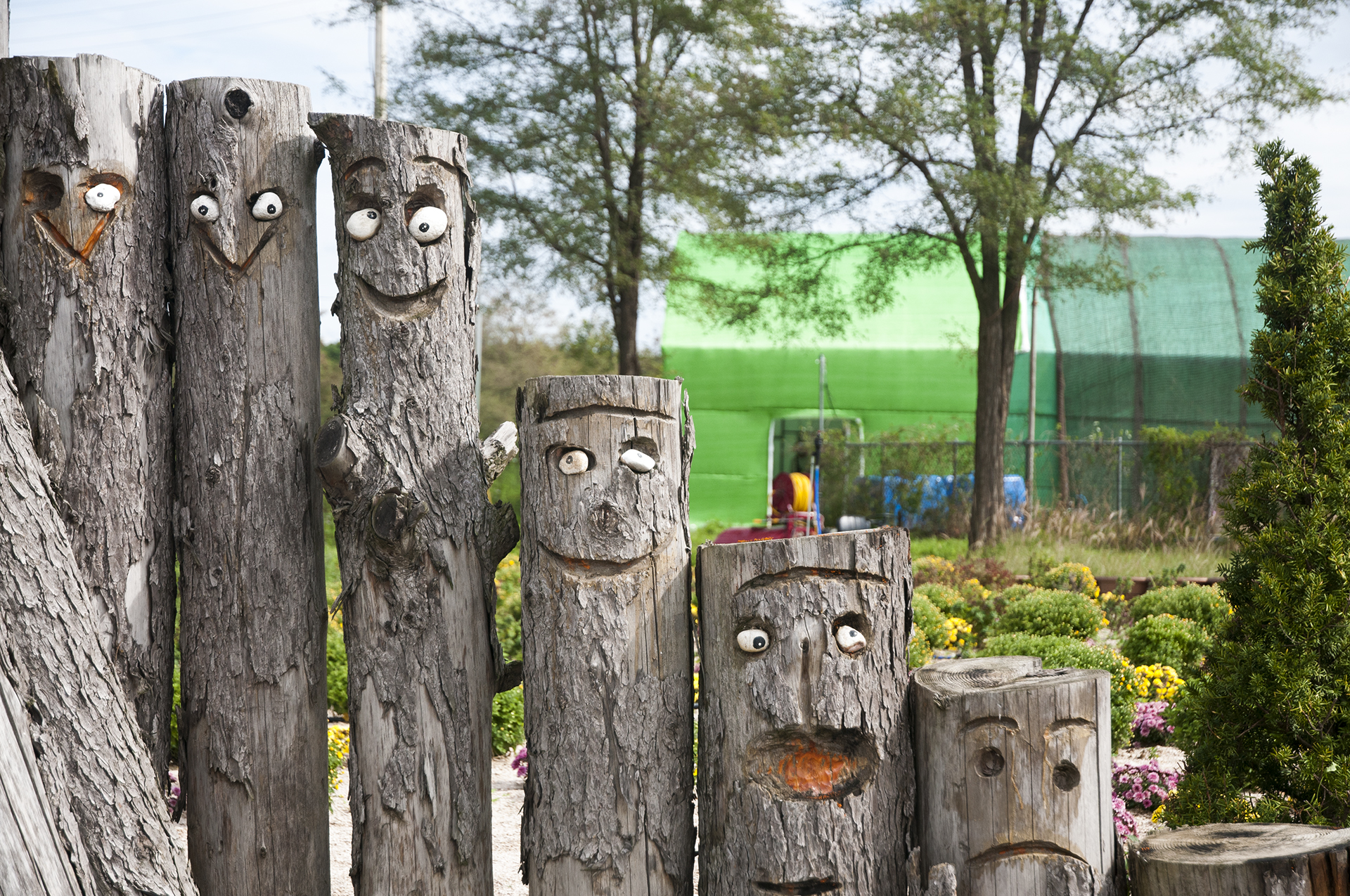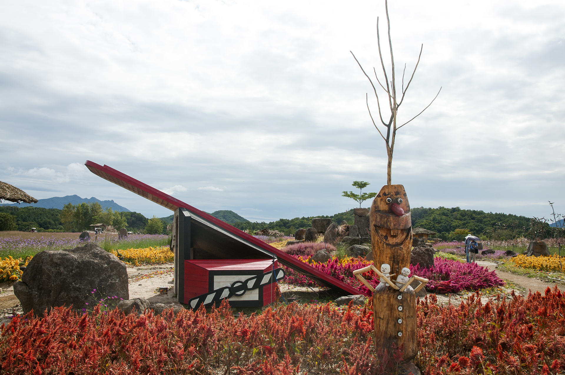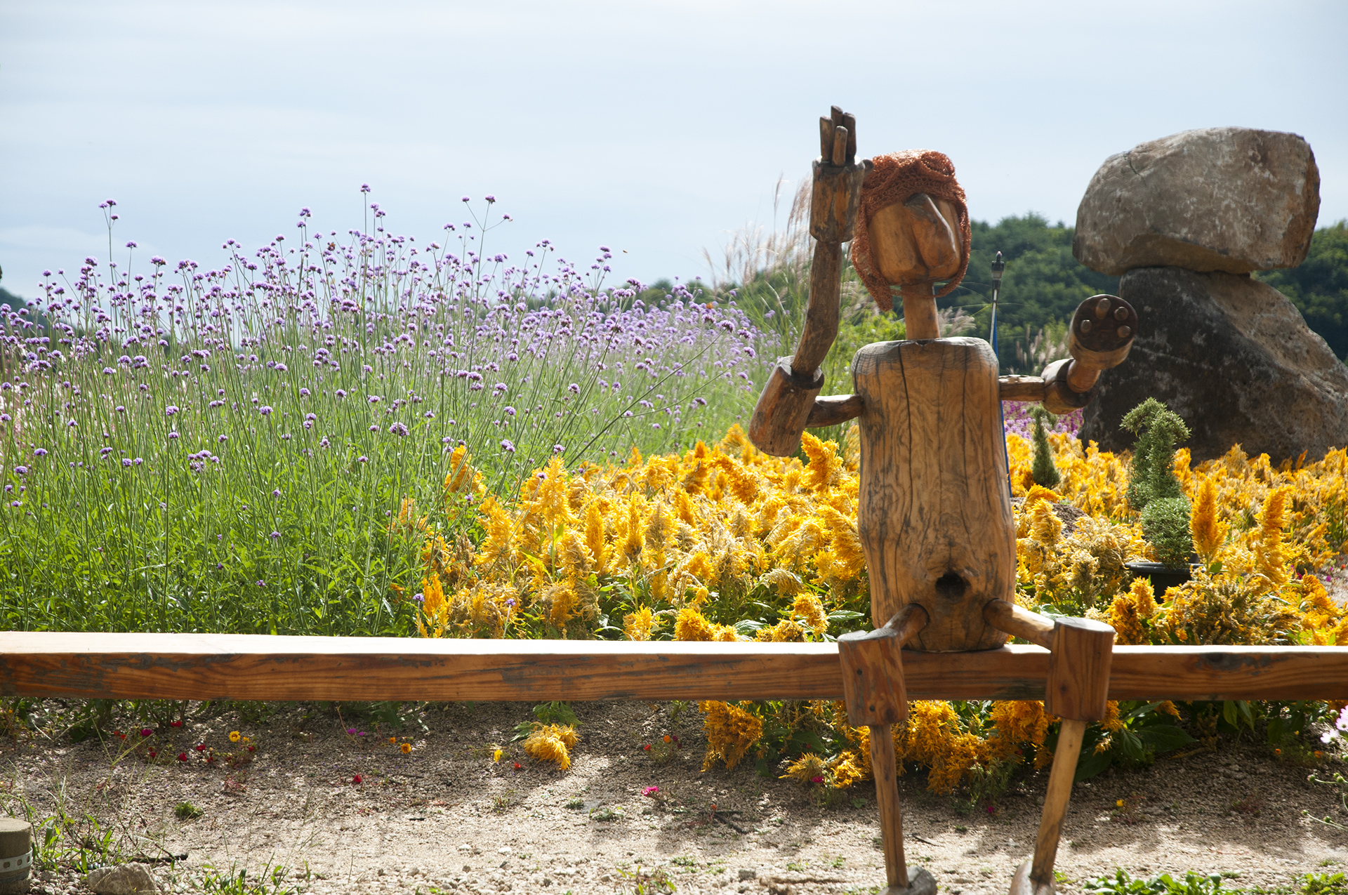 꽃밭 가운데 사물놀이 하는 통나무 인형들은 재미있고 섬세한 모습을 하고 있다.