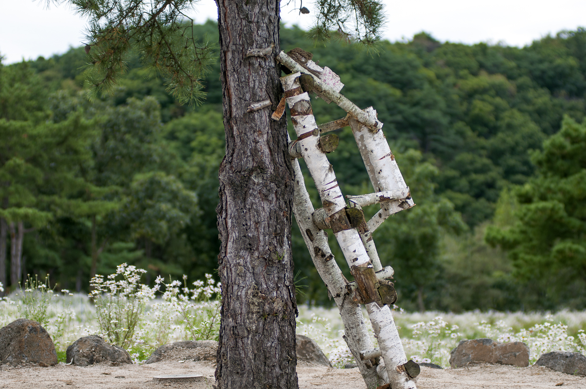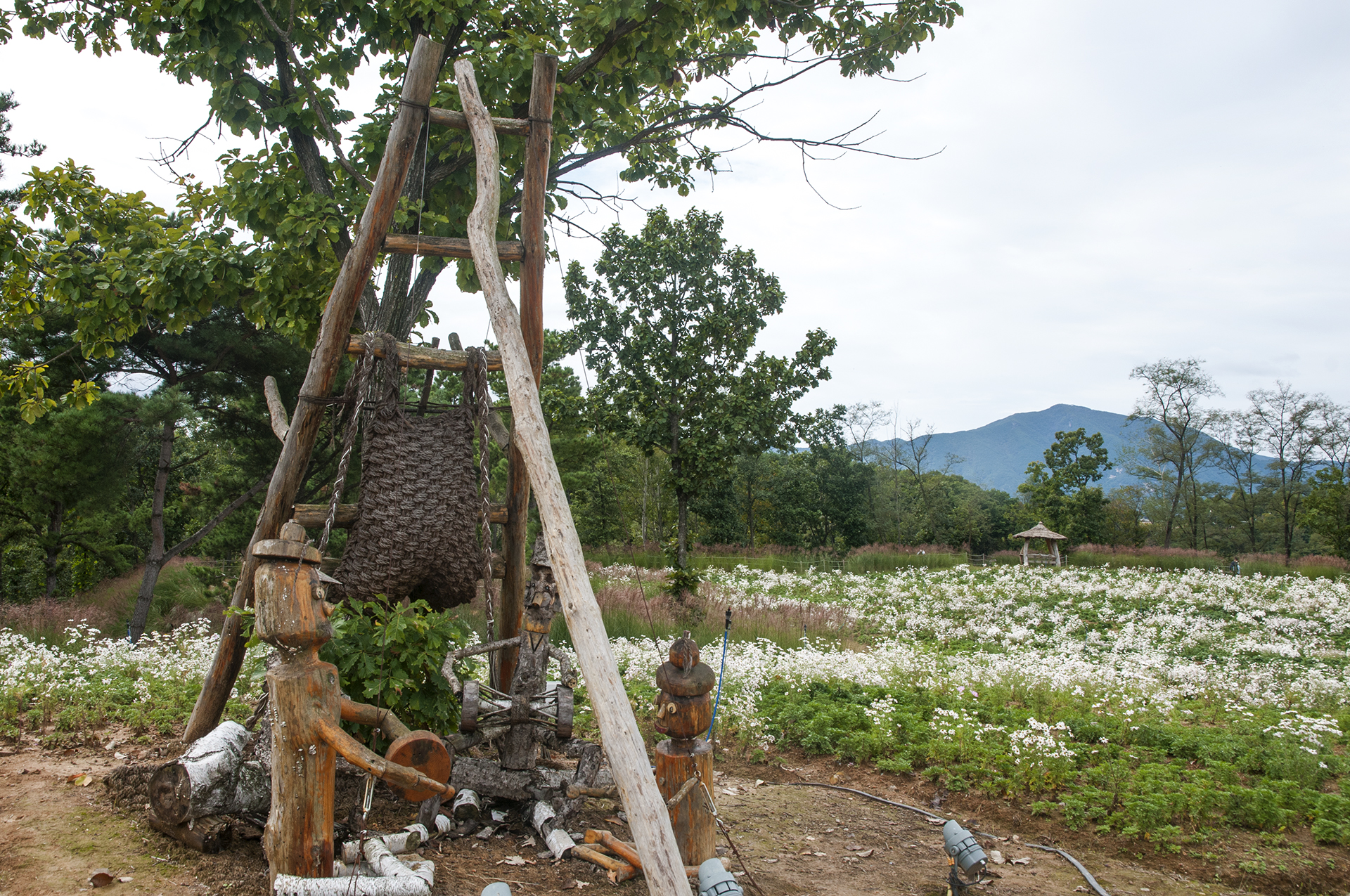 구절초 꽃밭 가는길에 사다리를 오르는 자작나무 인형을 만났다.