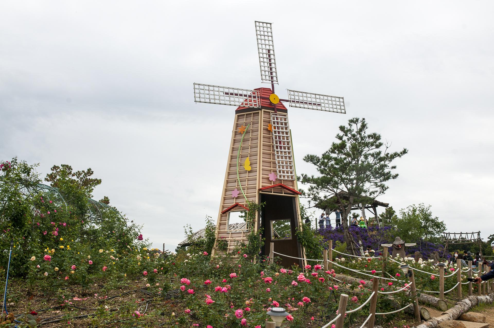 풍차 주변에는 작은 규모의 장미가 활짝 피어 있다.