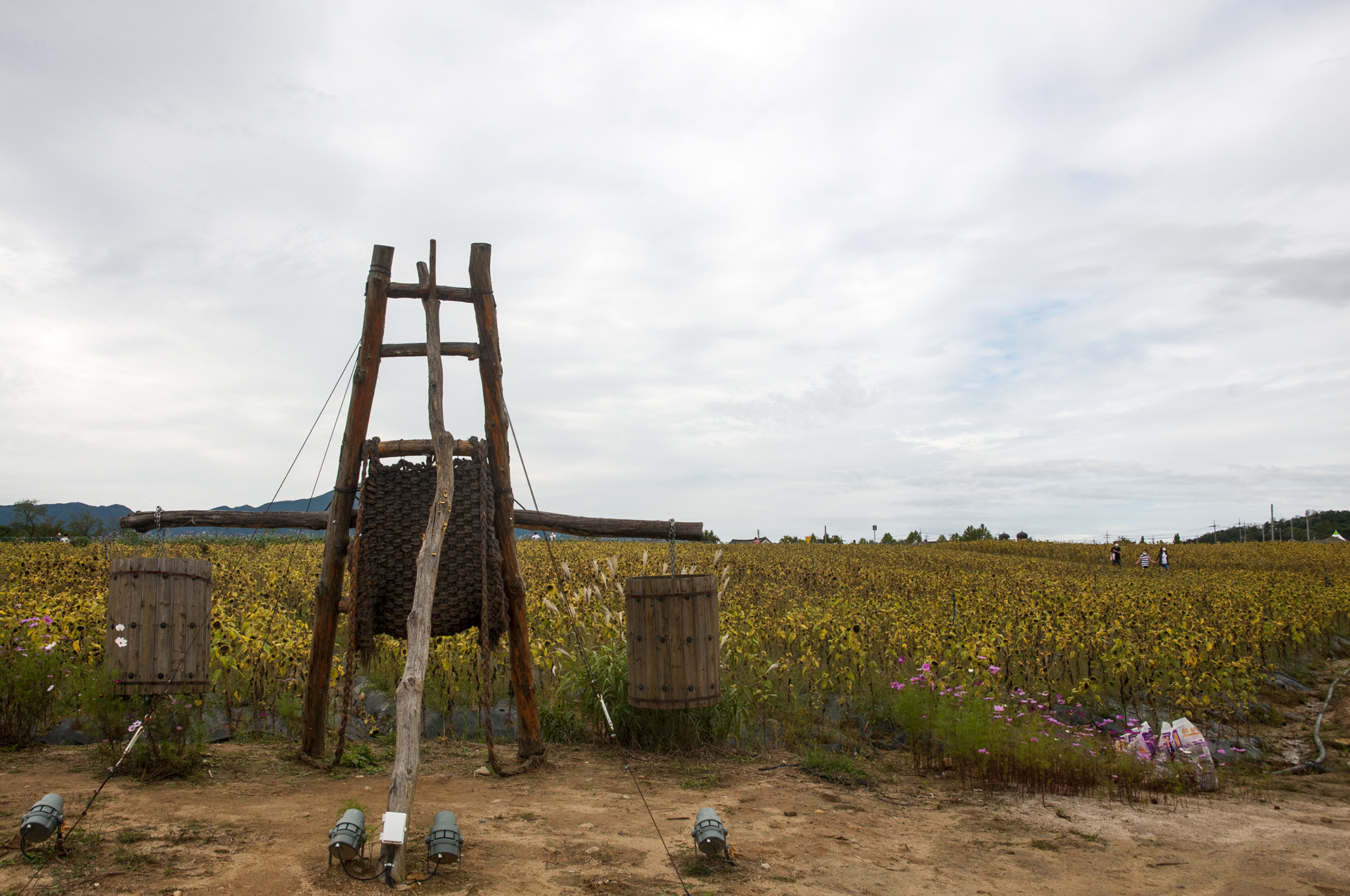 통나무 물지게 뒤로 이제는 시들어 인기가 없어진 해바라기 밭이 넓게 펼쳐져 있다.