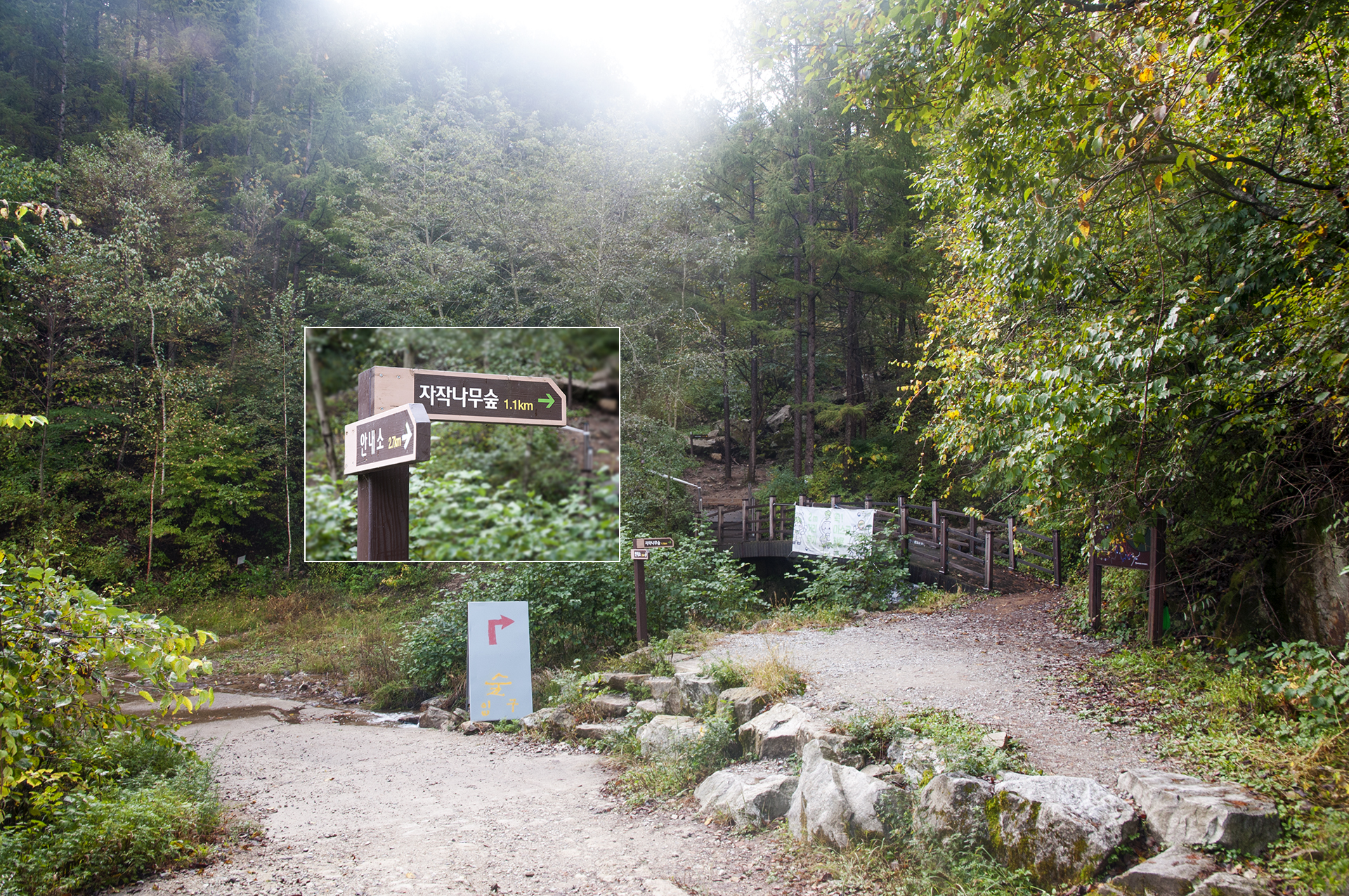 안내소에서 여기까지 40분 정도 소요됐다. 숲 입구 간판을 만나면 오른쪽 숲길로 다리를 건너가면서 3코스가 시작된다.