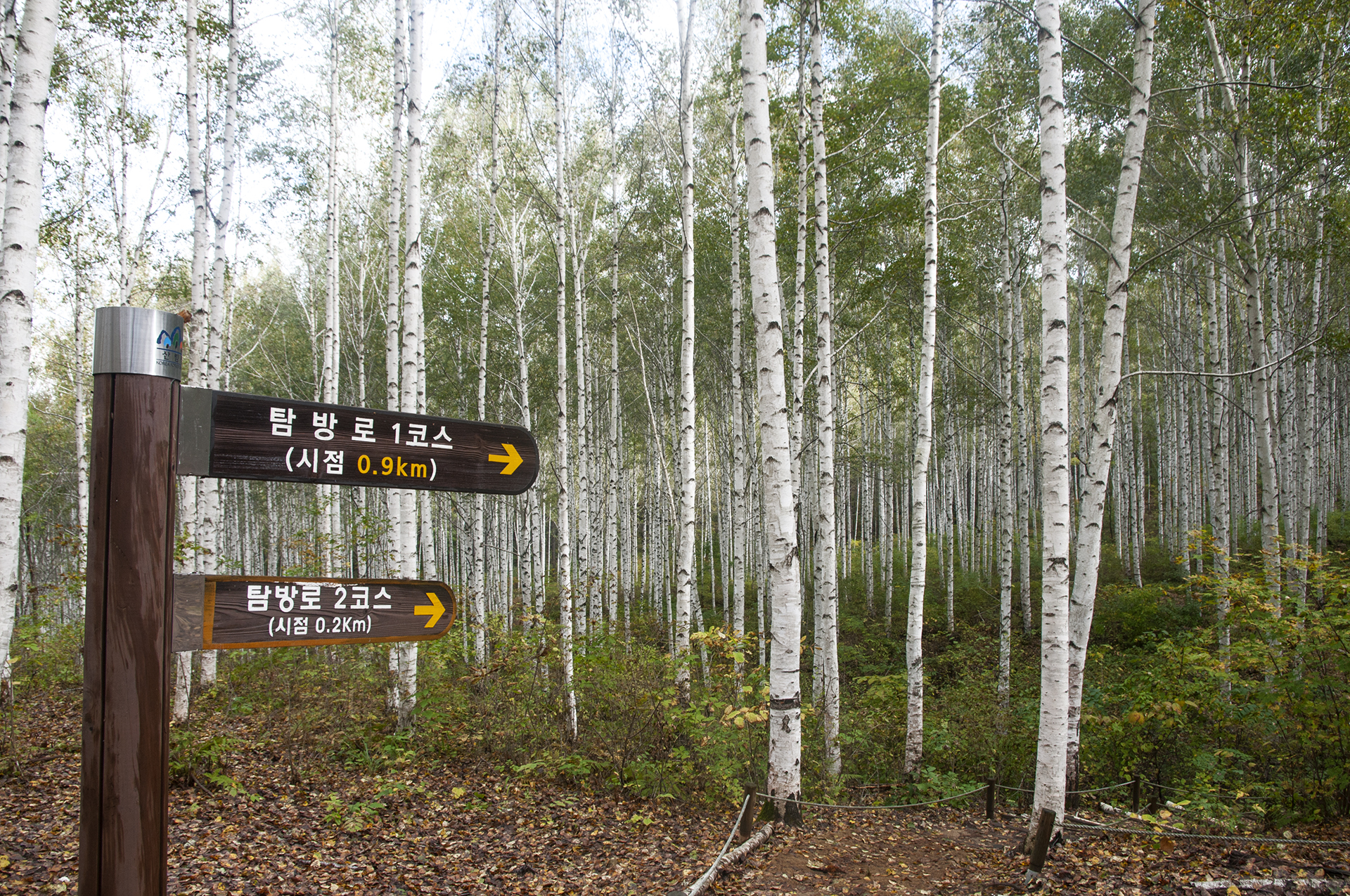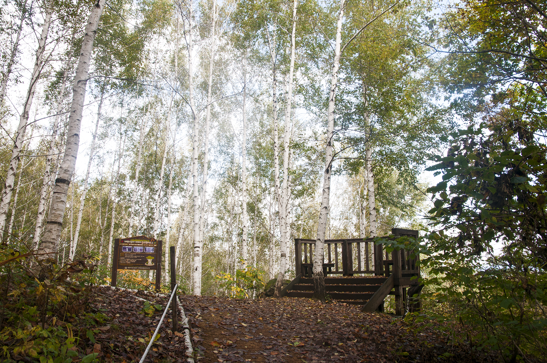 숲의 경관을 해치지 않기위해 최소한의 포토존만 설치되어 있는 자작나무숲