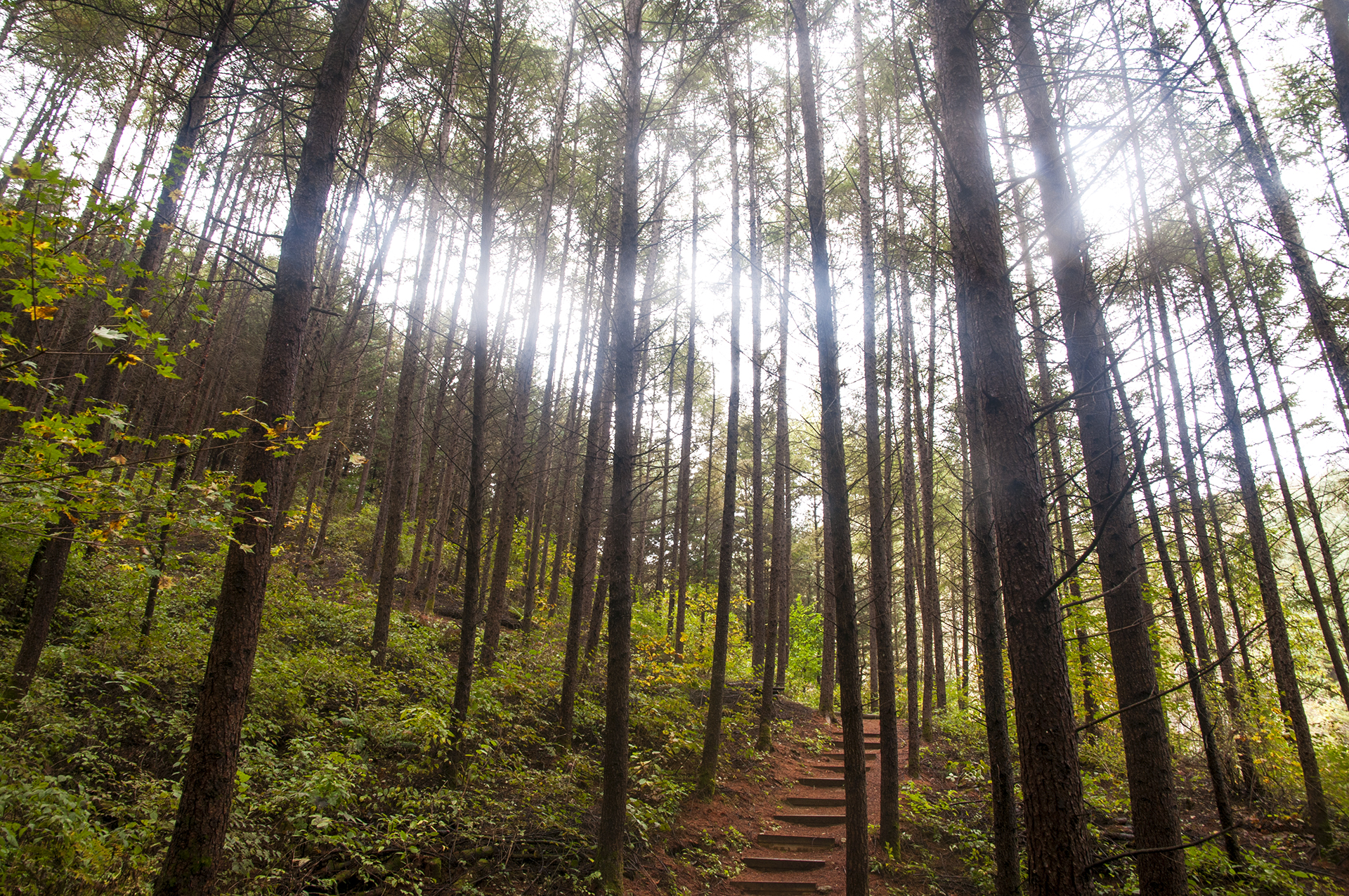 시원하게 쭉쭉 뻗은 낙엽송들 옆으로 흐르는 작은 계곡길