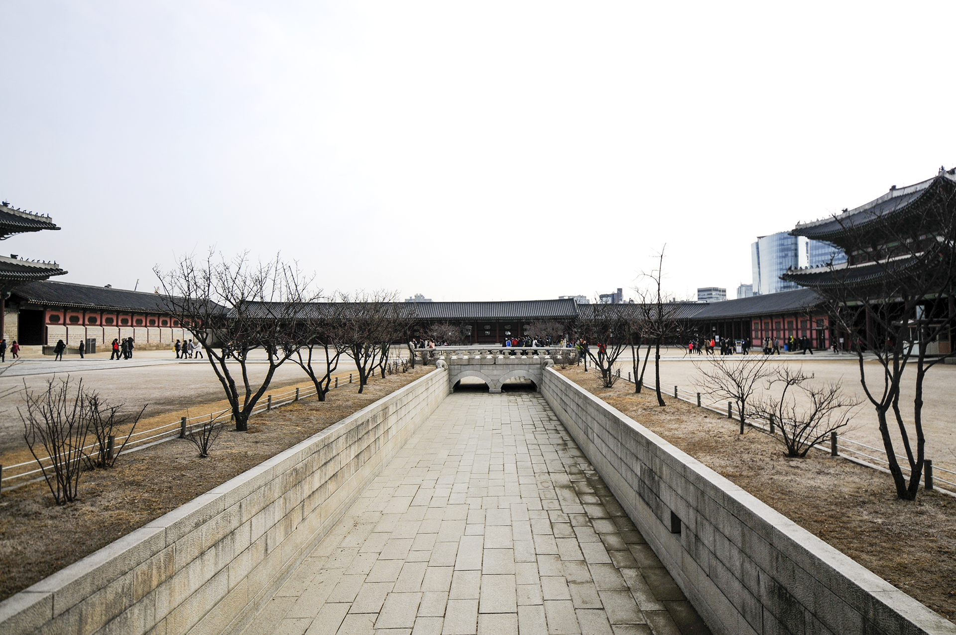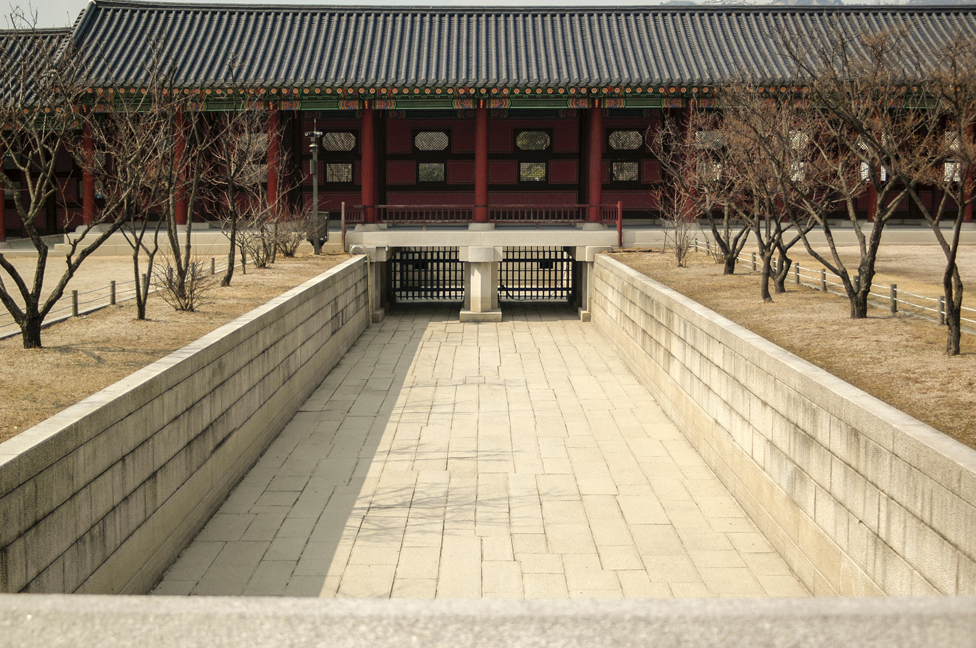 서쪽 행각에서 바라본 금천의 모습으로 좌측은 근정문이고 우측은 흥례문이다. 근정문에서 의례를 거행할 때는 영제교 북쪽, 즉 다리 건너편으로는 정2품 이상이 서고, 남쪽으로는 정3품 이하가 자리를 잡았다. 영제교가 신분의 구분선이 되었다.