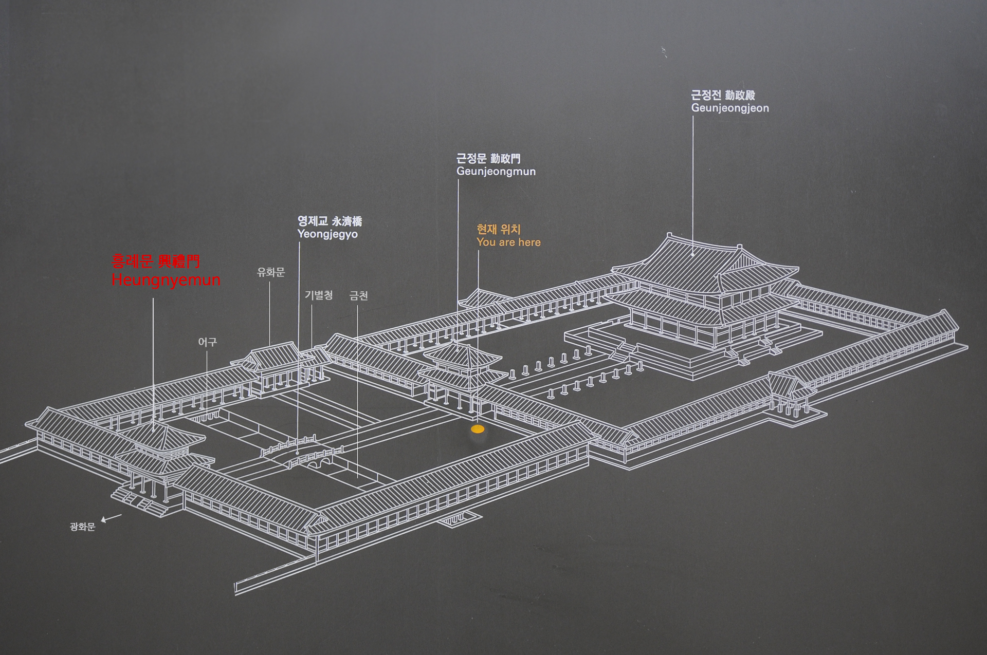 흥례문 영역의 가운데에는 궁궐안에 흐르는 개천인 금천이 서에서 동으로 흐르도록 한 어구가 있고, 어구의 중앙에 영제교라는 다리가 놓여 있다. 실제로 물은 흐르지 않고 있었다.