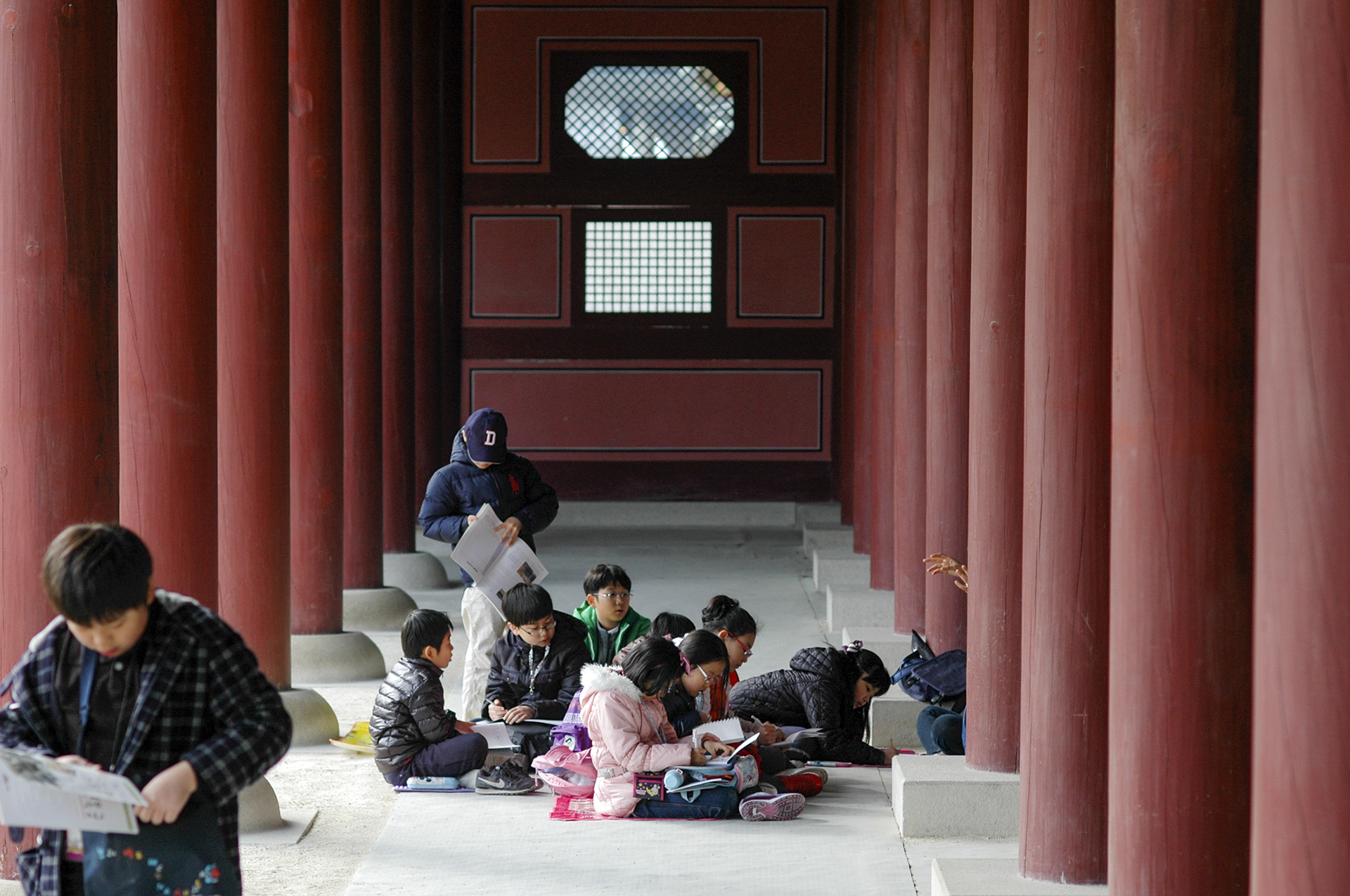 행각에서 경복궁을 설명하시는 선생님, 열심히 받아적는 아이들의 역사공부가 한창이다.