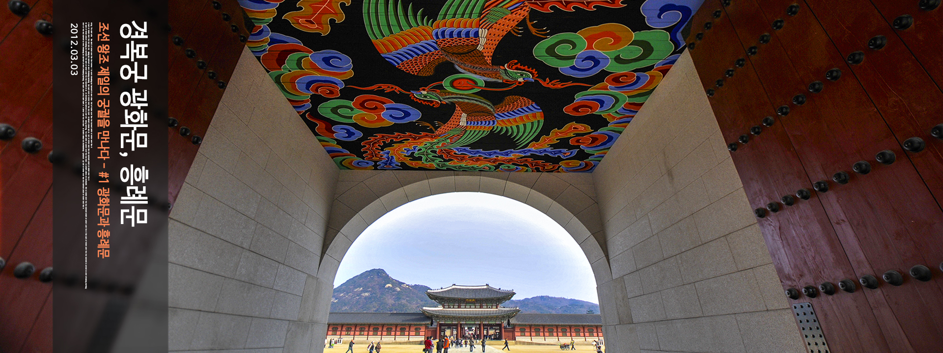 광화문은 세 개의 홍예문으로 이루어져 있는데, 다른문 보다 높고 큰 중앙의 홍예문으로는 왕이, 좌우의 홍예문으로는 왕세자와 신하들이 출입하였다. 사진에서 보듯이 중앙의 홍예문 천정에 보면 주작도가 있으니 광화문에 가면 잊지 말고 꼭 찾아보길 권한다.