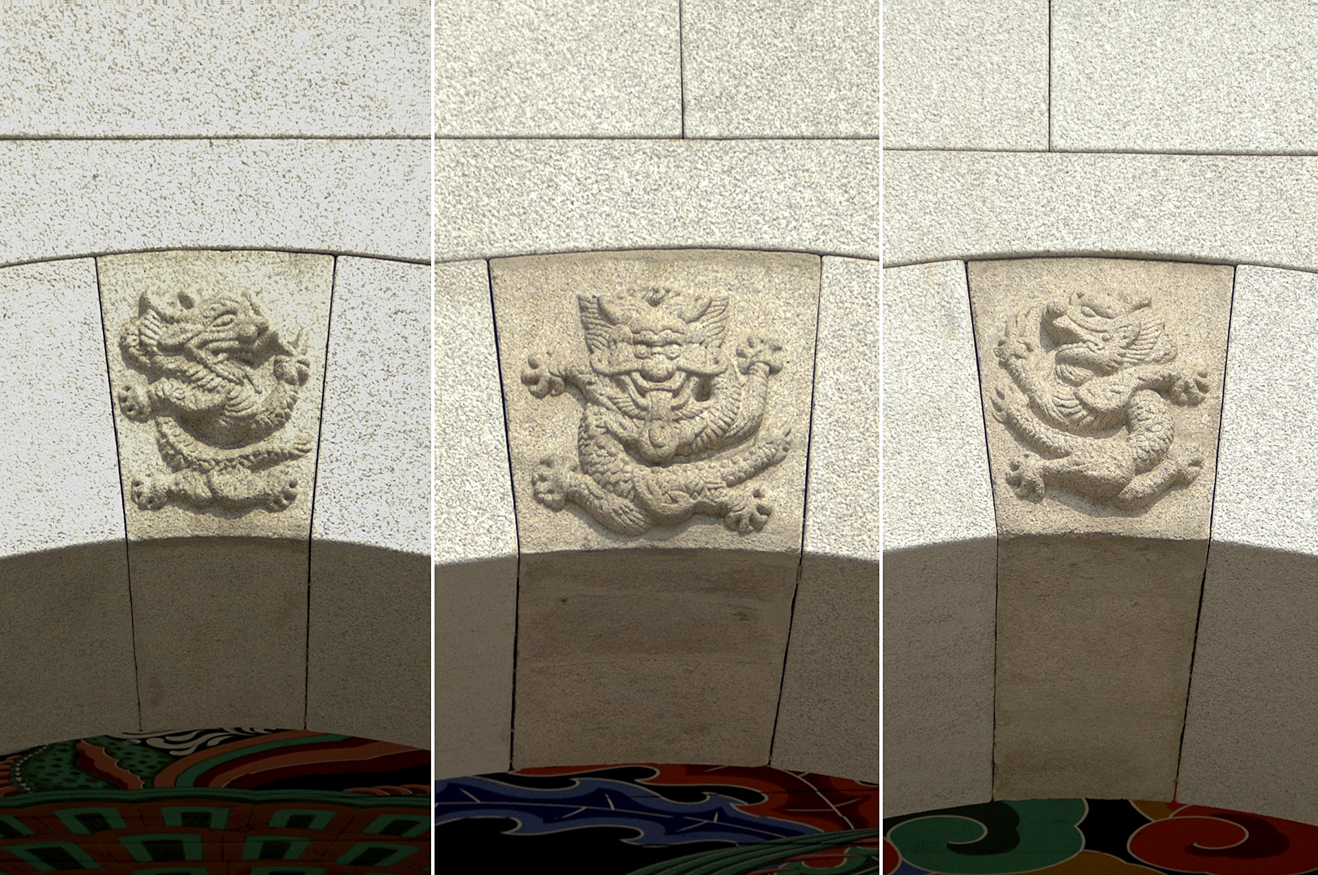 광화문의 3개 홍예문 이맛돌 한가운데에는 악귀를 물리친다고 믿는 상상의 동물인 벽사상이 조각되어 있다. 몸은 용처럼 보이나 얼굴은 뿔이난 귀면의 모습을 하고 혀를 내밀고 있어 익살스럽게 표현됐다.