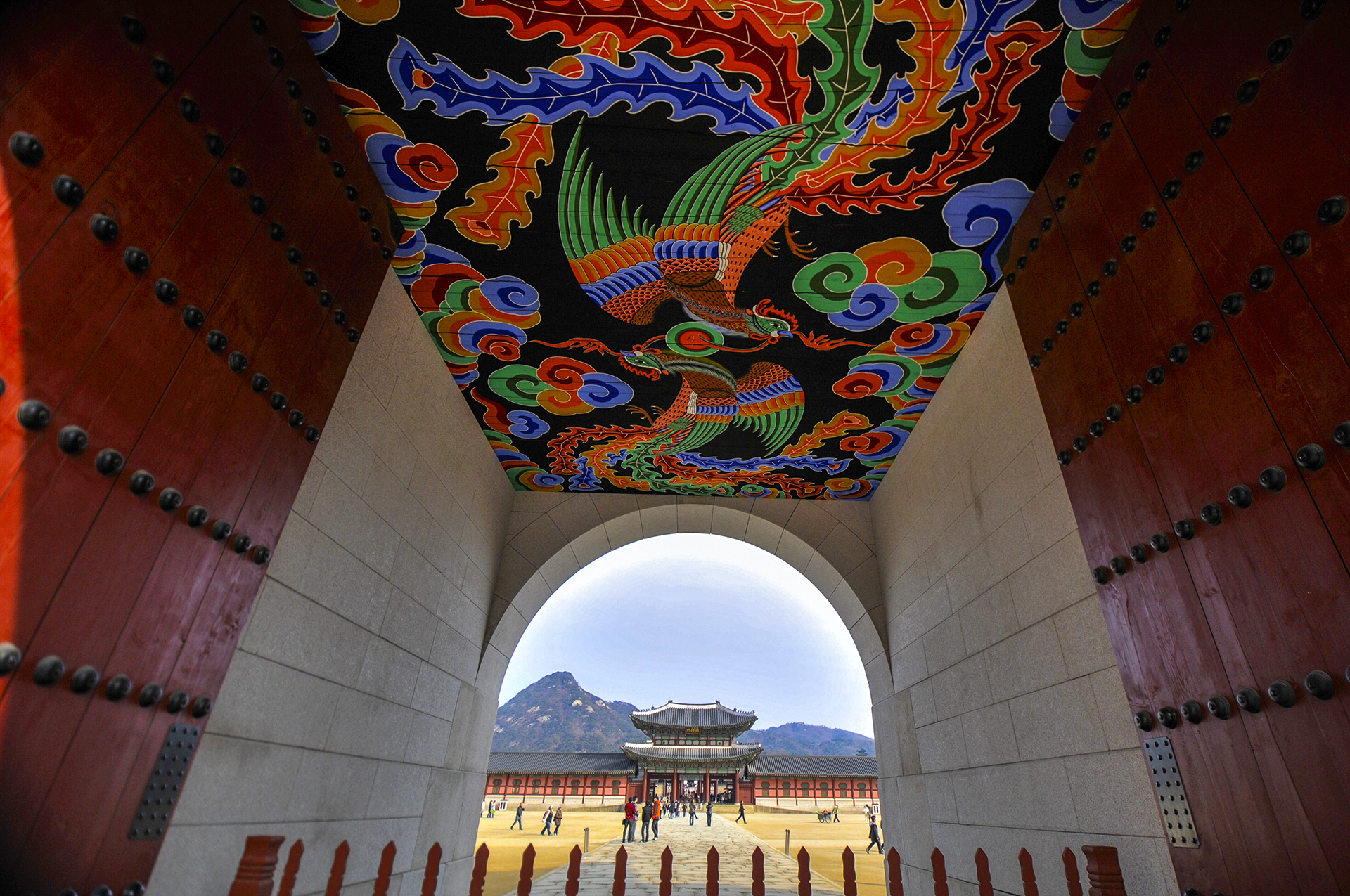 광화문에서 바라본 흥례문의 모습, 천장의 화려한 주작이 마치 흥례문을 향해 날아가는 듯 하다.