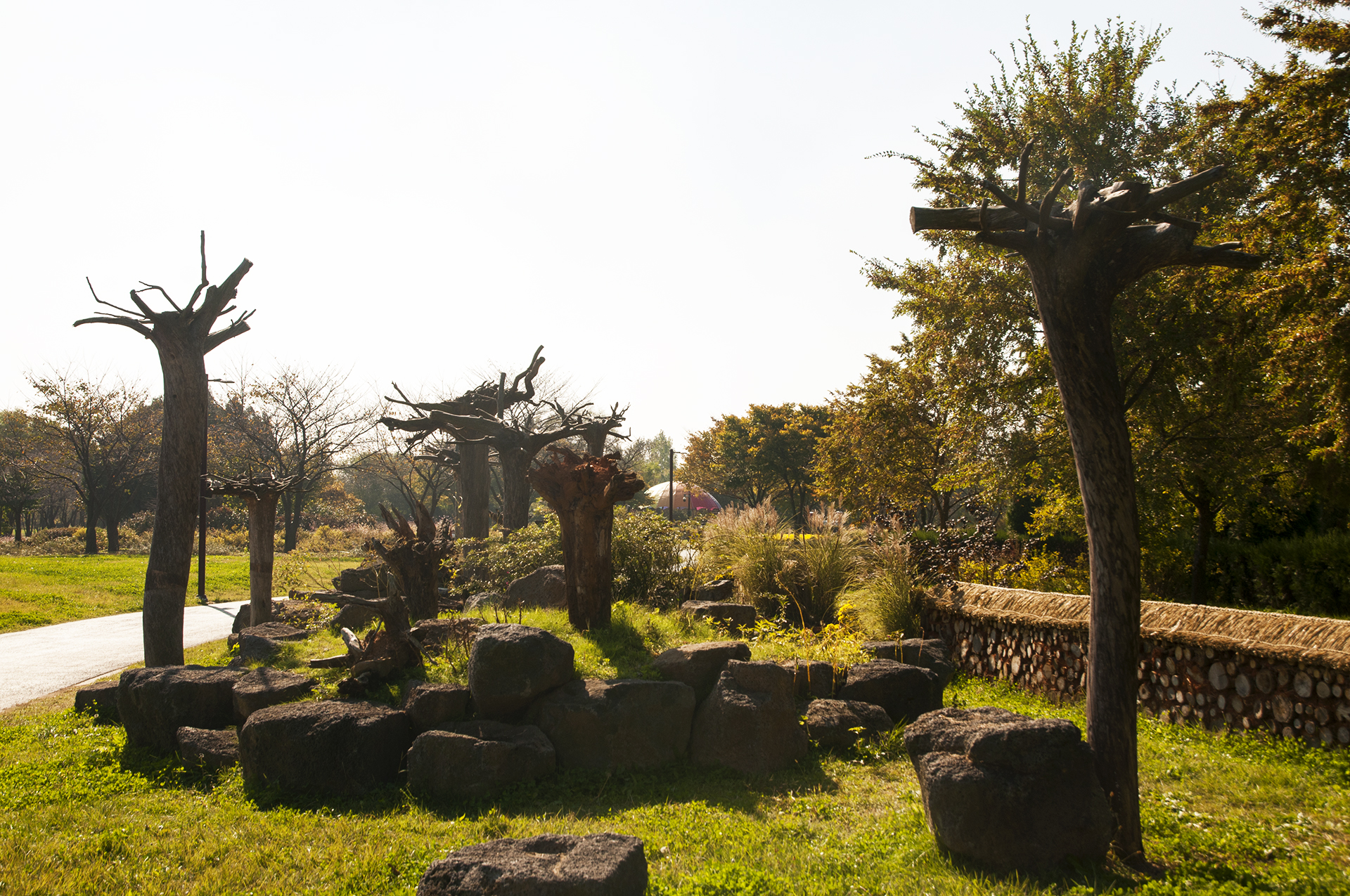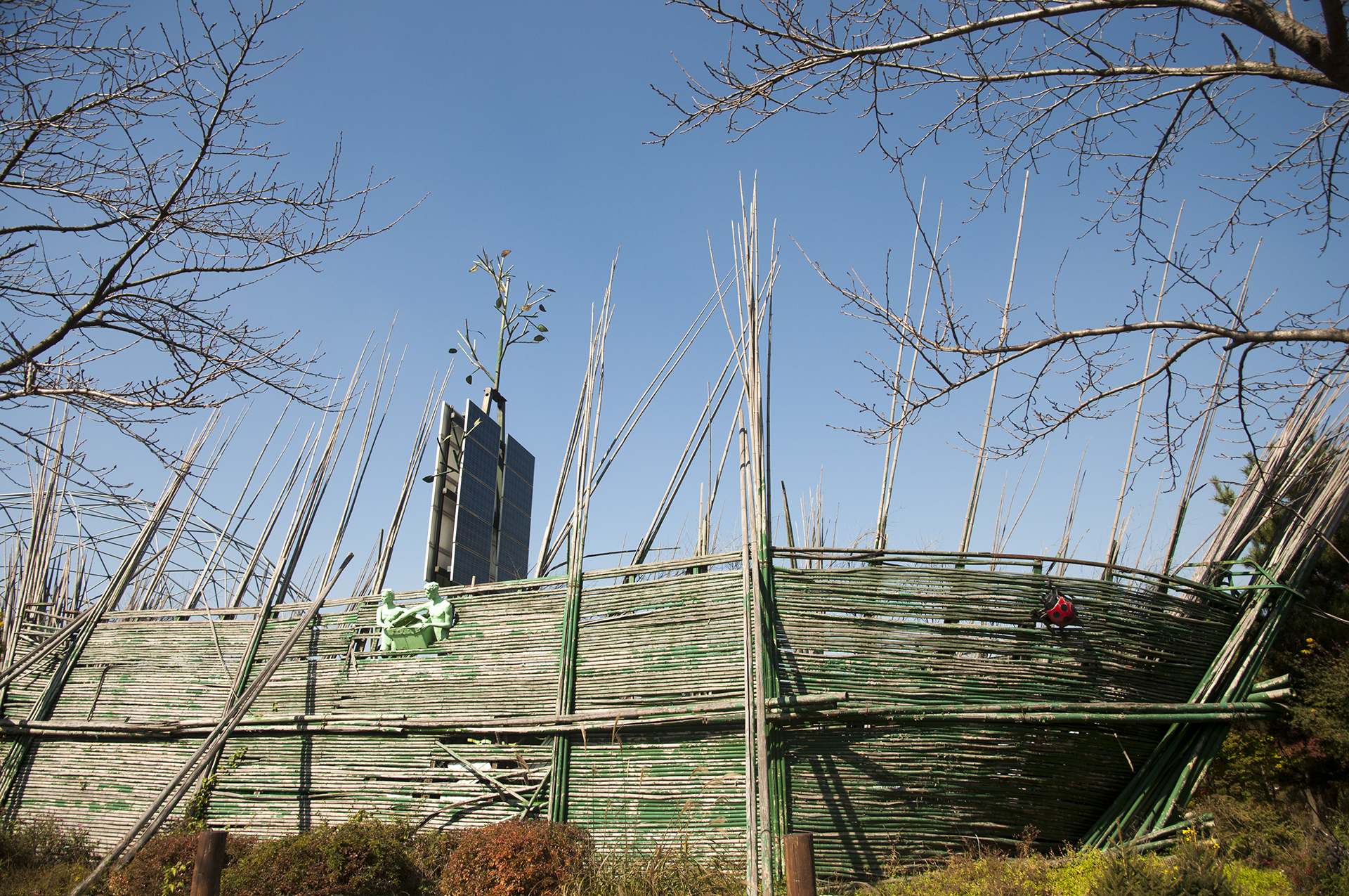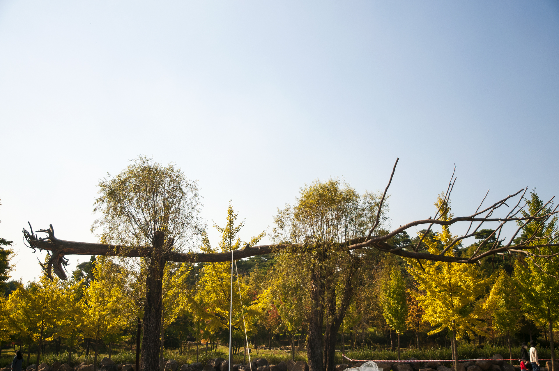 뿌리채 뽑혀진 나무들을 활용하여 만든 작품으로, 이 나무들은 태풍 '링링'의 피해를 입은 수목이라고 한다.