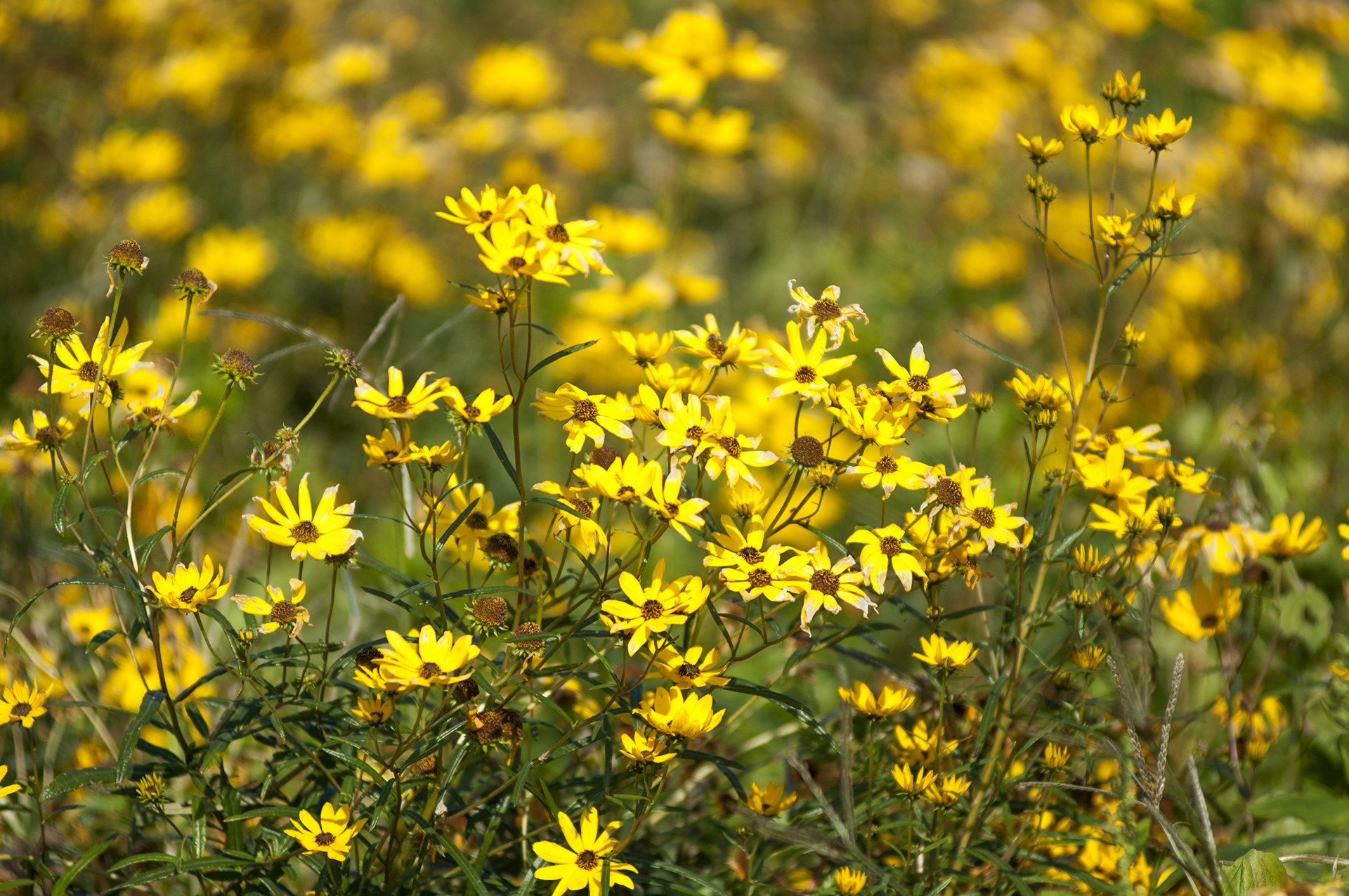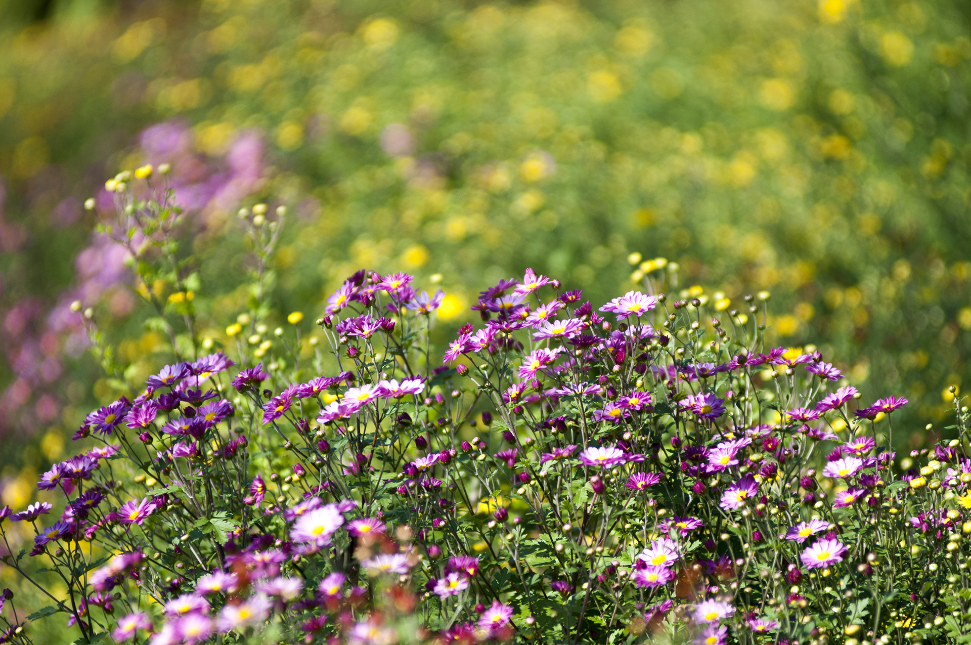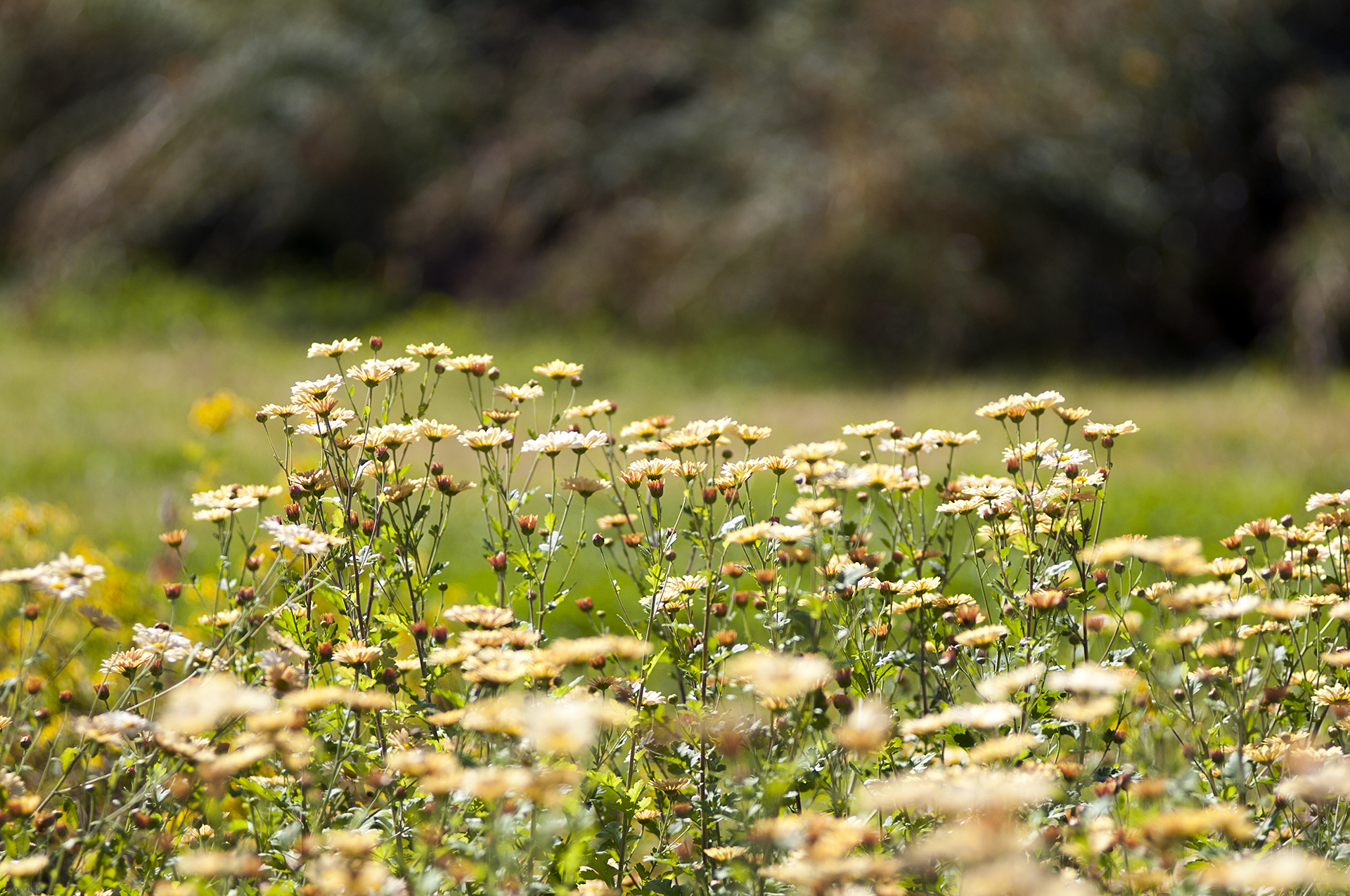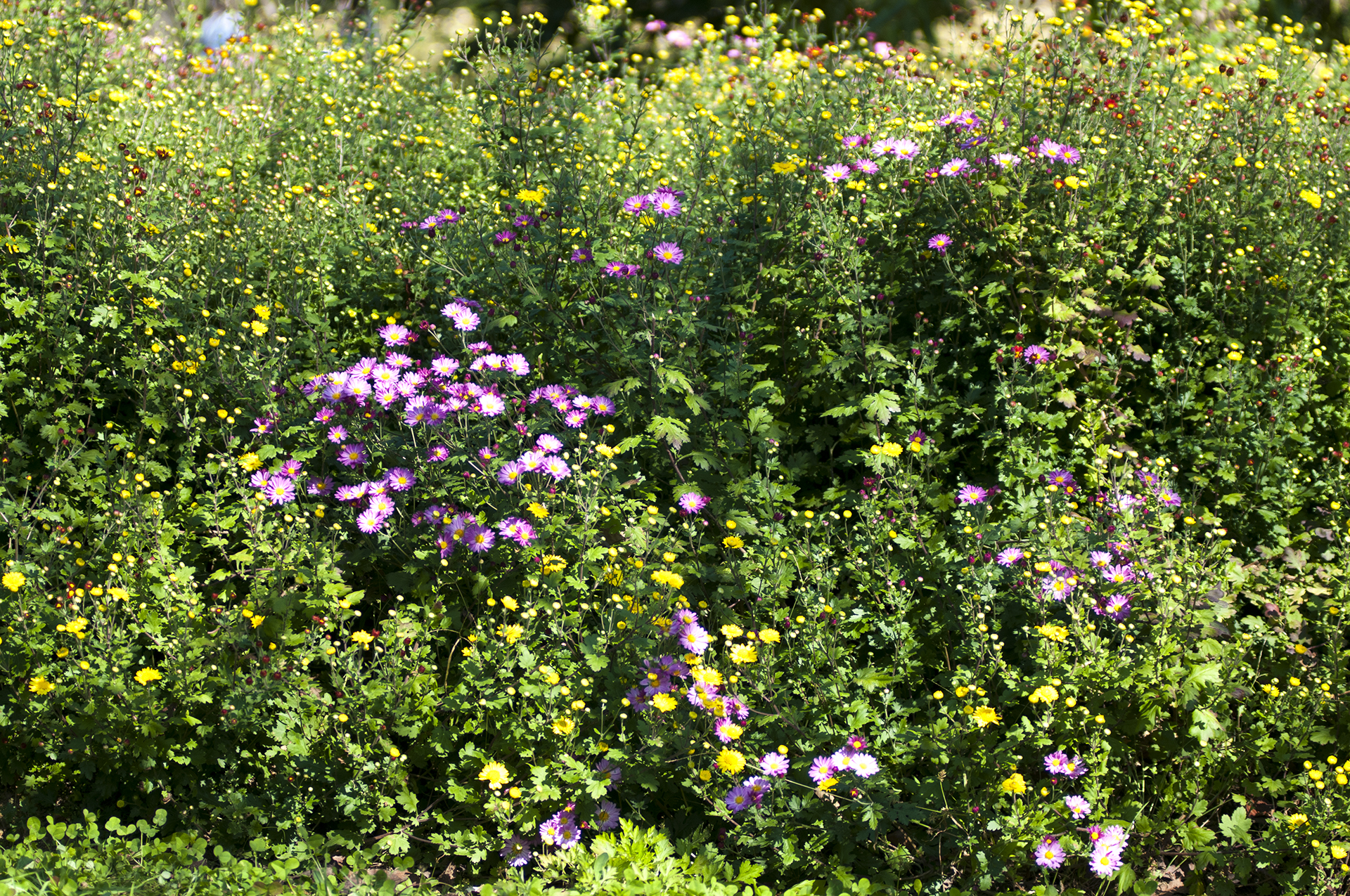 길가에 메리골드와 백묘국 등 국화과의 식물들이 가득 심어져 있다.