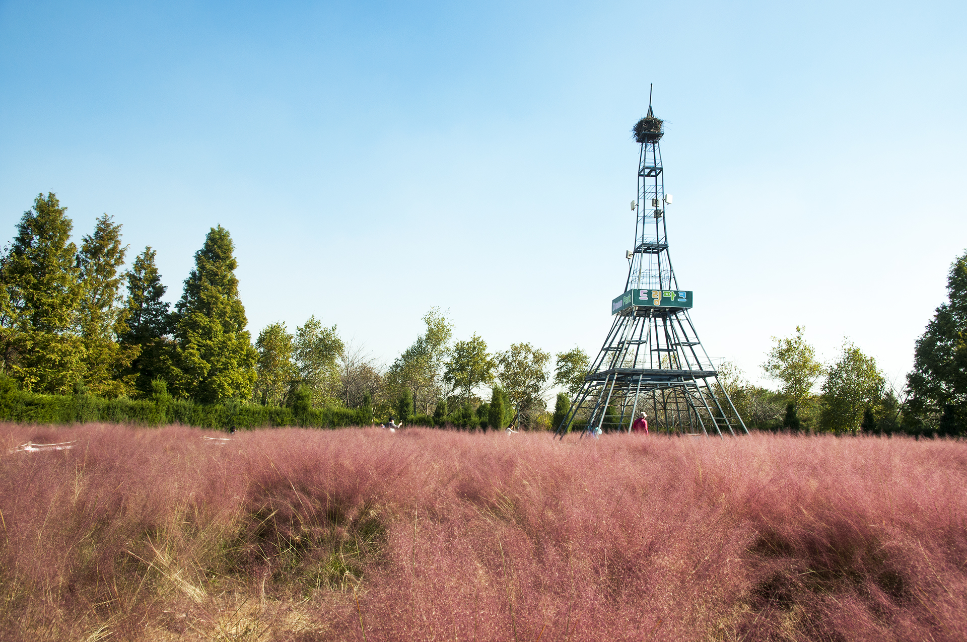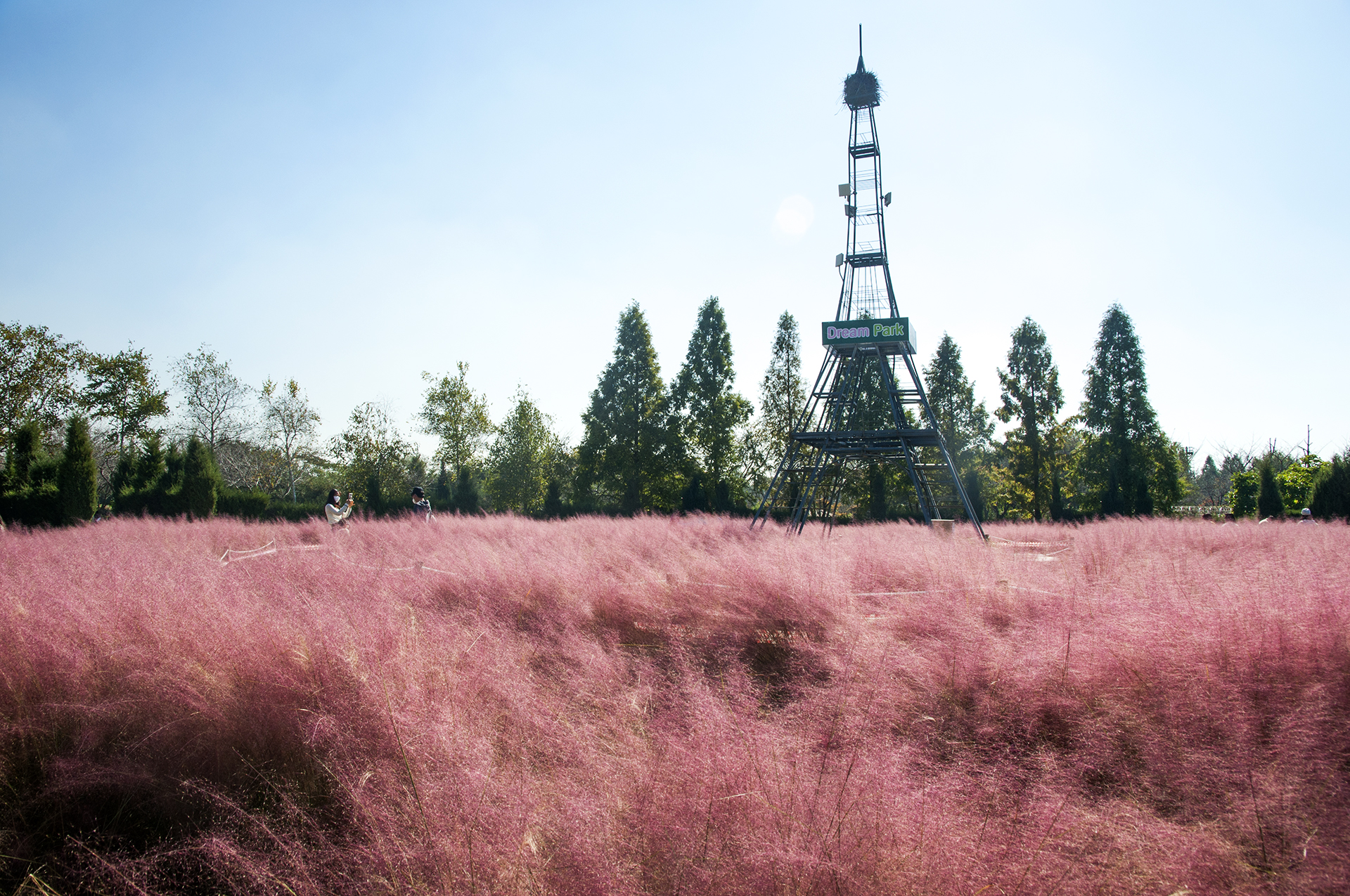 핑크뮬리 가운데 에펠탑이 서있어 많이 사람들이 사진을 남기는 촬영명소이다.