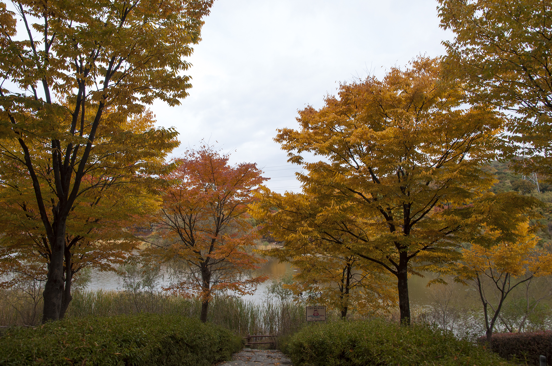 공원 뒤로 관모산이 보이고 호수를 둘러싼 느티나무는 노랗게 빨갛게 물이 들었다.