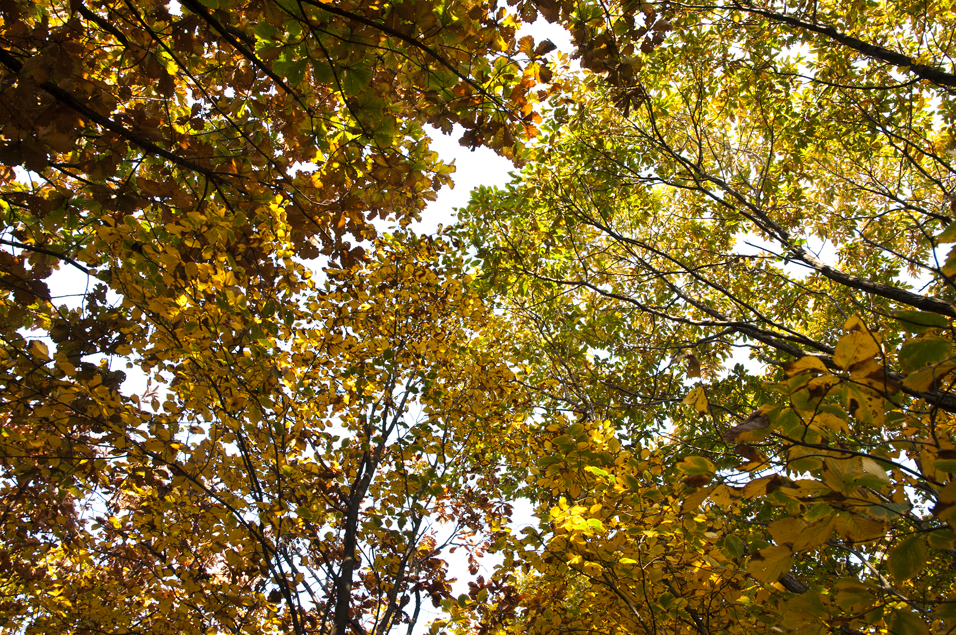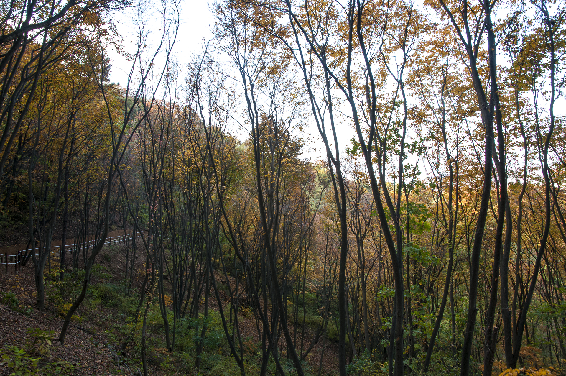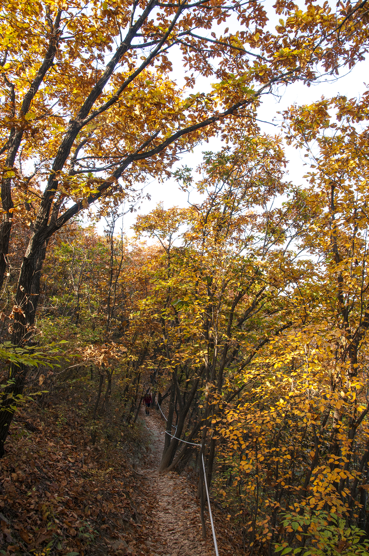 원적정에서 정상으로 가는 길에 올려다본 숲의 단풍, 올해는 나뭇잎 상태가 많이 좋지는 않다.