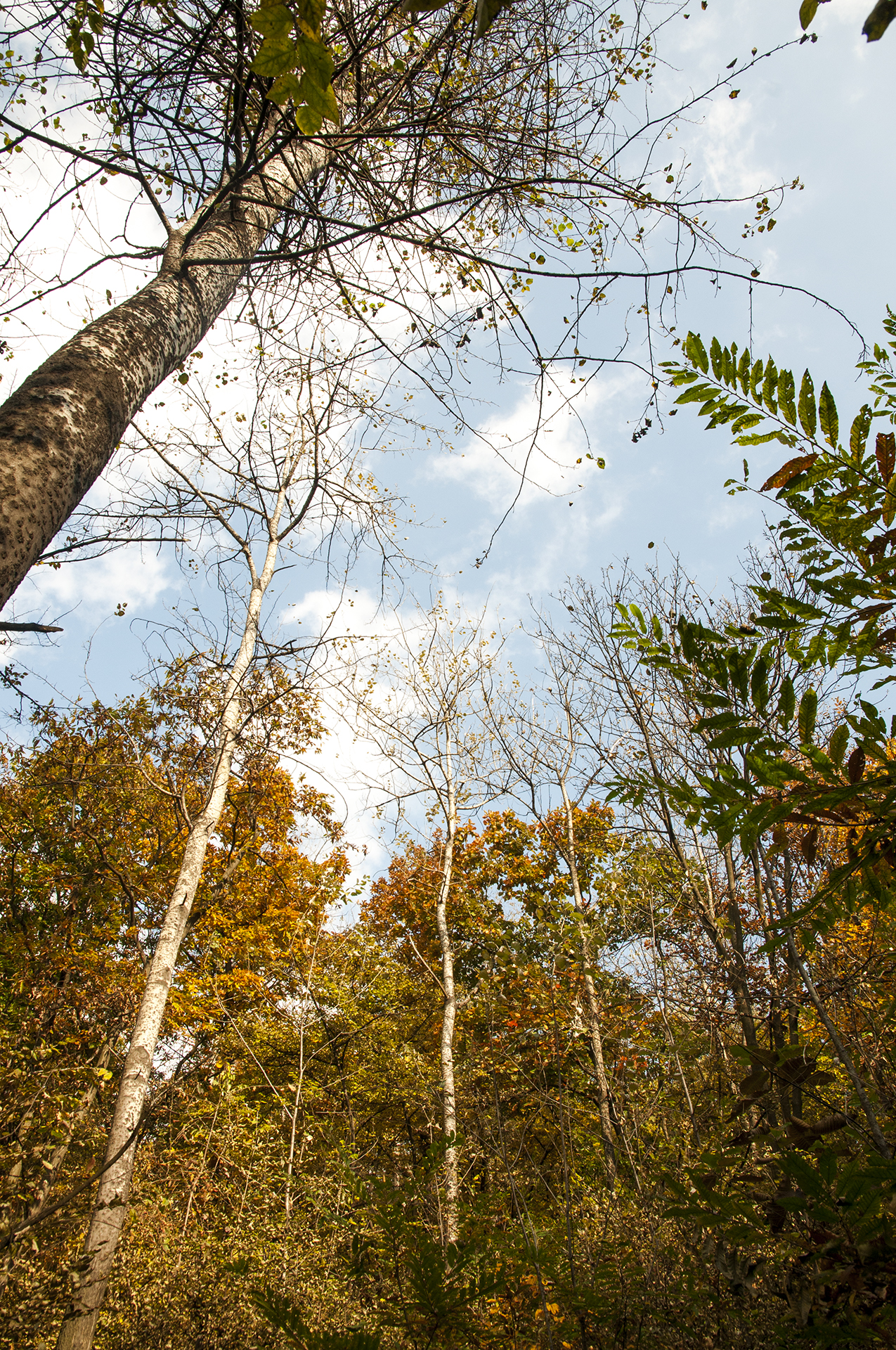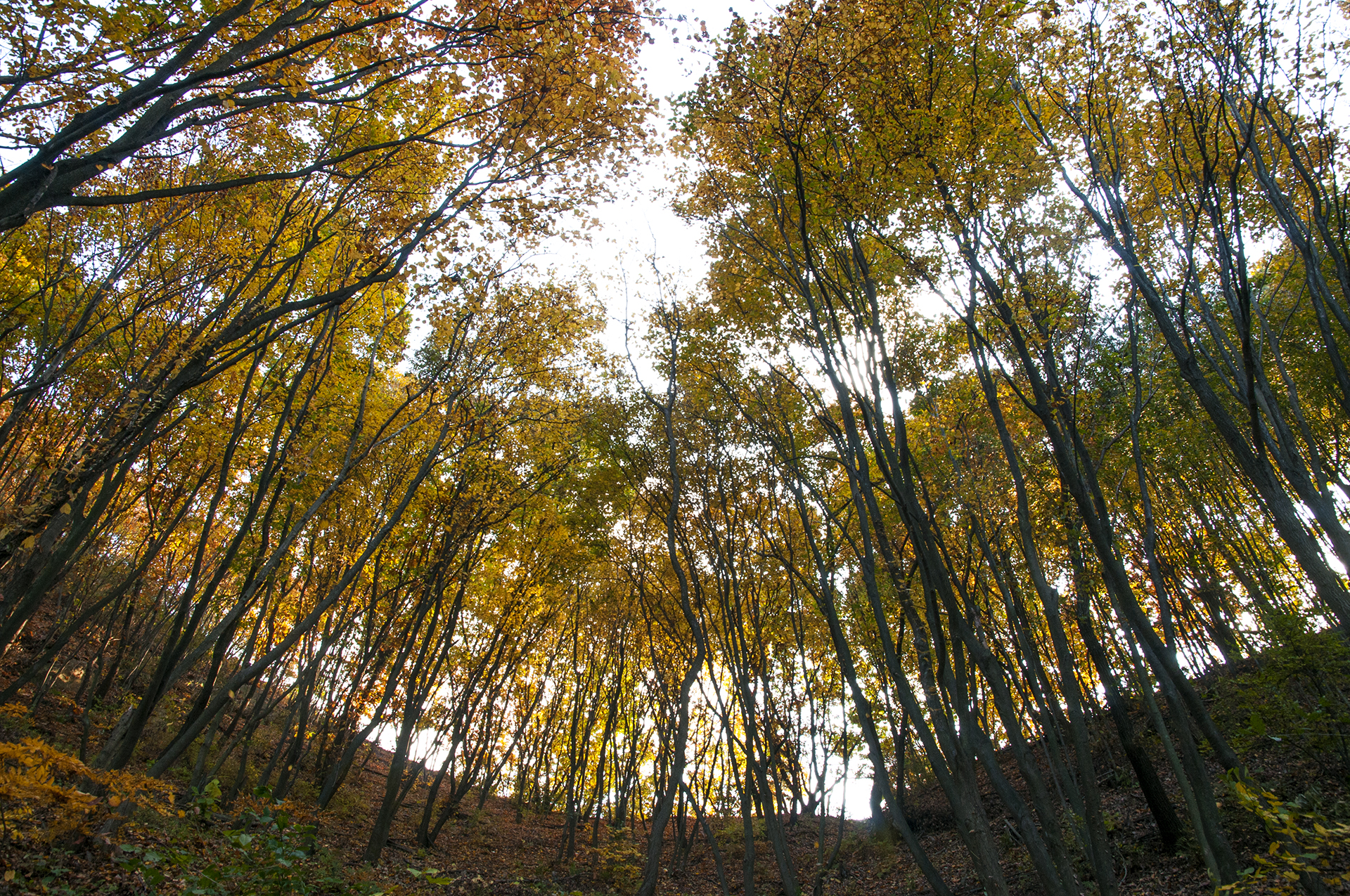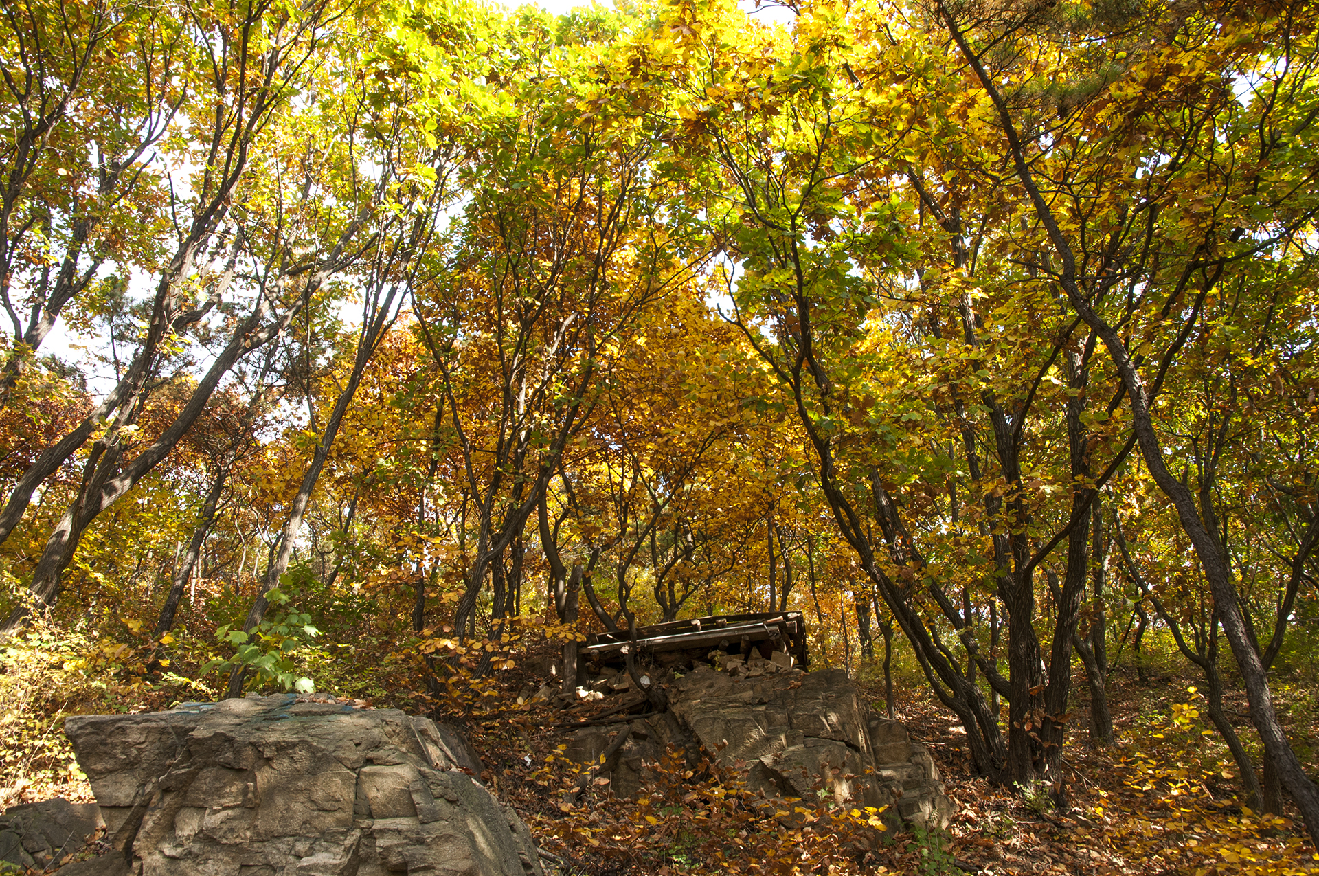 원적정에서 정상으로 가는 길에 올려다본 숲의 단풍, 올해는 나뭇잎 상태가 많이 좋지는 않다.
