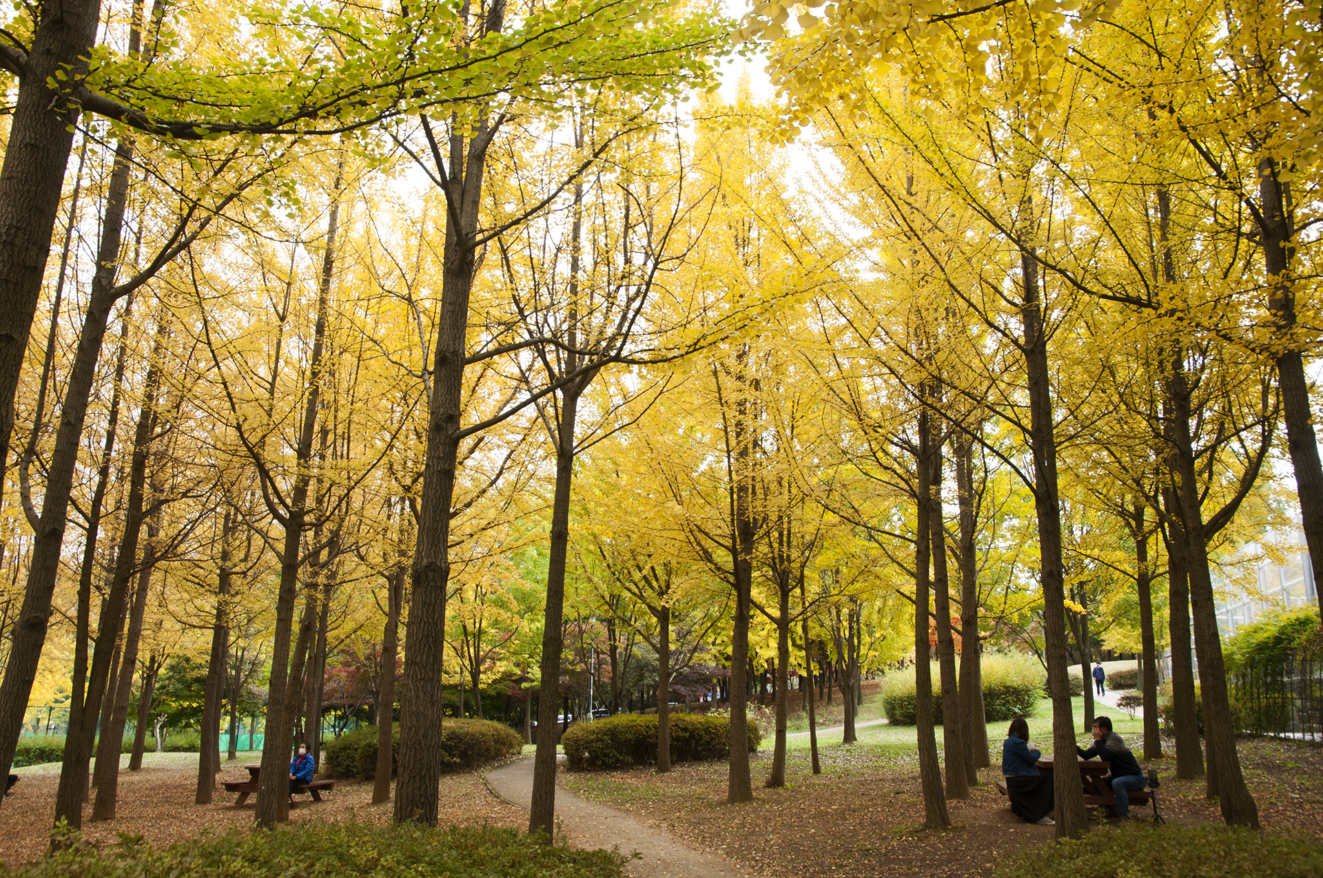 은행나무 사이에 휴식할수 있는 의자와 식탁이 곳곳에 있어 마주앉아 이야기 하기에도 좋다.