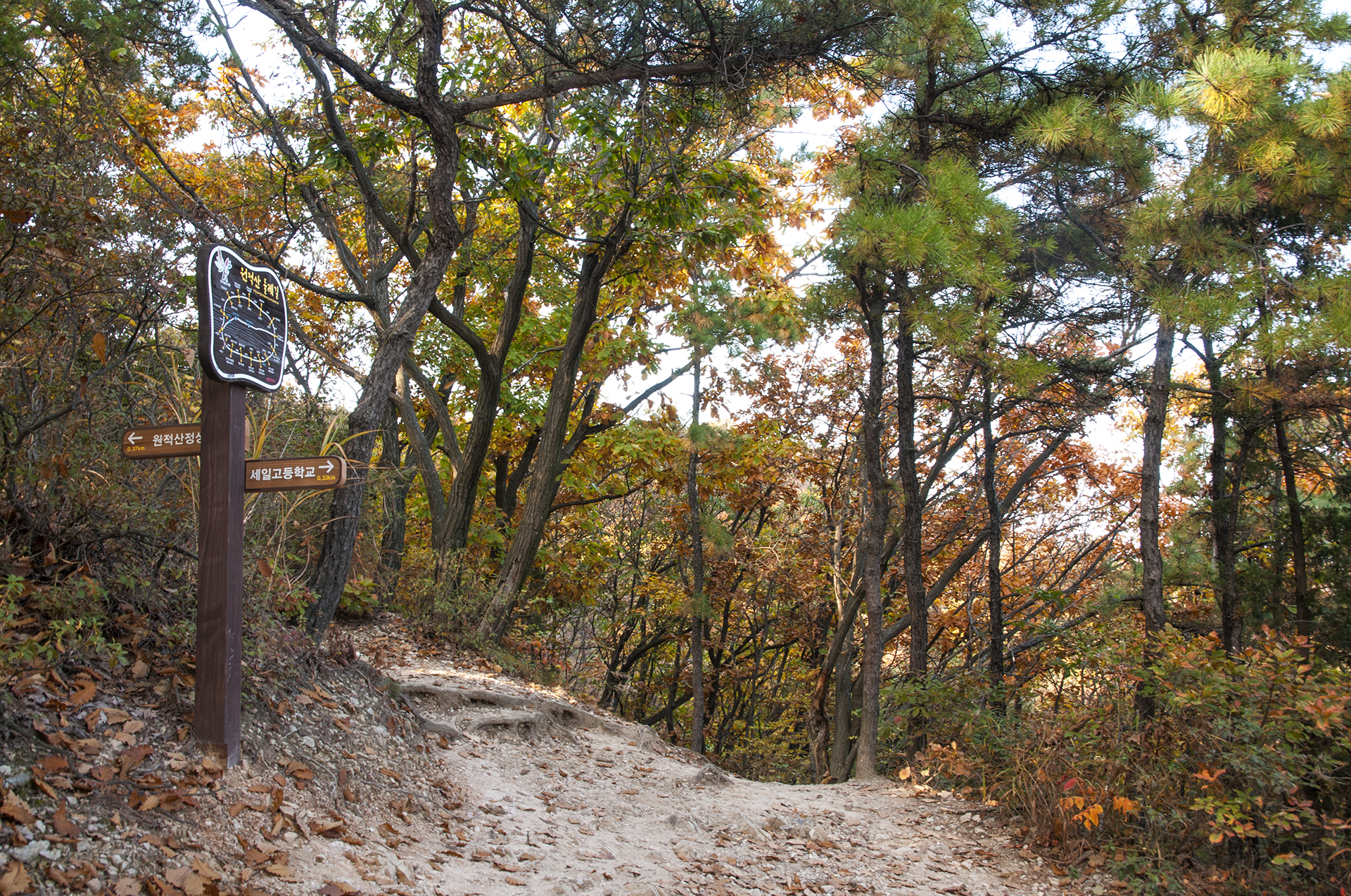 어쩔수없이 이곳에서 원적정으로 올라가 정상까지 간 다음에 세일고 방향으로 넘어가 나머지 둘레길을 돌기로 계획을 변경했다.