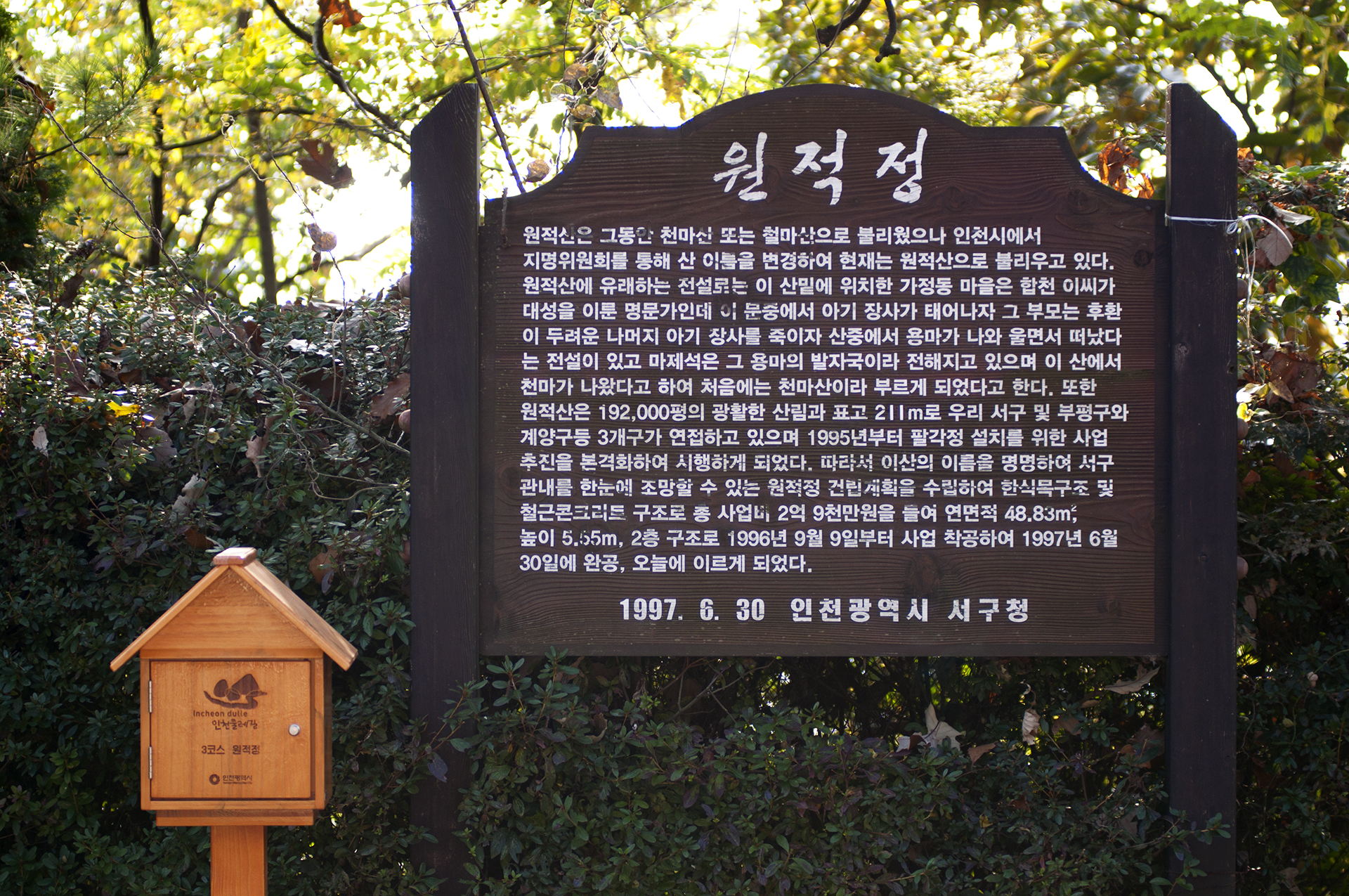 인천둘레길 3코스에 포함된 원적정에 스템프박스가 설치되어 있었다.