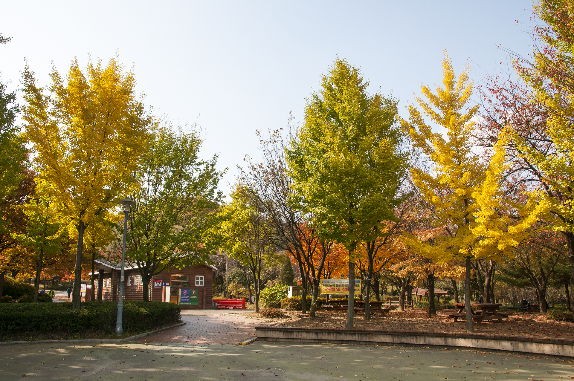 주차후 주차장 뒷편 편의점 & CAFE 로 공원에 진입, 화장실이 있고 노랗게 물든 은행나무에 기대 수치가 올라간다.