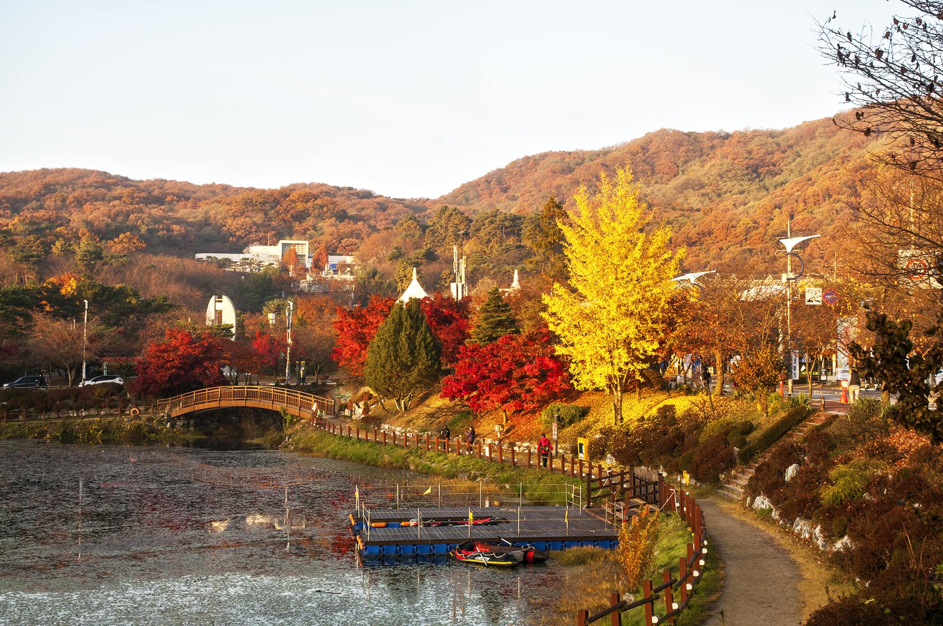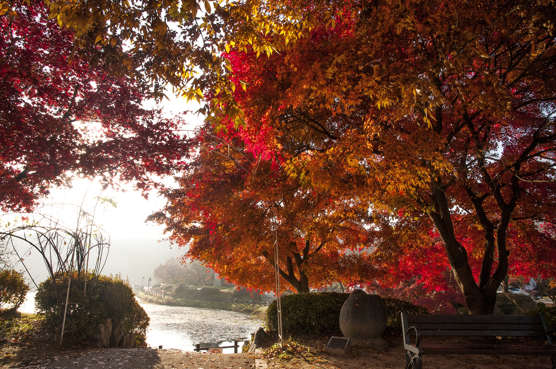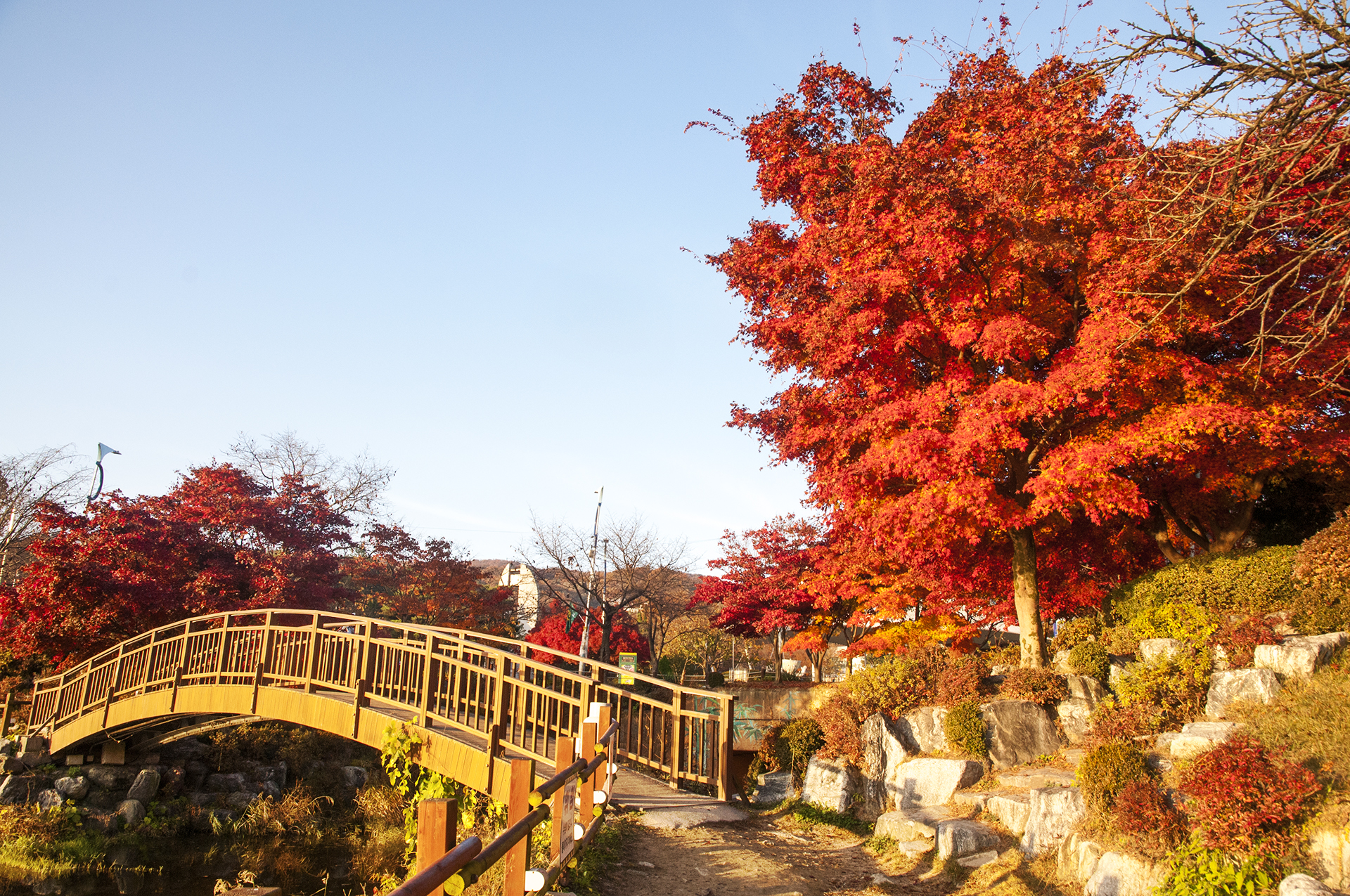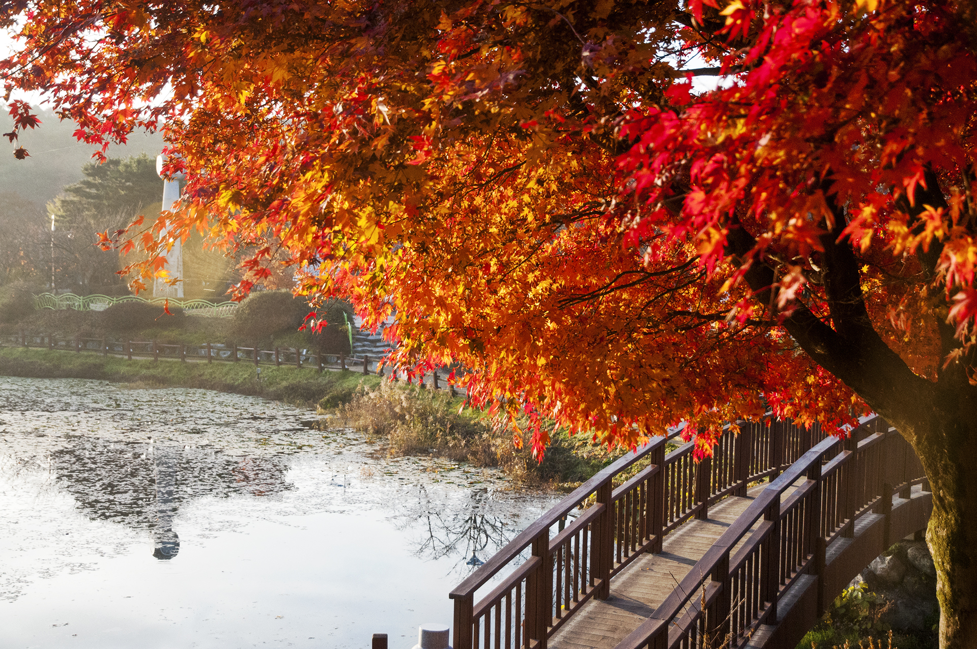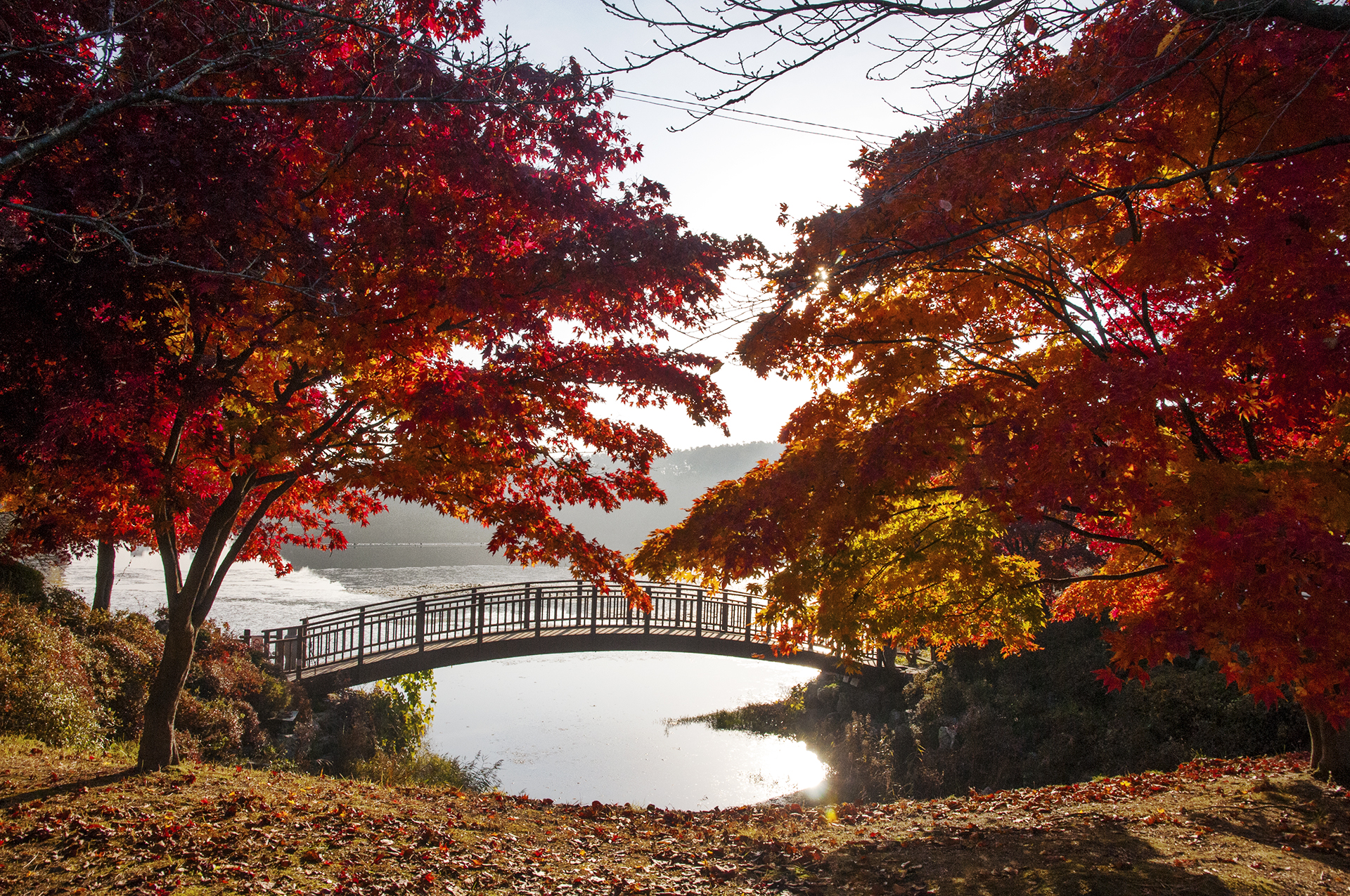 햇빛 묻은 단풍이 다리를 배경으로 멋진 그림을 보여준다.