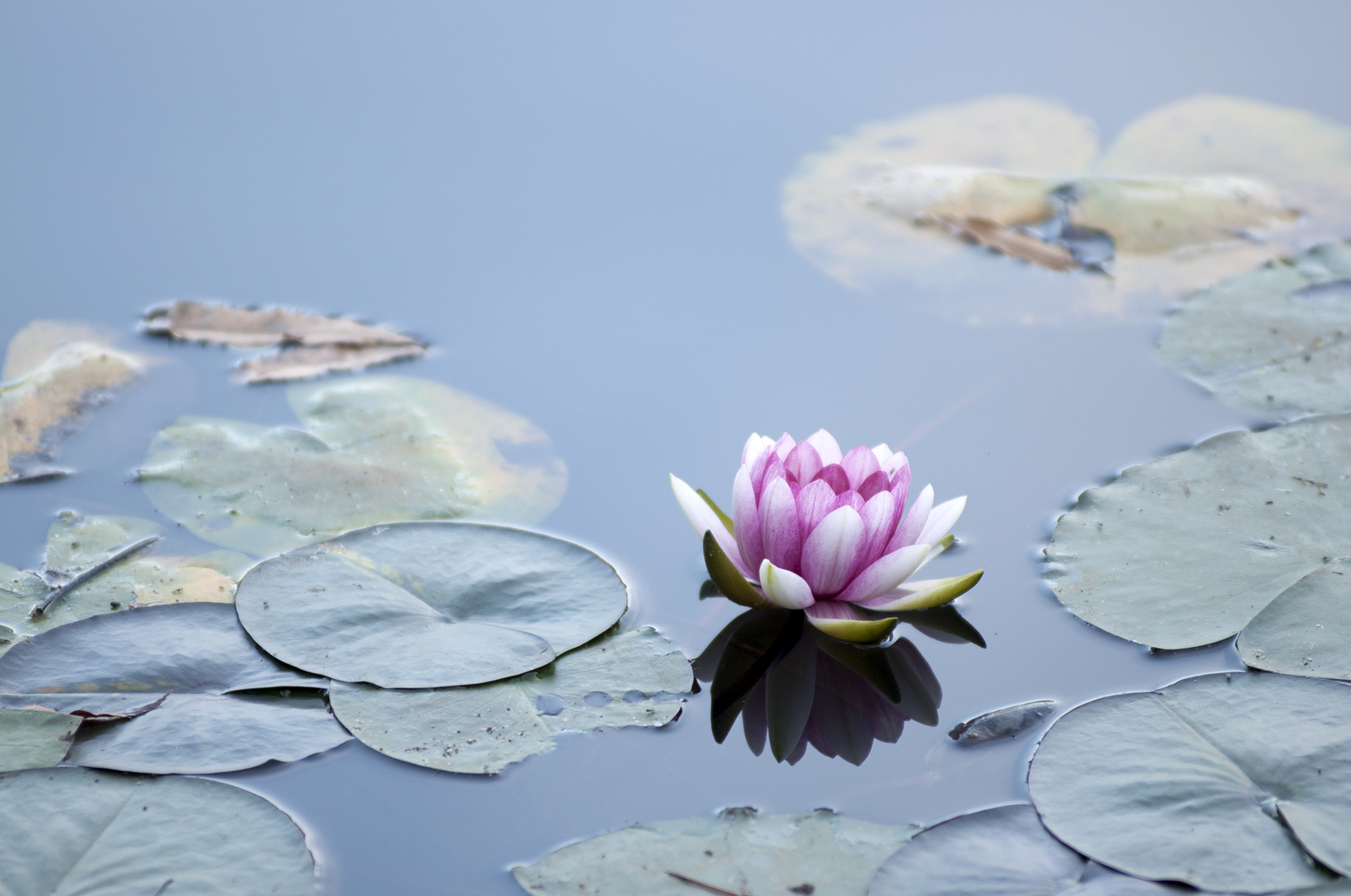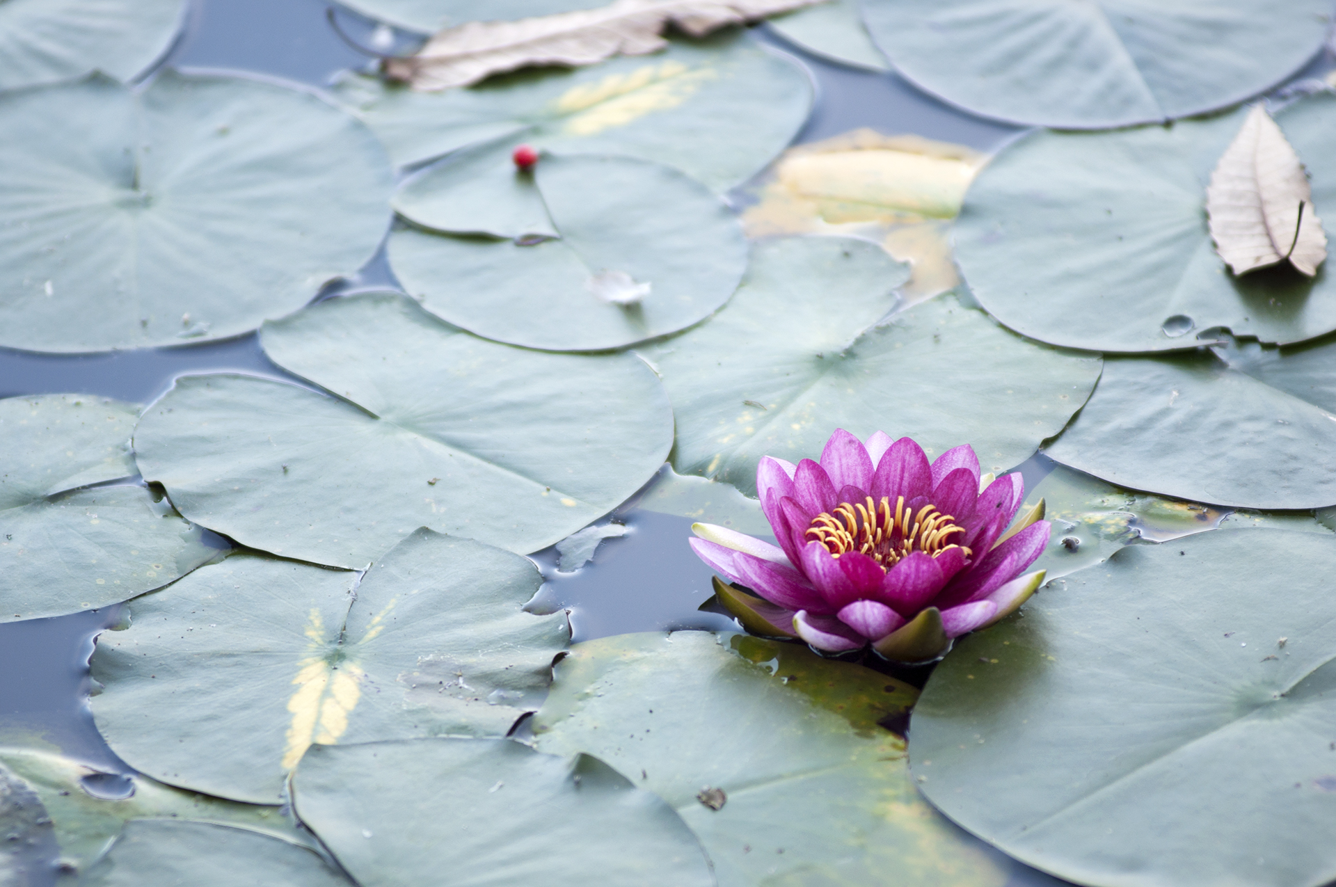 연잎만 가득한 저수지 한쪽에 때늦은 수련이 피었다.