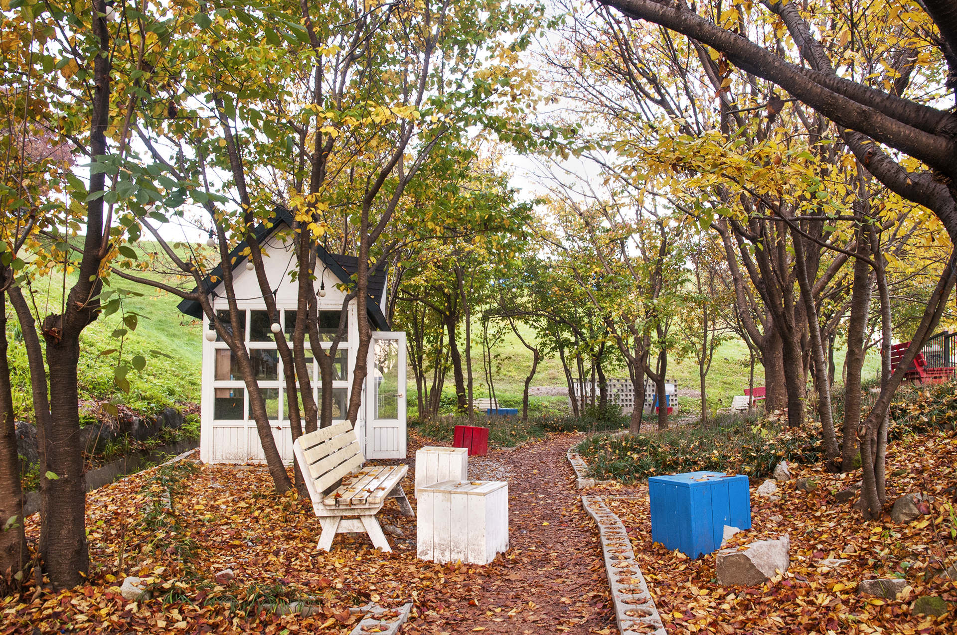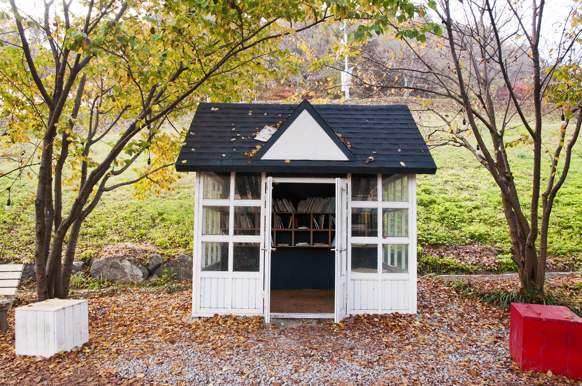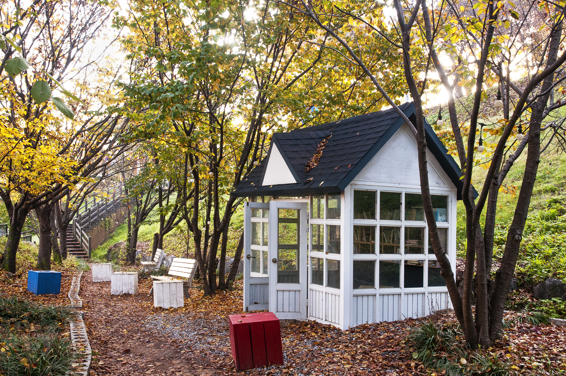 가을 낙엽으로 둘러싸인 힐링도서관, 사각 큐브에 앉아 예쁜사진도 담아보자.
