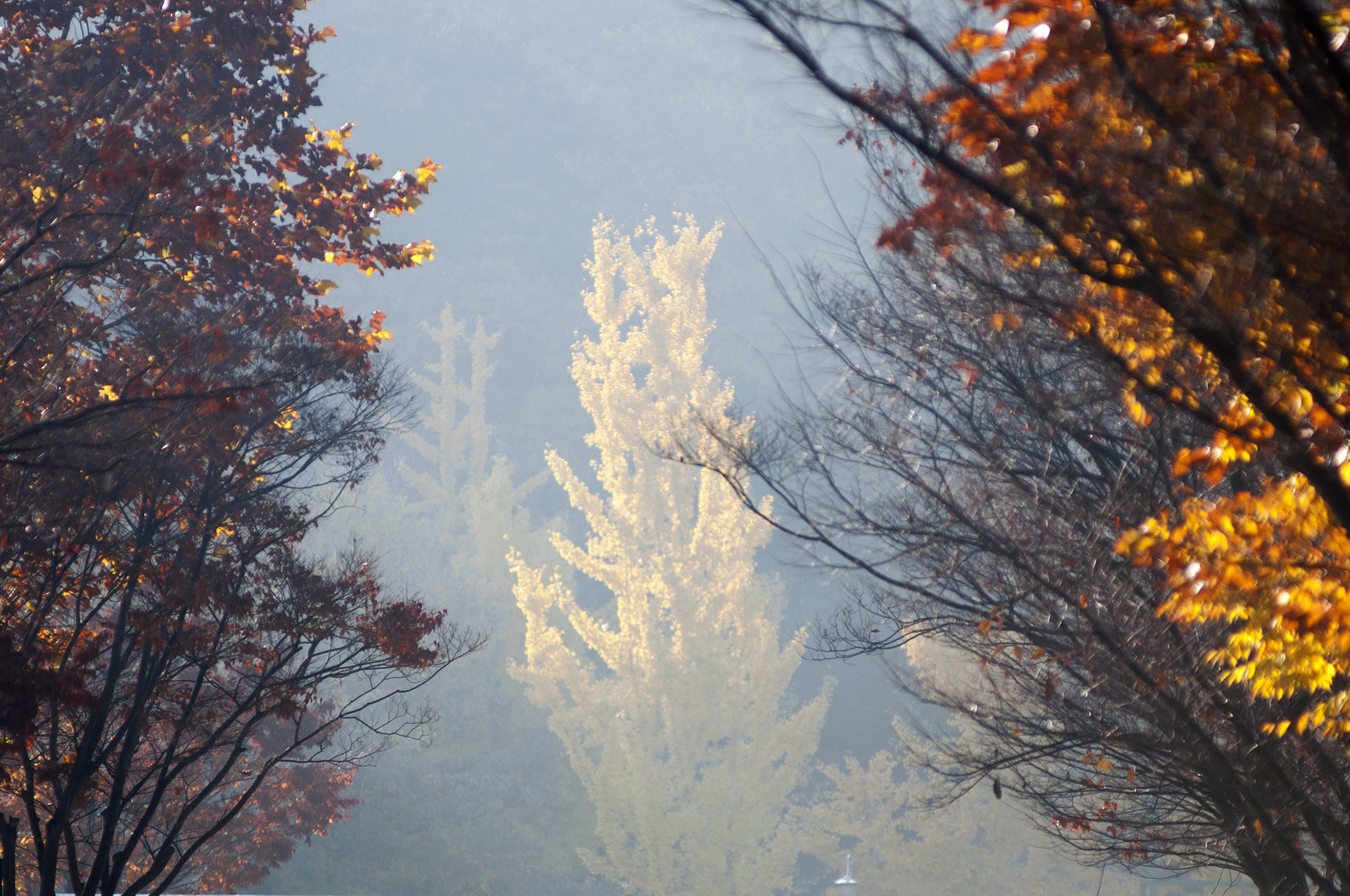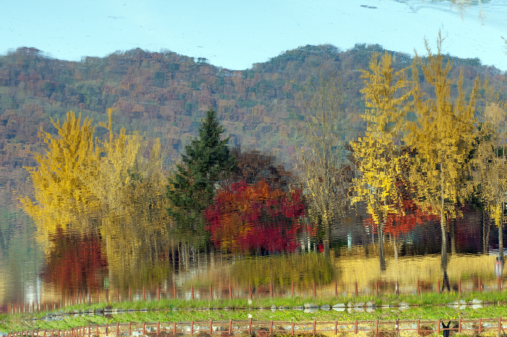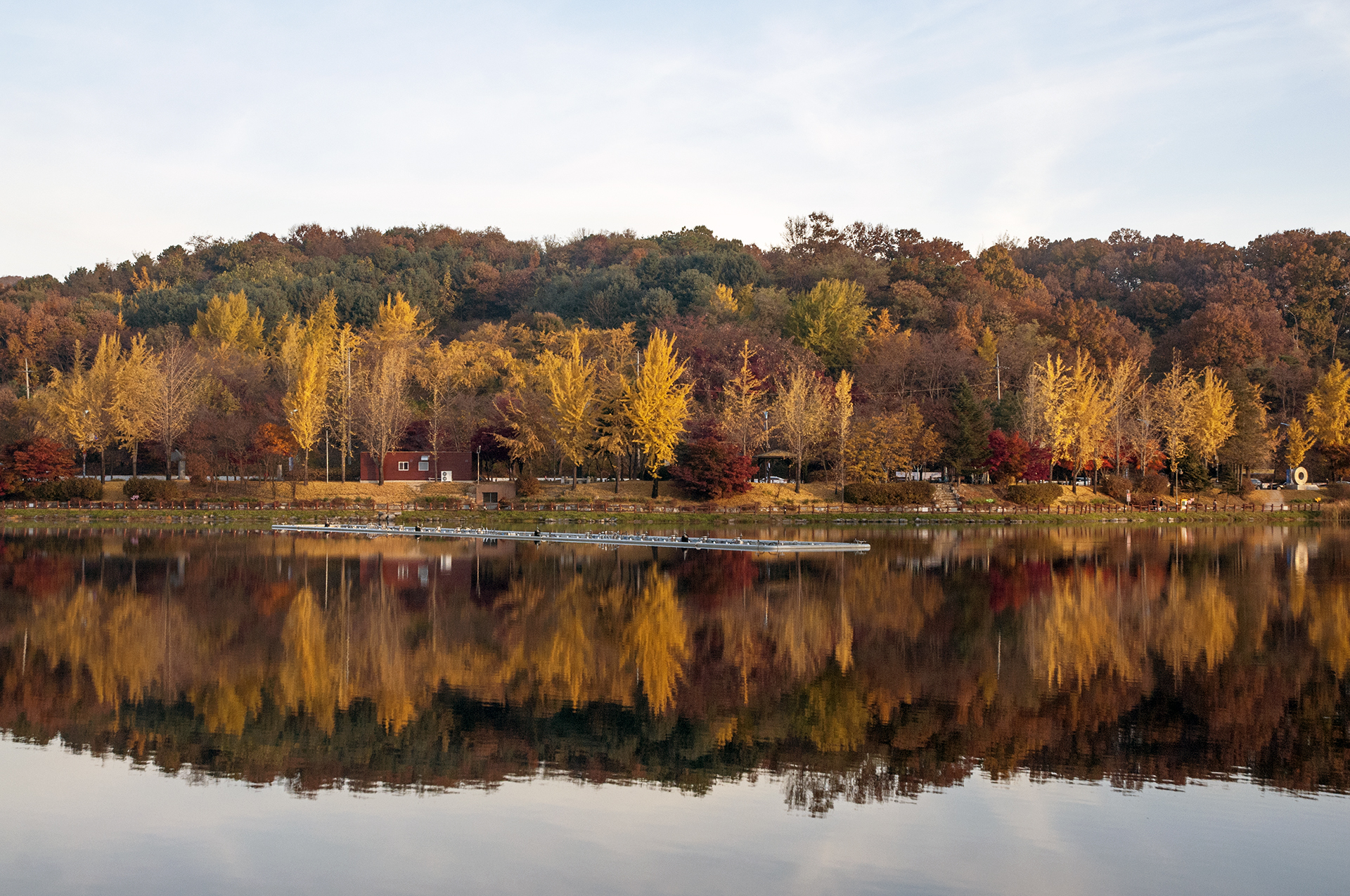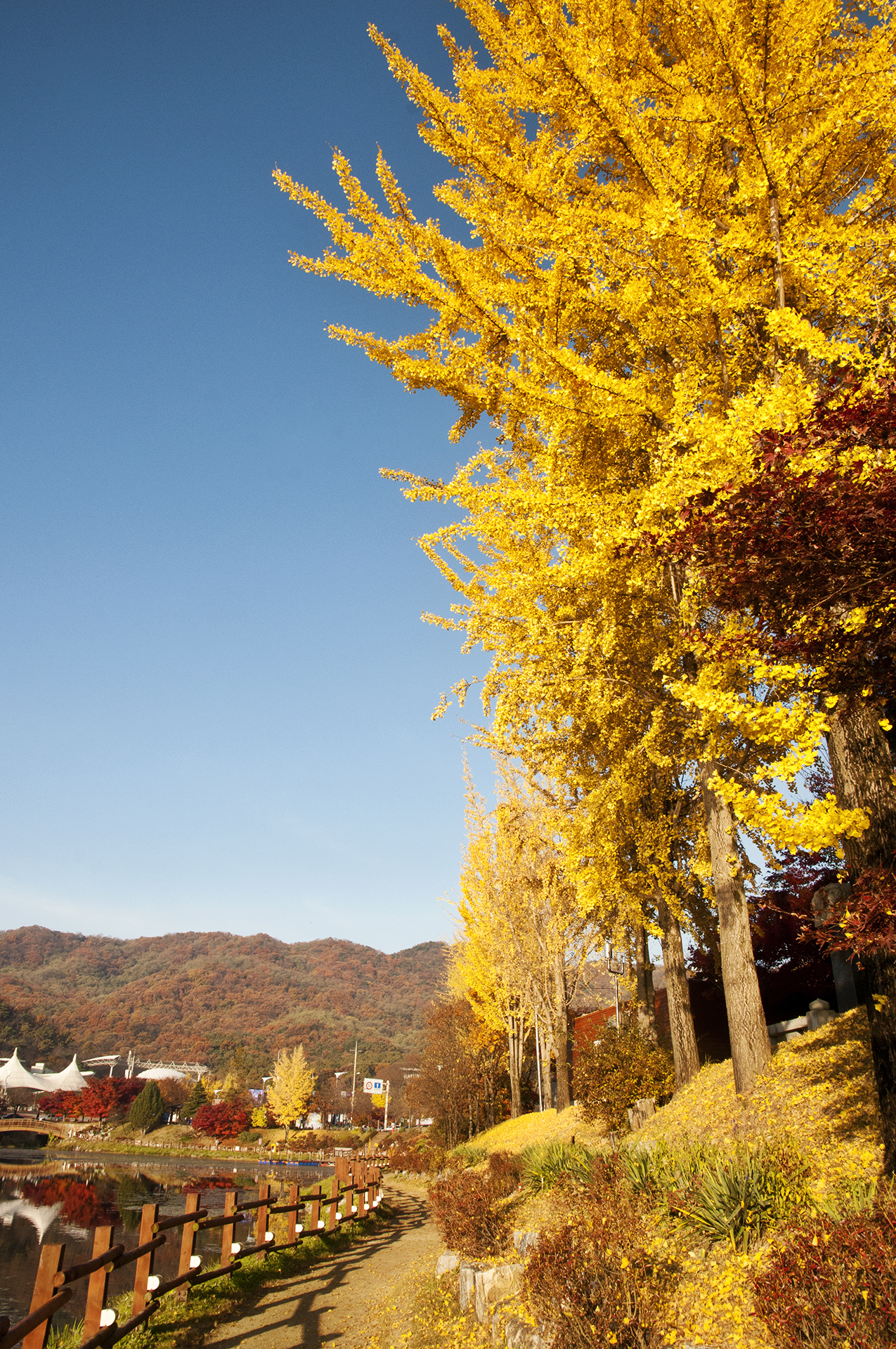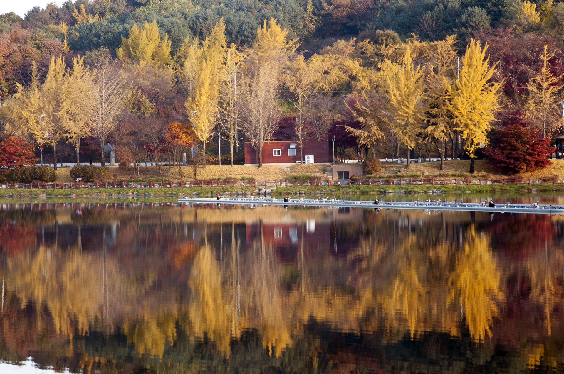 노랗게 물든 은행나무는 이미 많은 잎을 떨구었지만 저수지에 비친 반영만큼은 멋지게 보여준다.