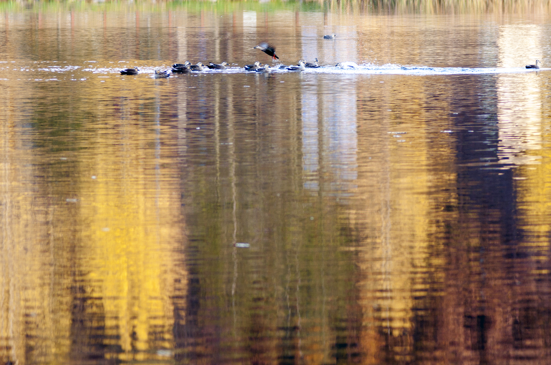 청둥오리떼의 한가로운 가을 아침