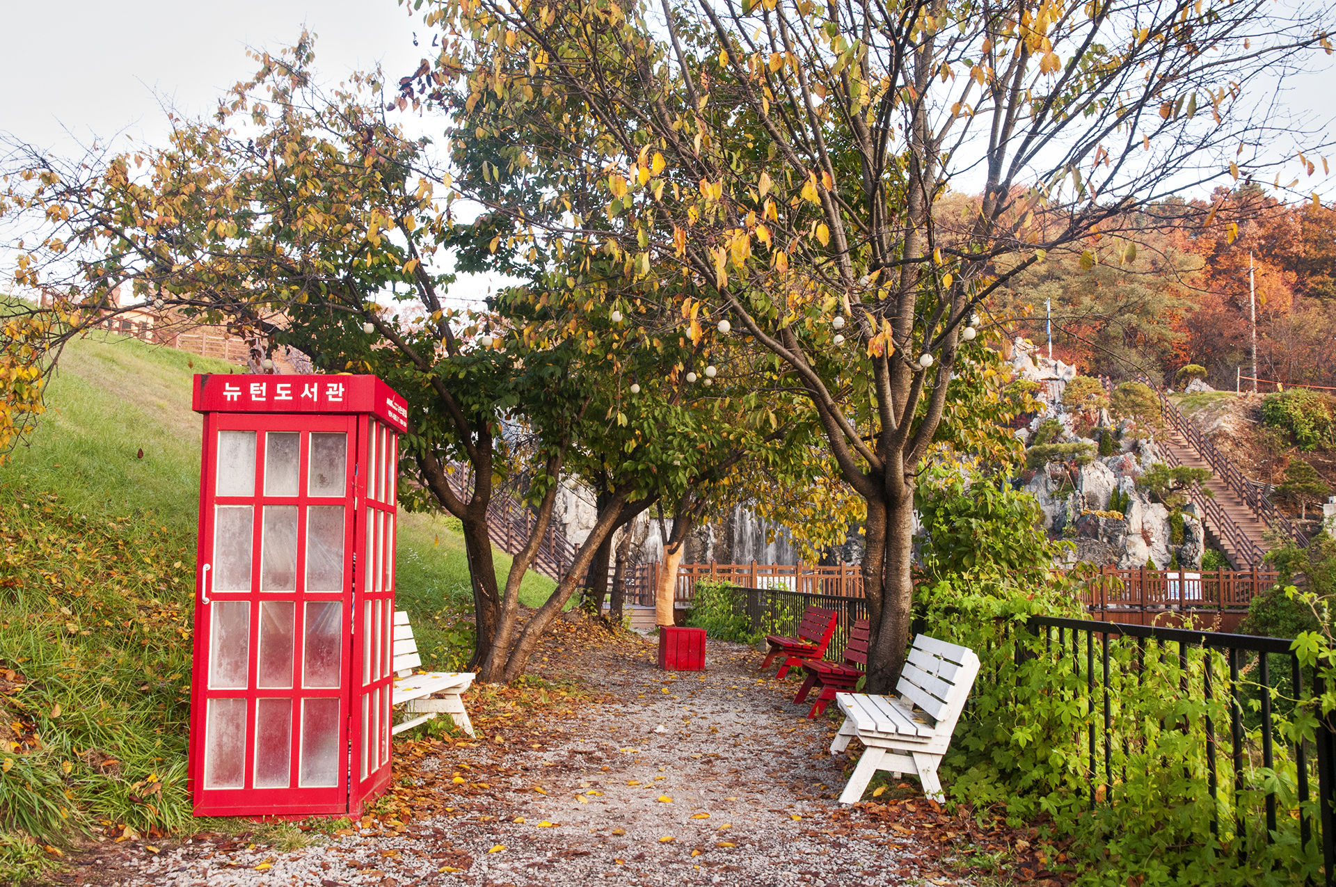 다시 설봉역으로 돌아와 폭포 방향에 있는 뉴턴도서관, 인공폭포로 가는 이 길이 참 예뻤다.