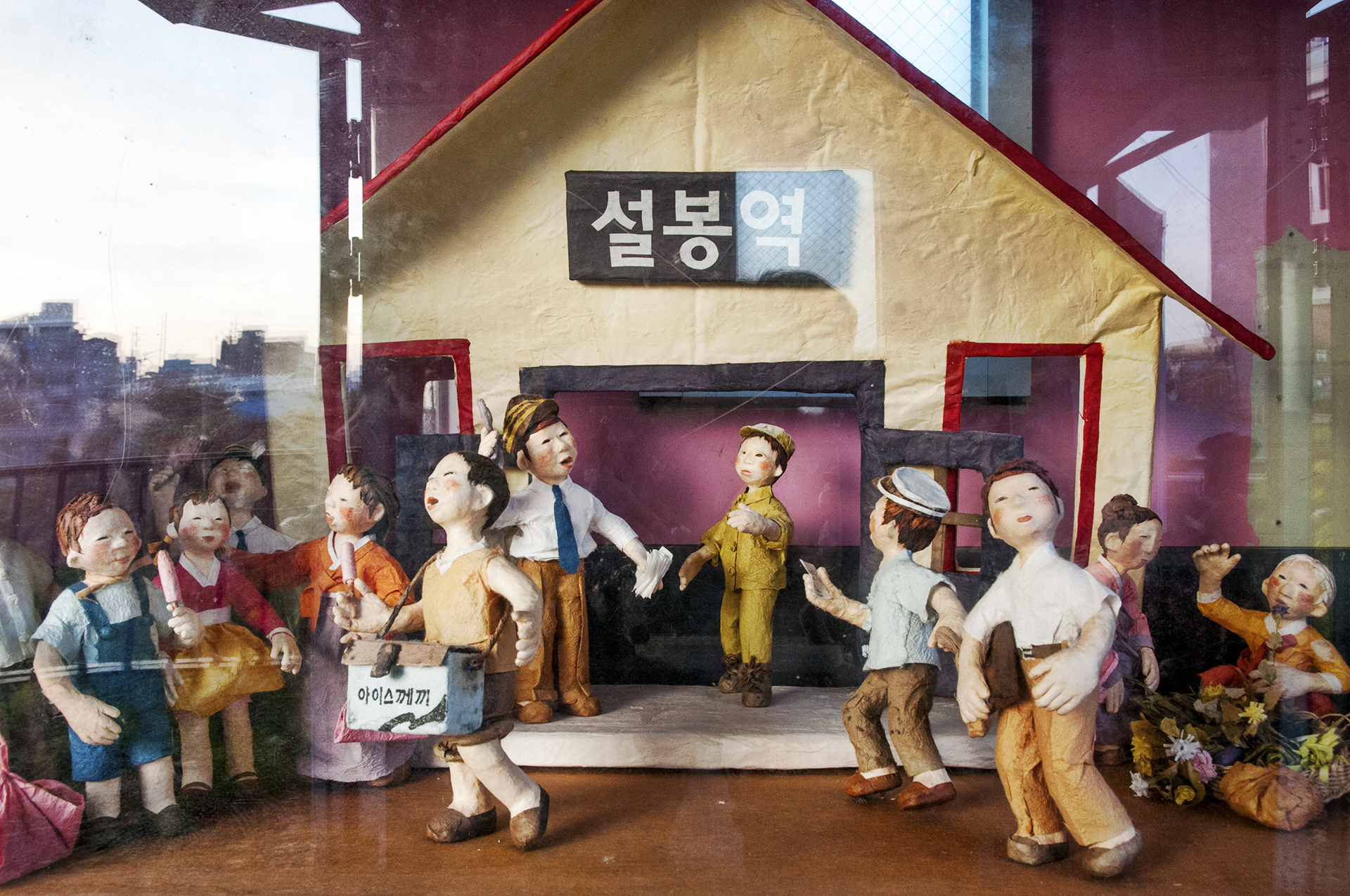 설봉역 내부에 전시되어 있는 닥종이 인형들이 추억의 역전 풍경을 보여주고 있다.