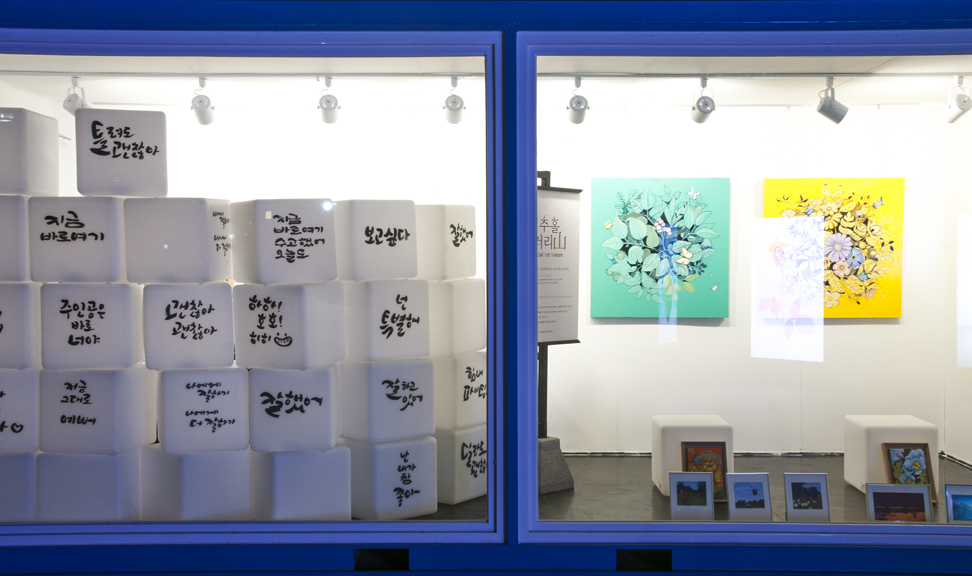 좋은 글귀를 적어놓은 사각큐브 옆으로 작품들이 전시되어 있다.
