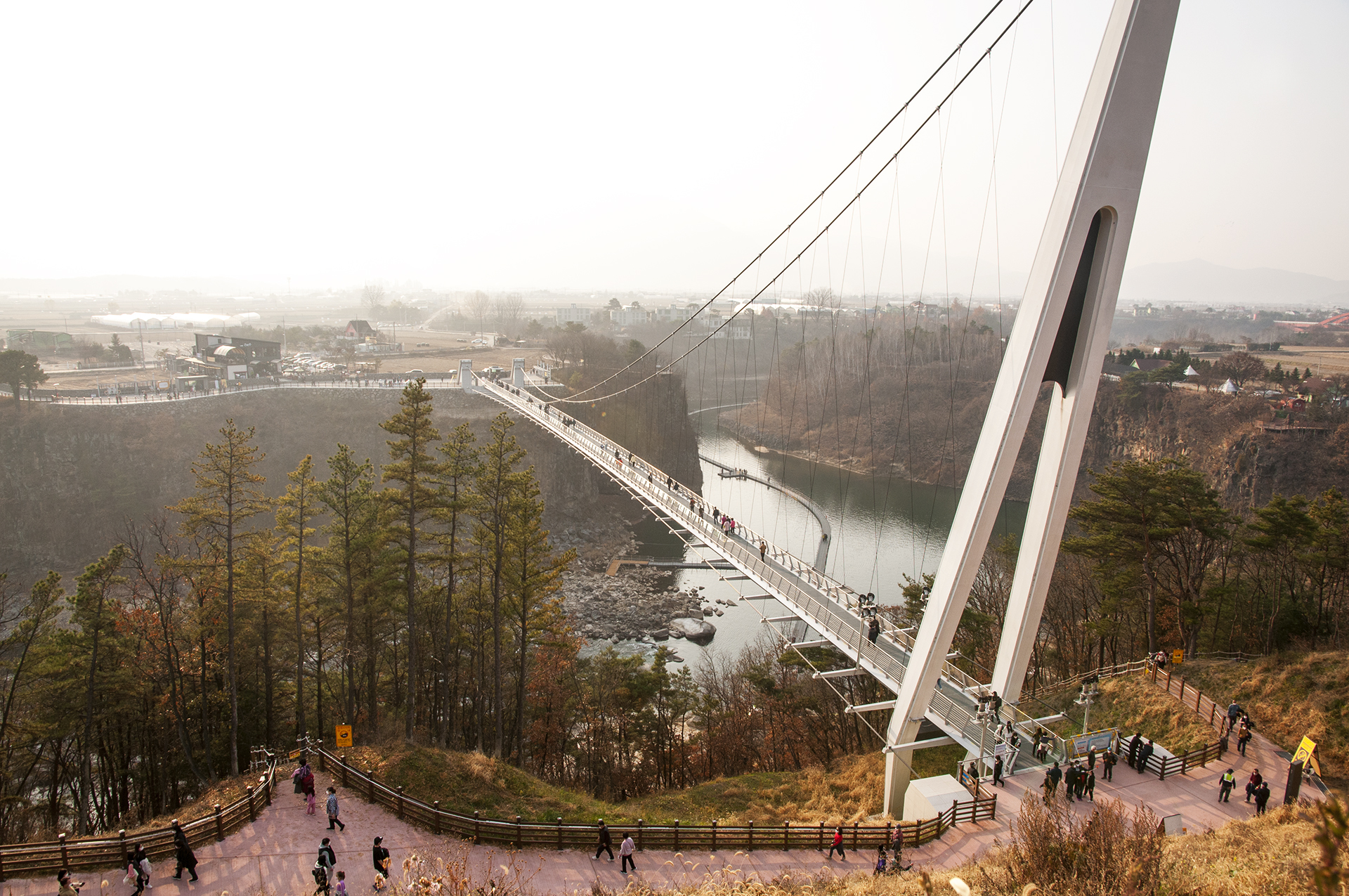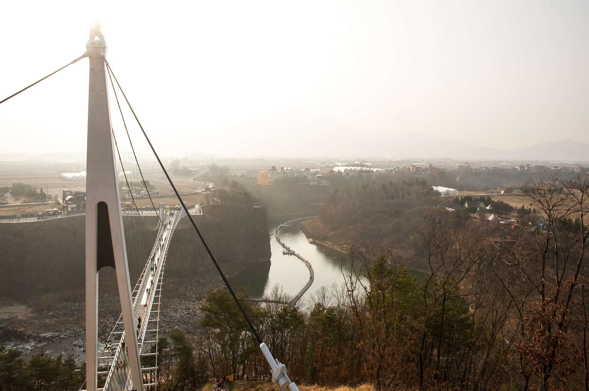 아르고펜션앞 데크길과 포장길을 내려와 바라본 태봉대교, 가운데 번지점프장이 있지만 현재는 운영을 하지 않는다.